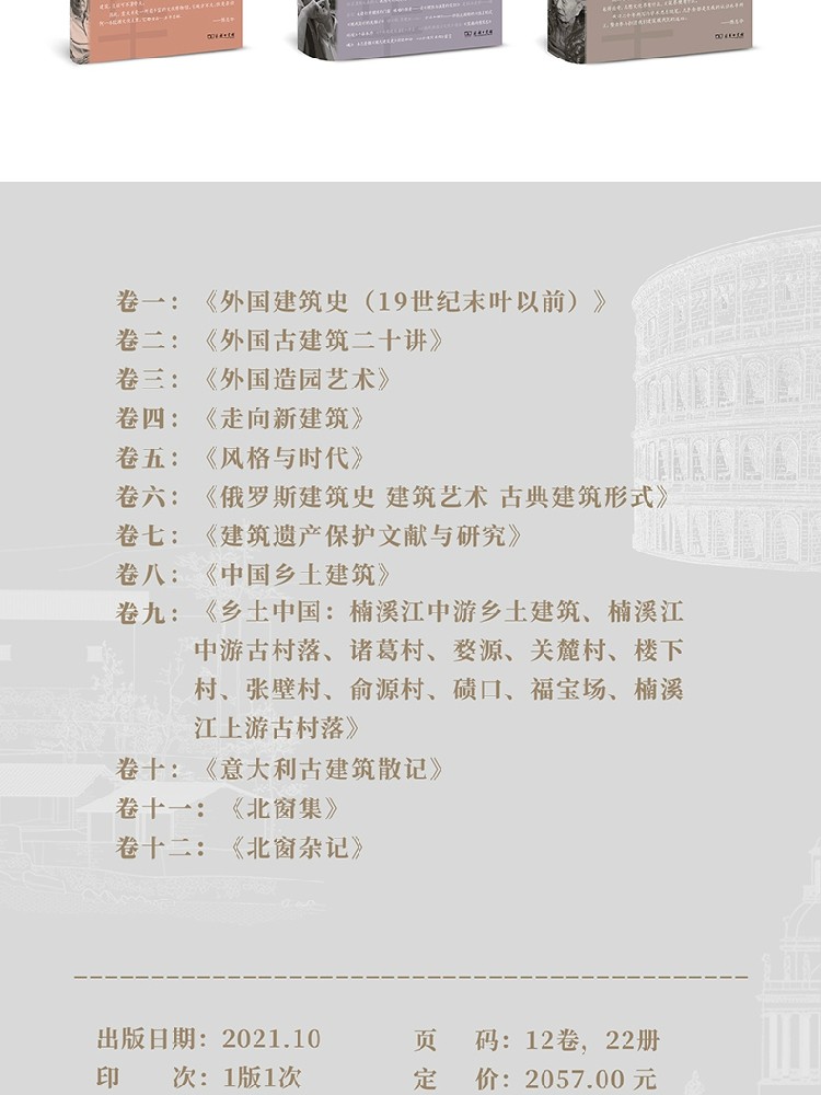 《陈志华文集》收入现在能找到的作者的所有著译述文字,共十二种,七百万字。文集整理编辑历时四年,其中《外国建筑史》《外国古建筑二十讲》《外国造园艺术》《走向新建筑》《风格与时代》《意大利古建筑散记》依旧刊本为底本校核,并有增补;《俄罗斯建筑史 建筑艺术 古典建筑形式》《建筑遗产保护文献与研究》《中国乡土建筑》《乡土中国:楠溪江中游乡土建筑、楠溪江中游古村落、诸葛村、婺源、关麓村、楼下村、张壁村、俞源村、碛口、福宝场、楠溪江上游古村落》《北窗集》《北窗杂记》乃新辑成册,编校勘误。其中既有我国第一部系统撰述、屡次修订,至今仍被广泛使用与阅读的外国建筑史通史著作,1950年代及其后系统译介英、法、俄重要建筑学与艺术思潮的理论著作,又有前后五十余年作者的研究论文和学术思想评论文字,是了解与研究相关领域的重要文献,也足以成为后人研究20世纪中、后期学术、文化、社会的重要资料。