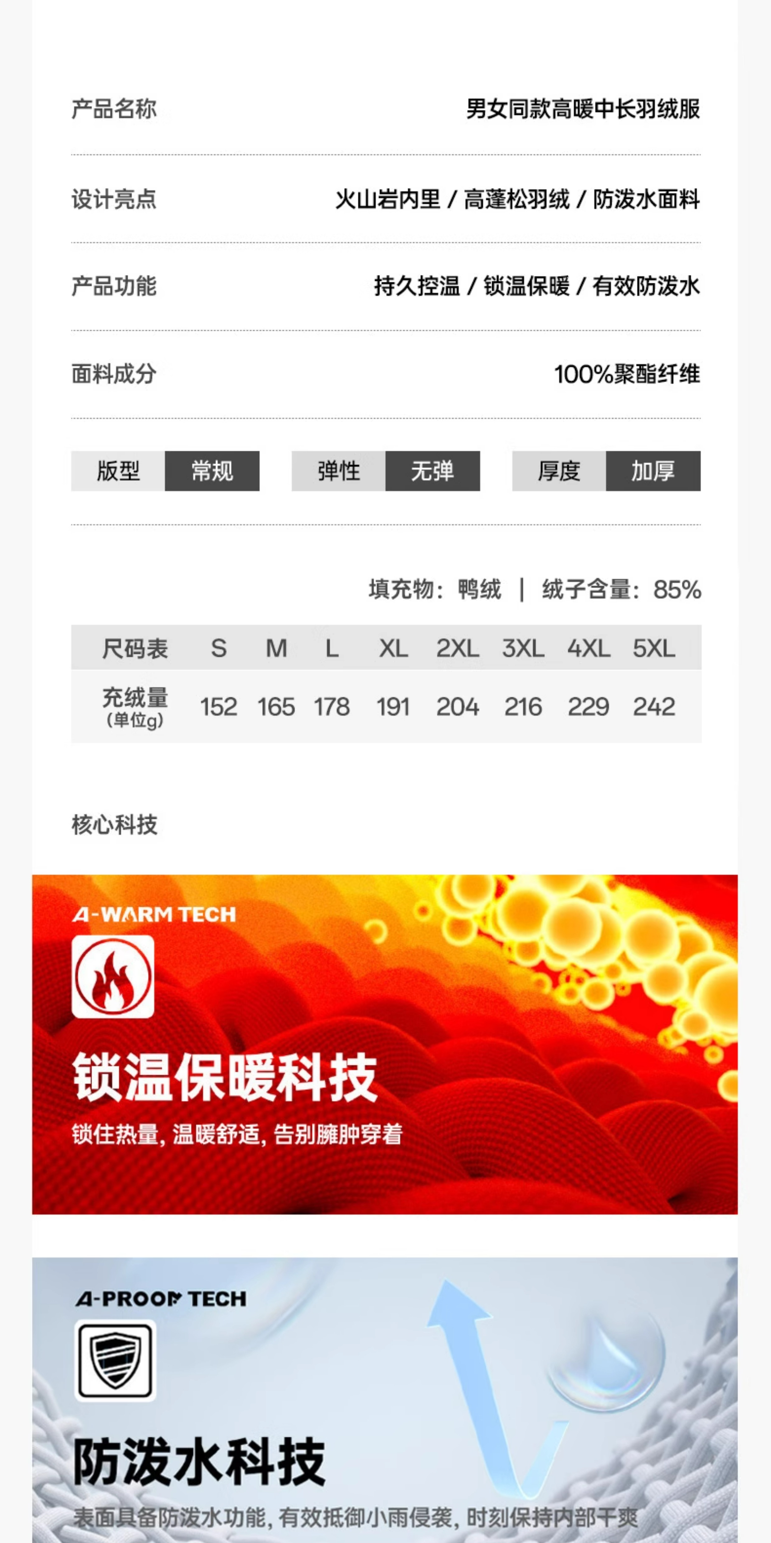 超级安踏中长羽绒服男女同款秋冬防泼水火山岩六度芯保暖外套172546903U