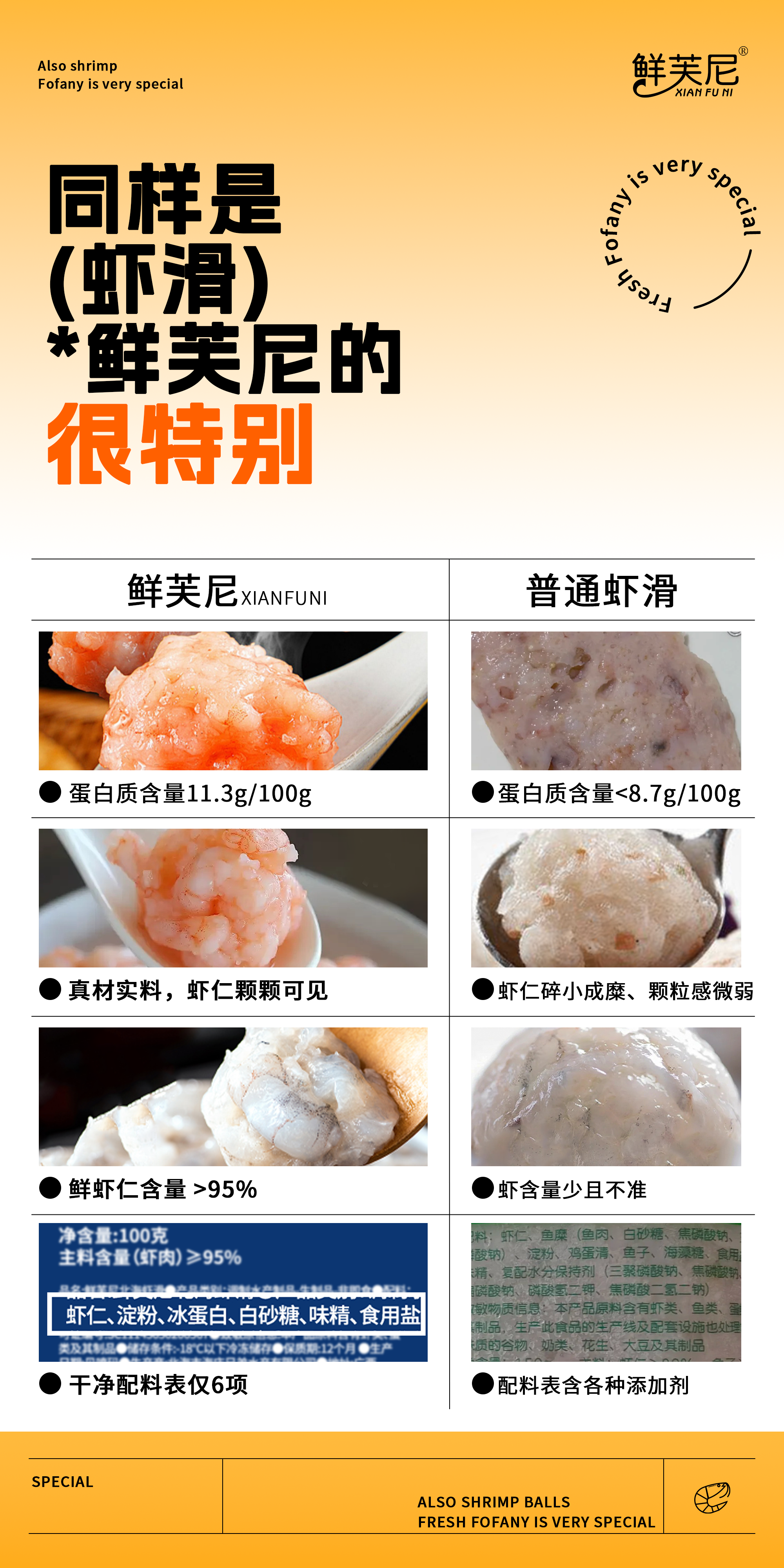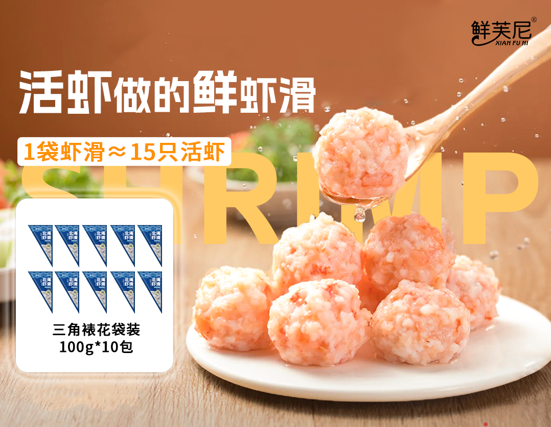 鲜芙尼虾滑 虾肉含量达到95%以上,每袋都有新鲜大虾仁