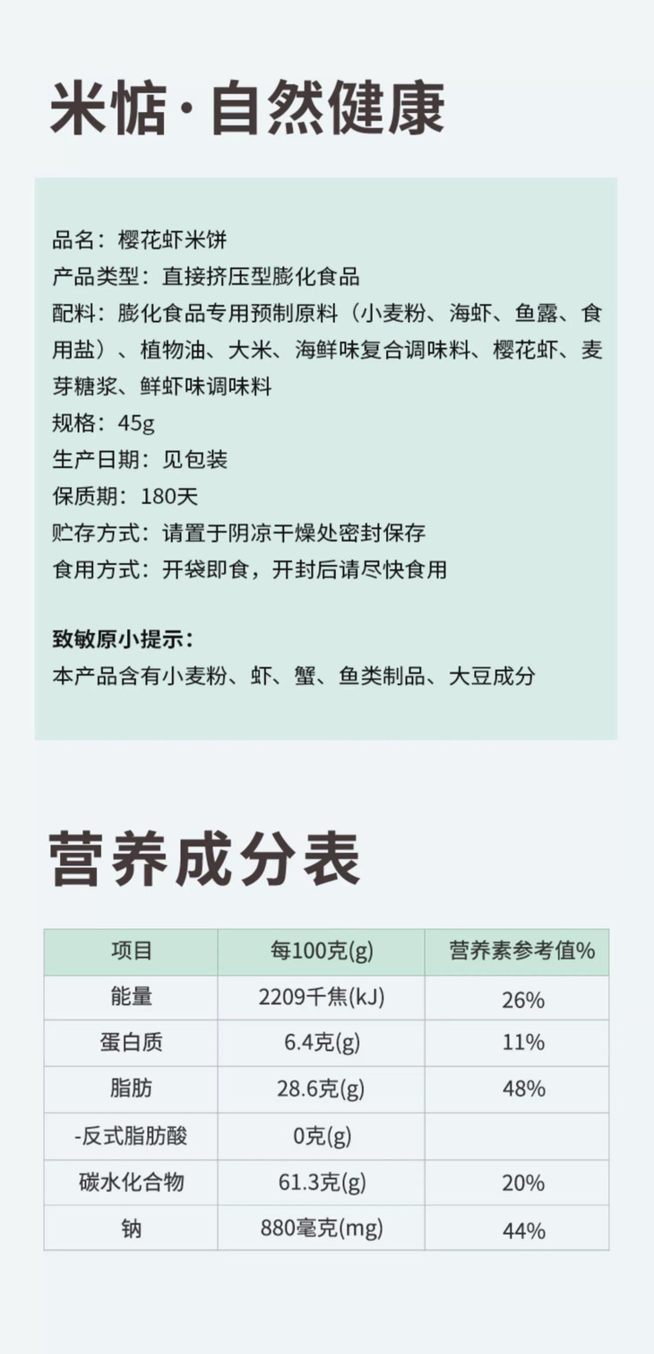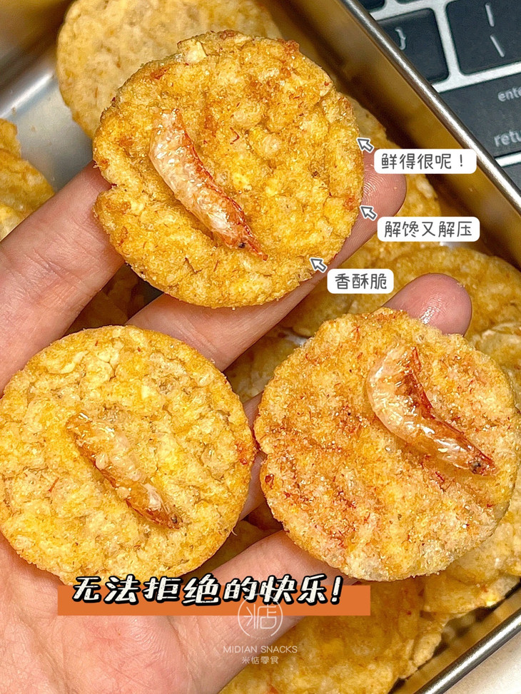 【米惦樱花虾米饼】比虾条更鲜酥的米饼裹着鲜虾味,咔吱咔吱嘴巴的快乐,一口一个嘎嘣脆! 🦐5%海虾肉,加入整只脆脆的樱花虾! 🦐鲜香酥脆,虾香四溢,入口即化!