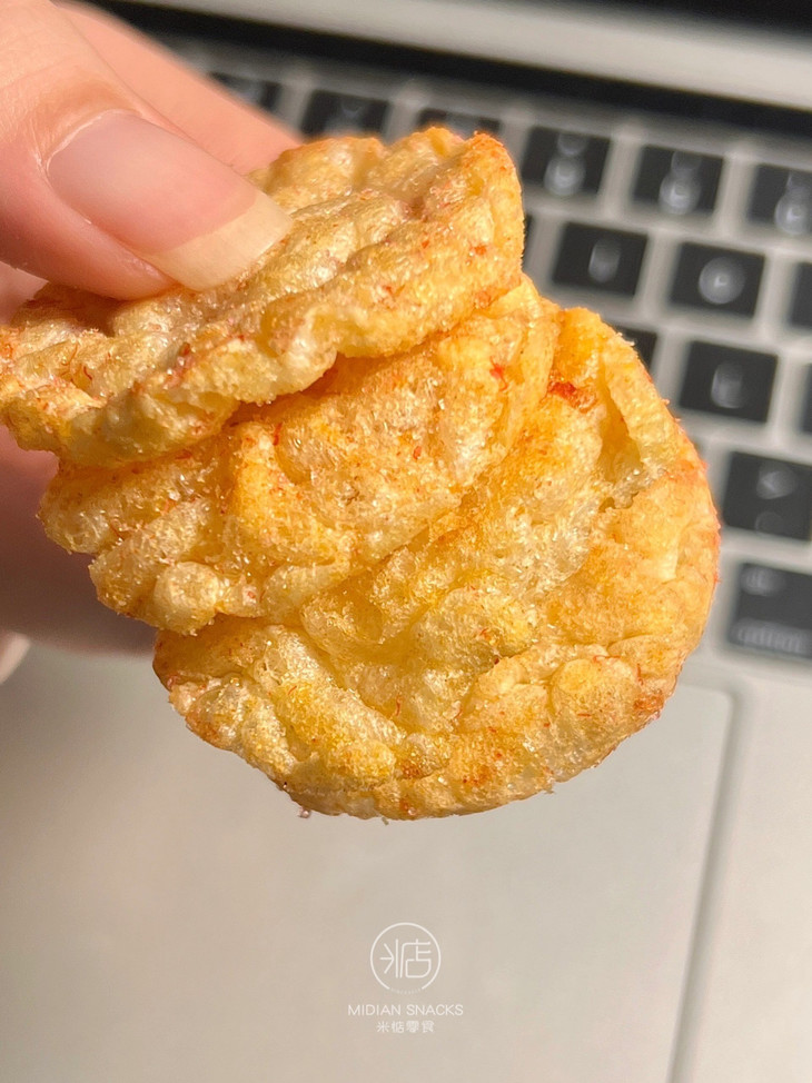 🟠一块圆圆的小脆饼 蓬松轻盈就像夏天日晴空中出现的团团云朵, 不是硬脆的口感,而是酥松的,香脆的, ✔️入口微微辣,咸中带甜, 即刻又化为浓郁的鲜味,解压,轻松,美好
