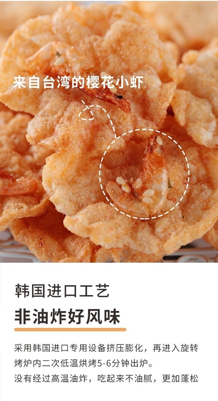非油炸 更健康‼️ 很多传统的虾片采用传统油炸工艺, 而这款米饼则是非油炸制作! 采用韩国进口设备,挤压式膨化工艺,👍 通过两次烘烤,也能使得米饼保持酥脆口感, 吃起来不油腻,热量减少了,蓬松感增加。