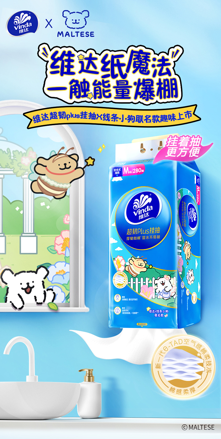 维达(Vinda)抽纸 超韧Plus挂抽3层280抽×4提M码 线条小狗 悬挂式纸巾整箱