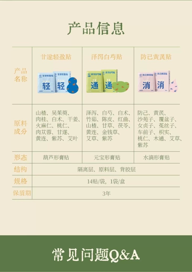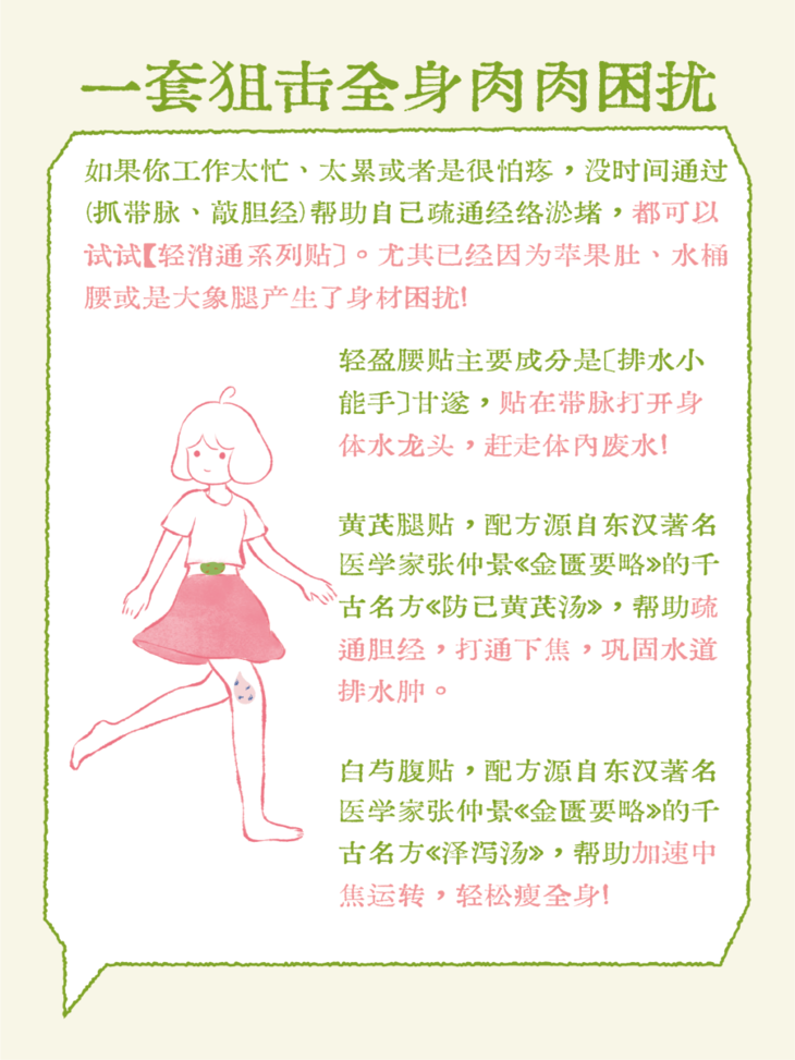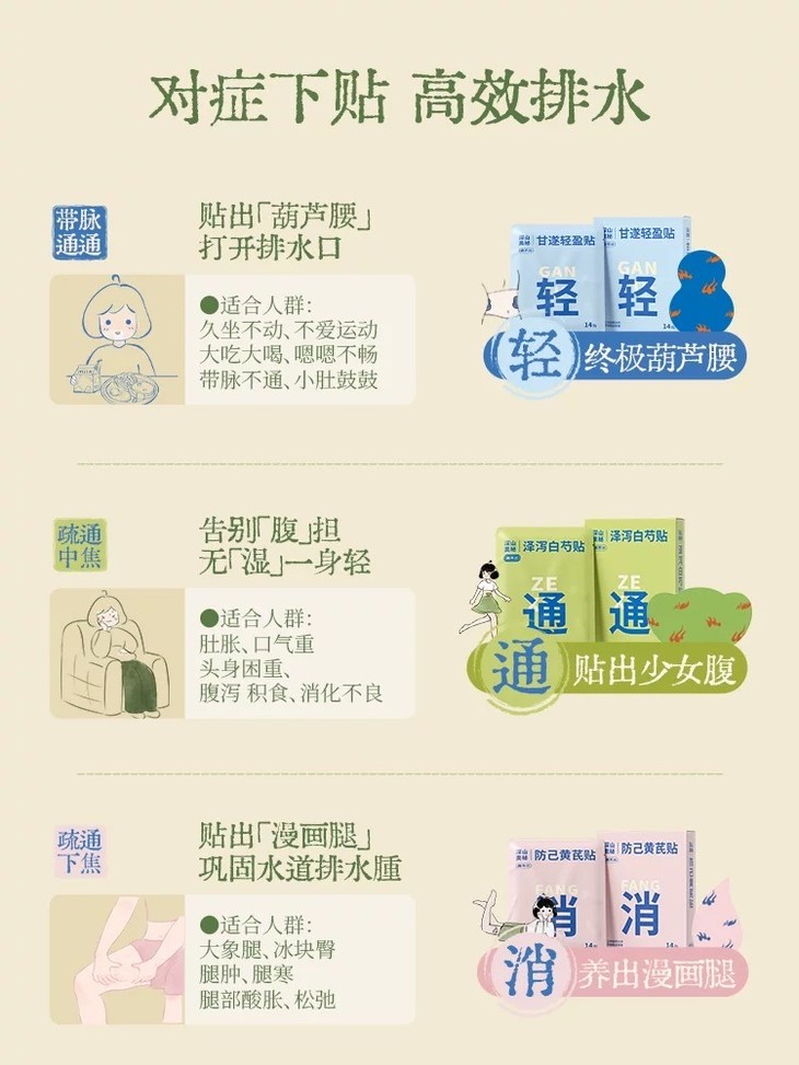 三款针对不同部位,不同效用❗ 1️⃣轻•甘遂轻盈贴,帮助我们健脾祛湿瘦腰腹,拜拜游泳圈。 2️⃣通•泽泻白芍贴,加速新陈代谢,通肠通焦清便消肚,贴出平坦腹部。 3️⃣消•防己黄芪贴,既可排水利湿瘦,又能消除多余赘肉。