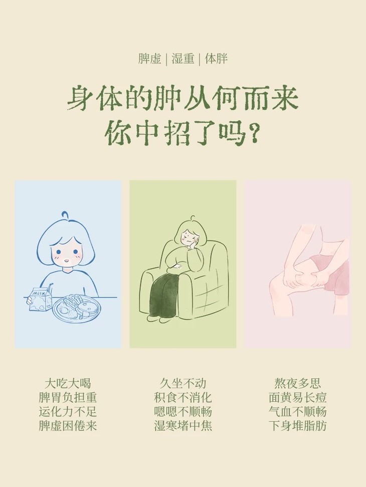 大家有没有发现春天一到, 特别容易腹部长肉肉、下肢水肿❗ 其实是由于春季雨水多💦,肝郁脾虚 外湿+内湿,无法运作的水分堆积在中焦、下肢。 《黄帝内经》言“春三月,此谓发陈” 意思是冬季阳气不足,春天更容易导致“阳虚水肿”