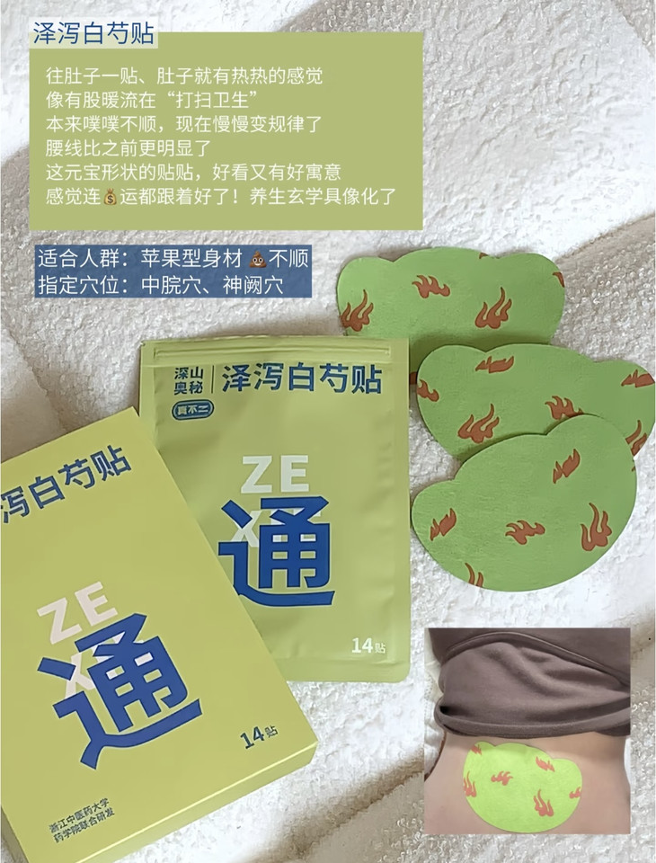 🟢 泽泻白芍贴|千年古方『泽泻汤』 ✅ 源自东汉著名医学家张仲景《金匮要略》“心下有支饮,其人苦冒眩,泽泻汤主之。”肠胃通、瘦小腹。 适合人群:积食、脾胃运化功能差、肚胀、消化不良、易胀气! 贴于中脘穴、神阙穴,双管齐下通脾胃,化浊降脂!