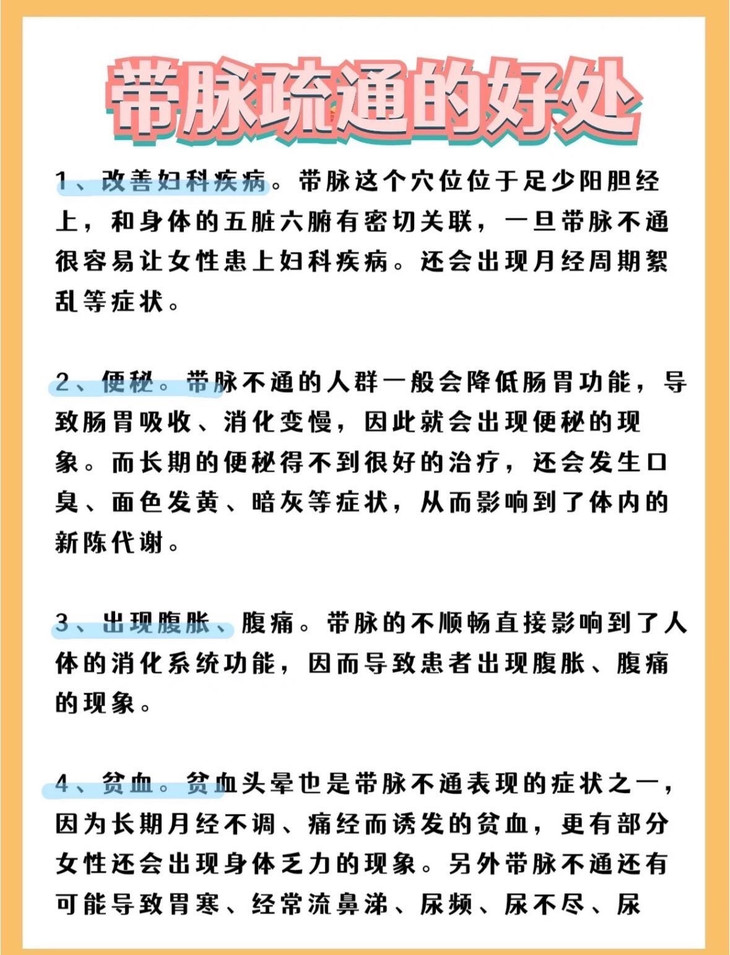 带脉是人体重要的穴位,尤其是女生❗ 🔸妇科病🔸便秘🔸腹胀🔸贫血 很多都和带脉不通畅有关系❗