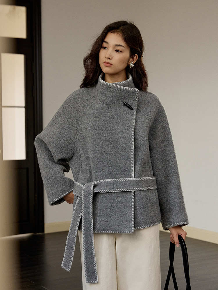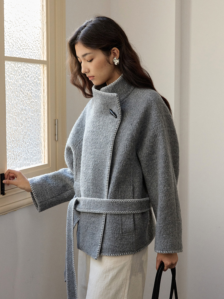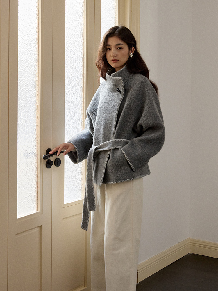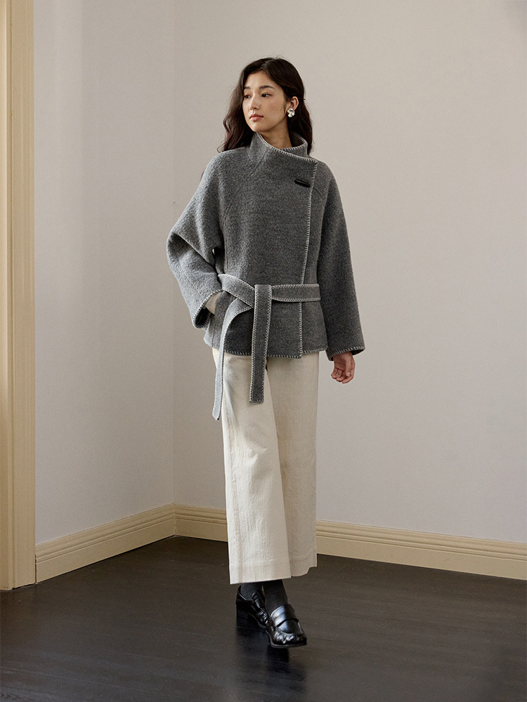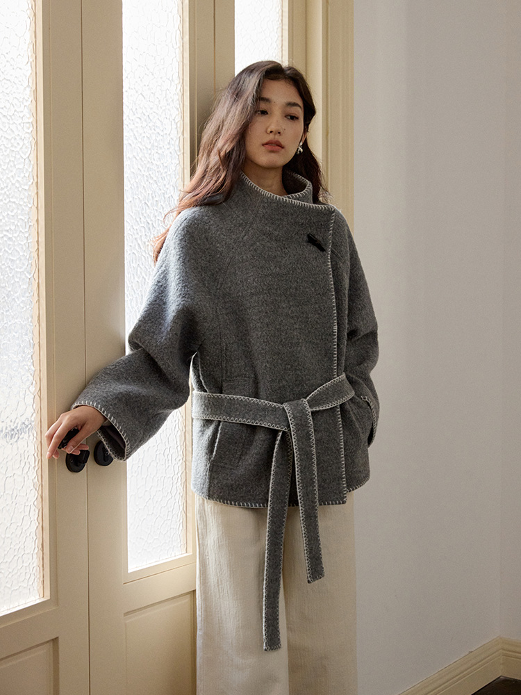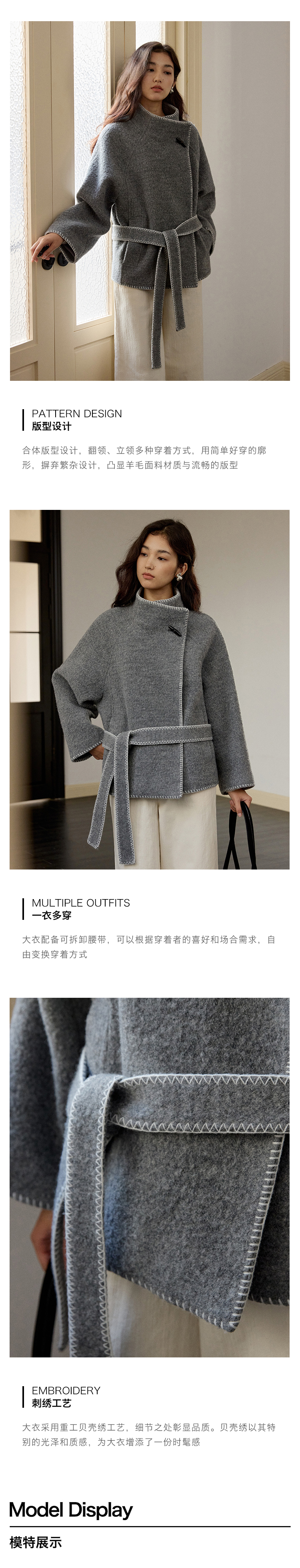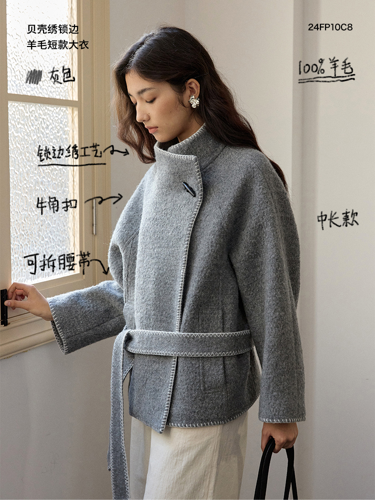 ForPoem 现货 24/FW原创设计贝壳绣锁边绣100羊毛短款腰带休闲大衣