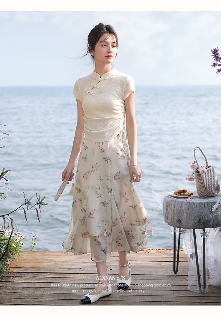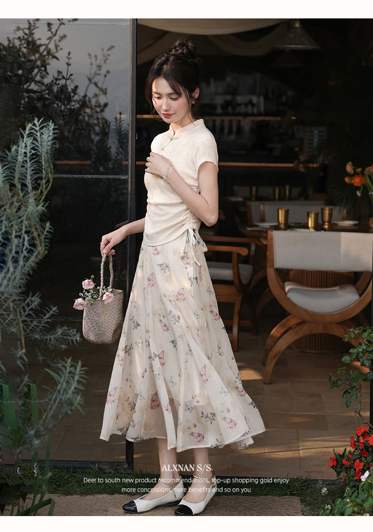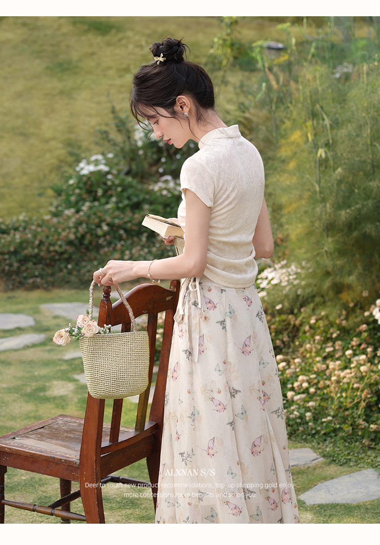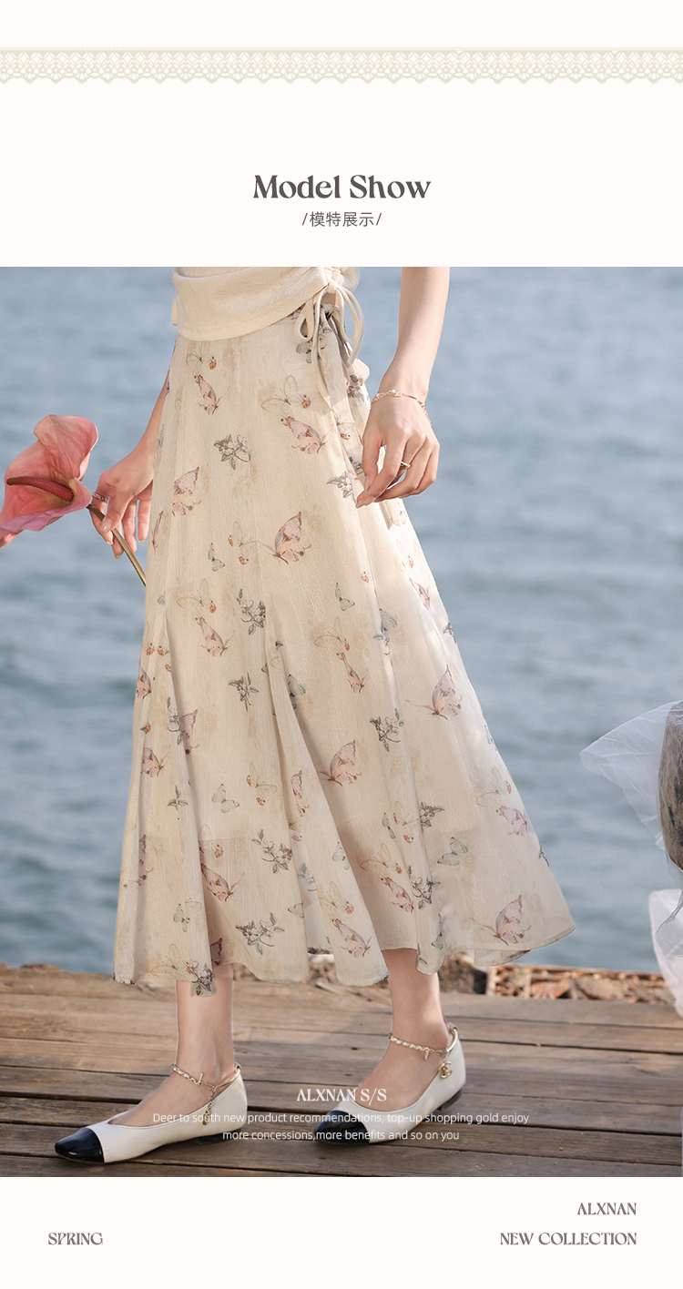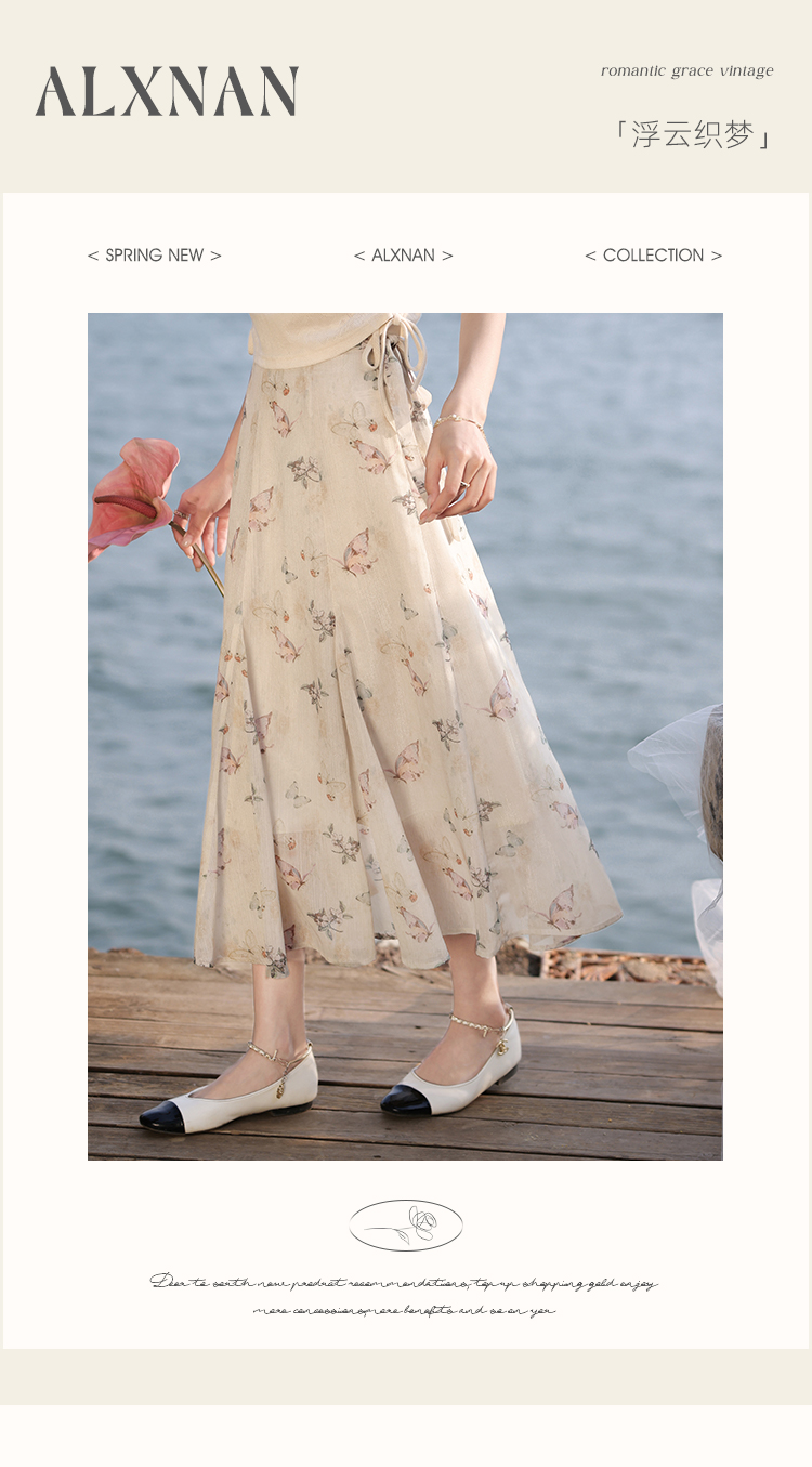 鹿向南「浮云织梦」杏色印花新中式半身裙女2025夏设计感a字长裙