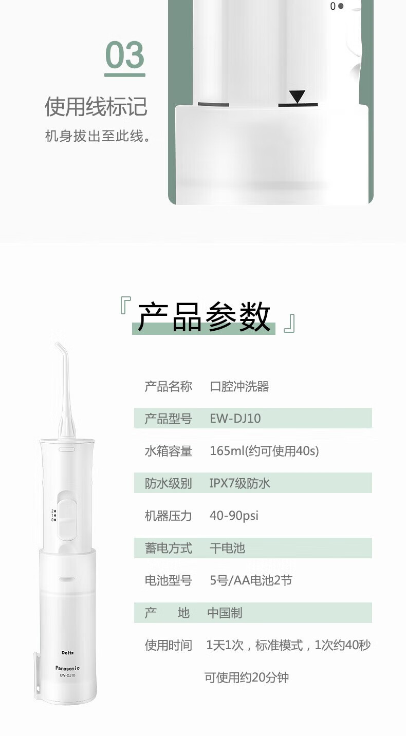 松下(Panasonic)电动冲牙器便携式牙齿缝清洁器洗牙机清洁洗牙器水牙线电动冲牙器EW-DJ10-W405