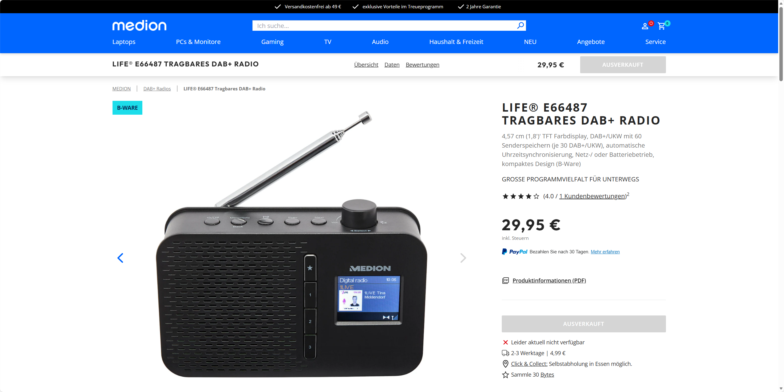 Medion LIFE E66487 便携式DAB+收音机 带AUX接口