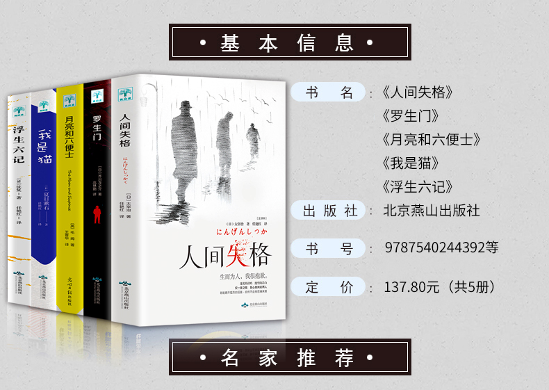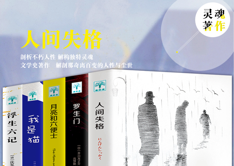 书名:《人间失格+罗生门+我是猫+月亮与六便士+浮生六记》(全5册)