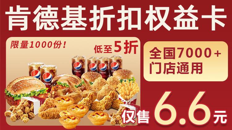 【全国通用】6.6元抢肯德基权益折扣年卡,堂食/打包!7000+家门店通用,用一次就回本!