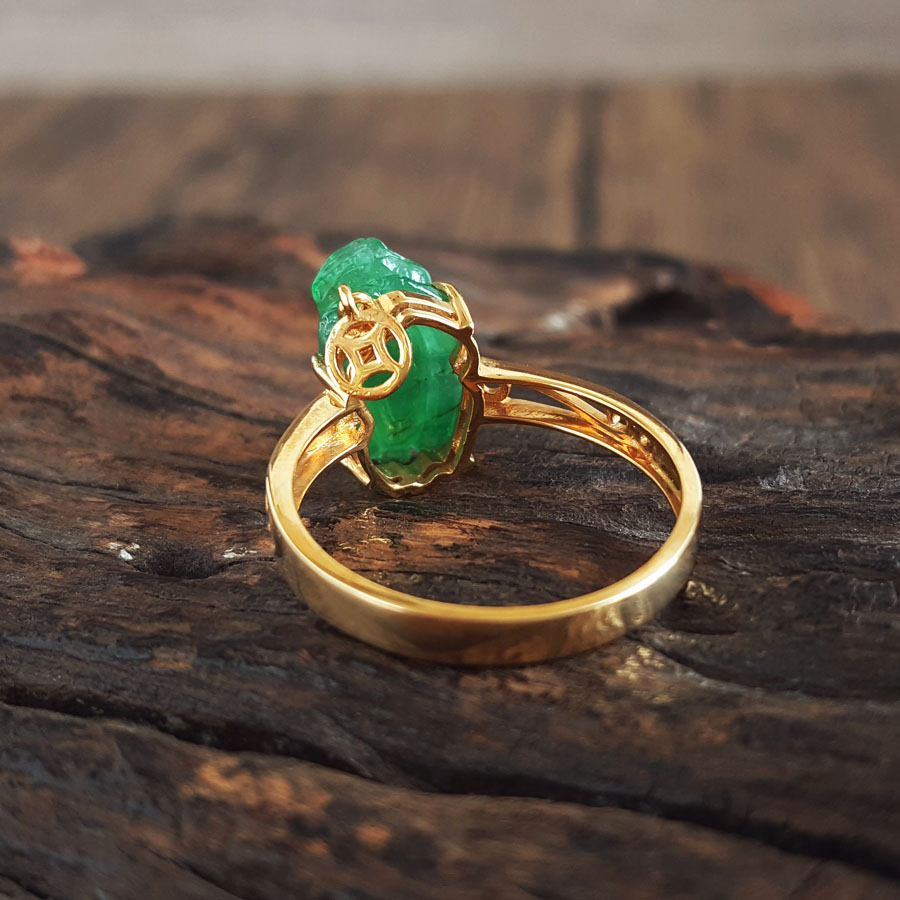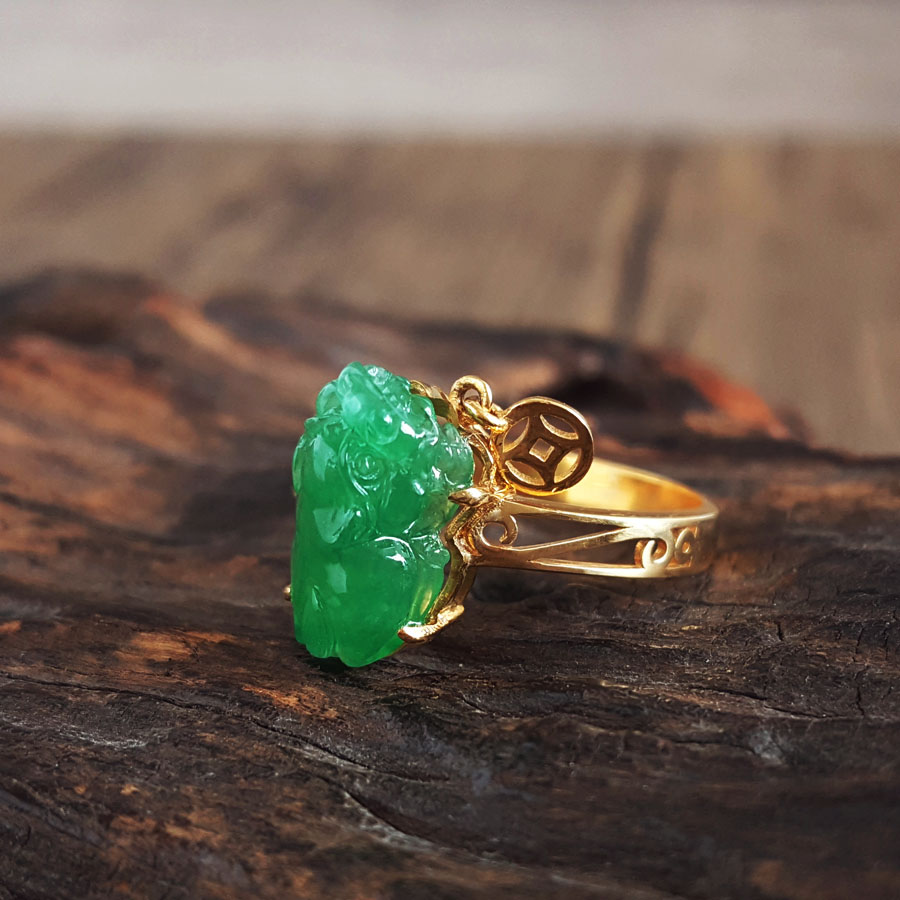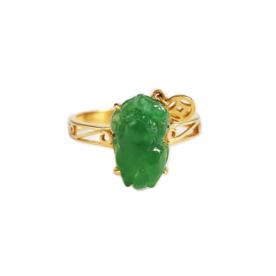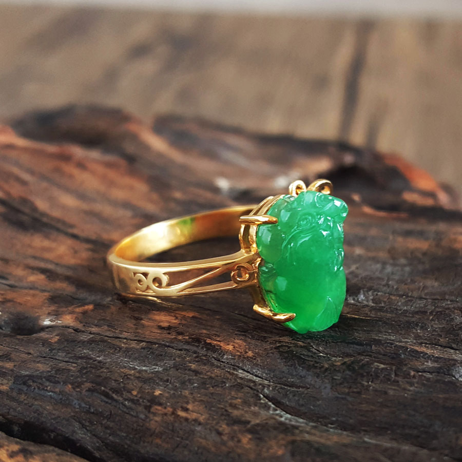 名称 | AU750黄金镶天然细腻冰种瑞兽满绿翡翠戒指 |