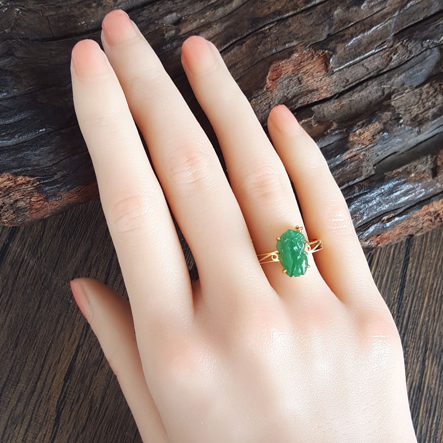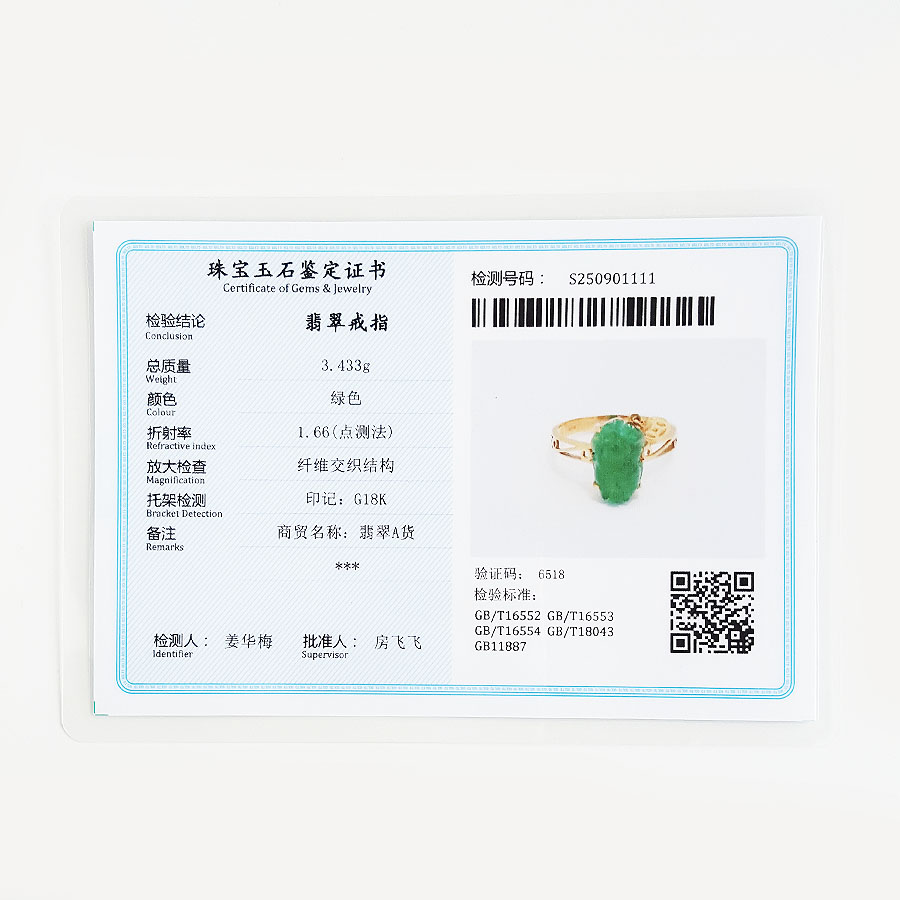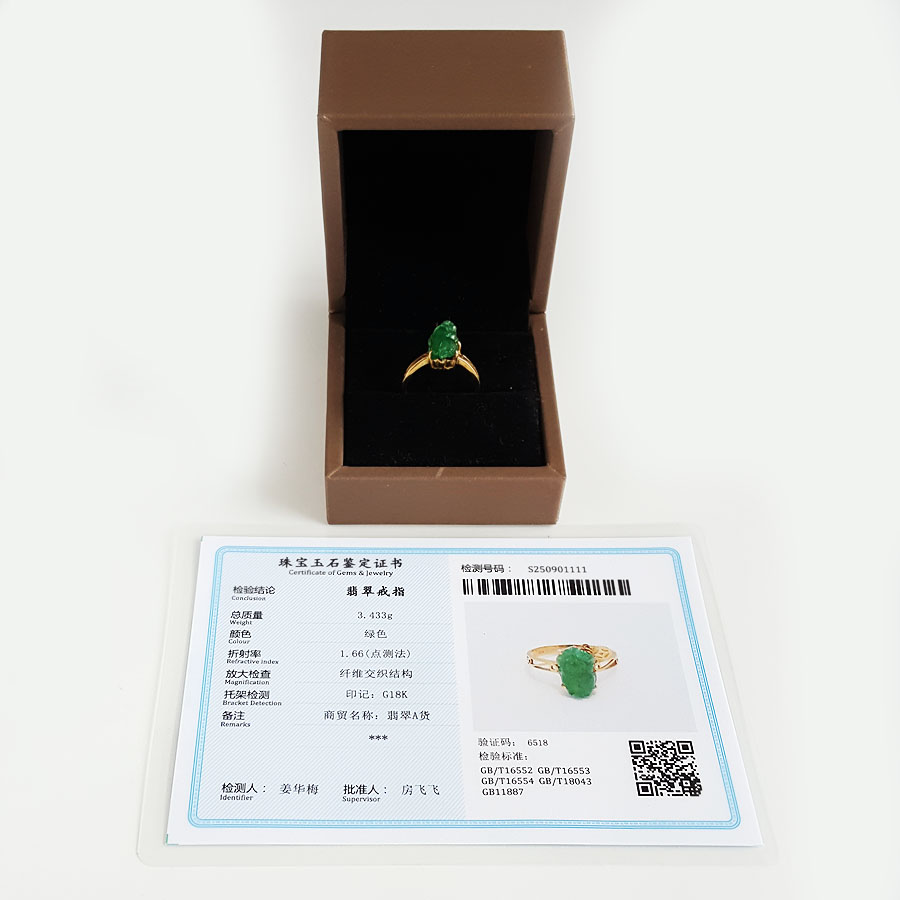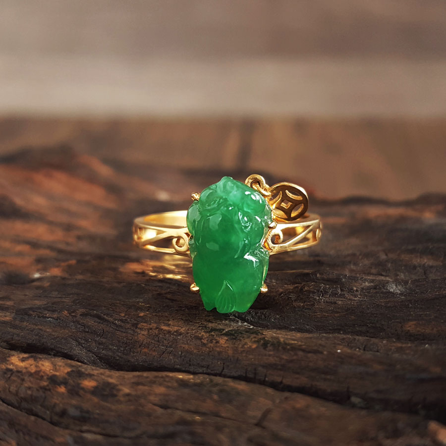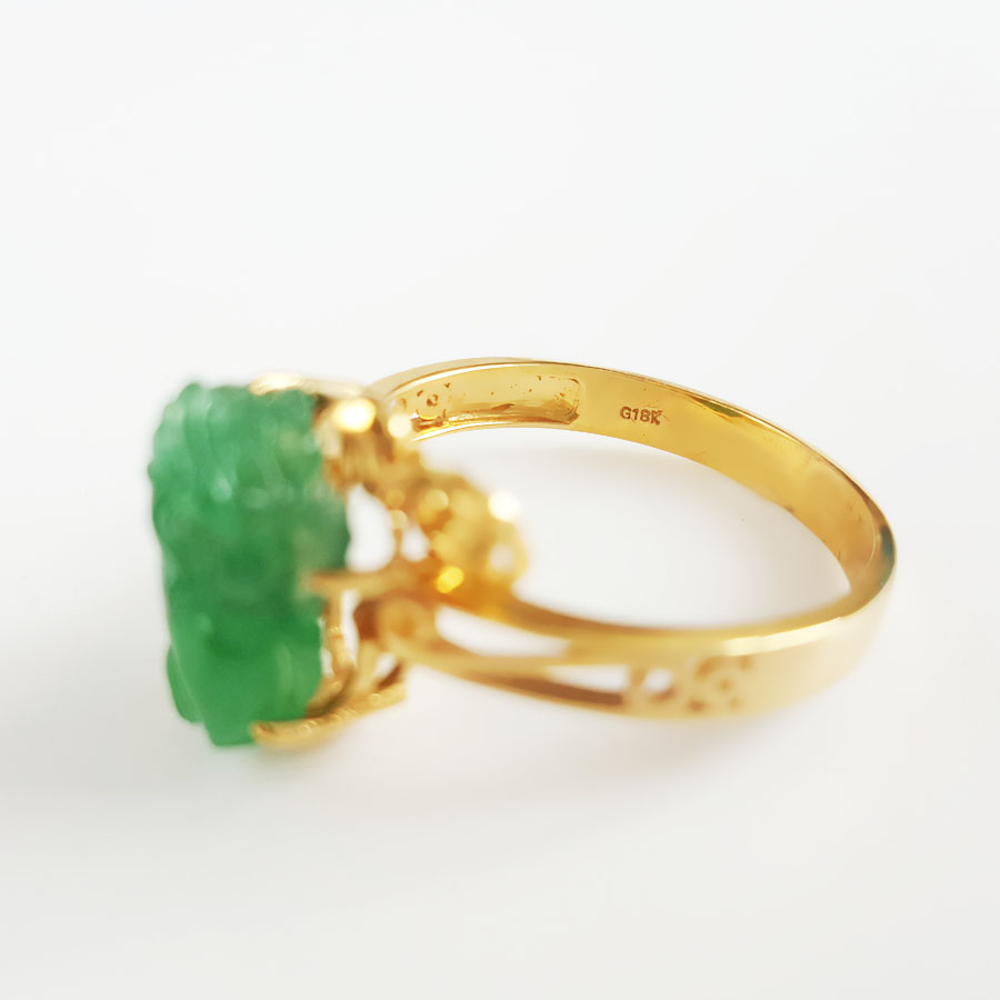 名称 | AU750黄金镶天然细腻冰种瑞兽满绿翡翠戒指 |