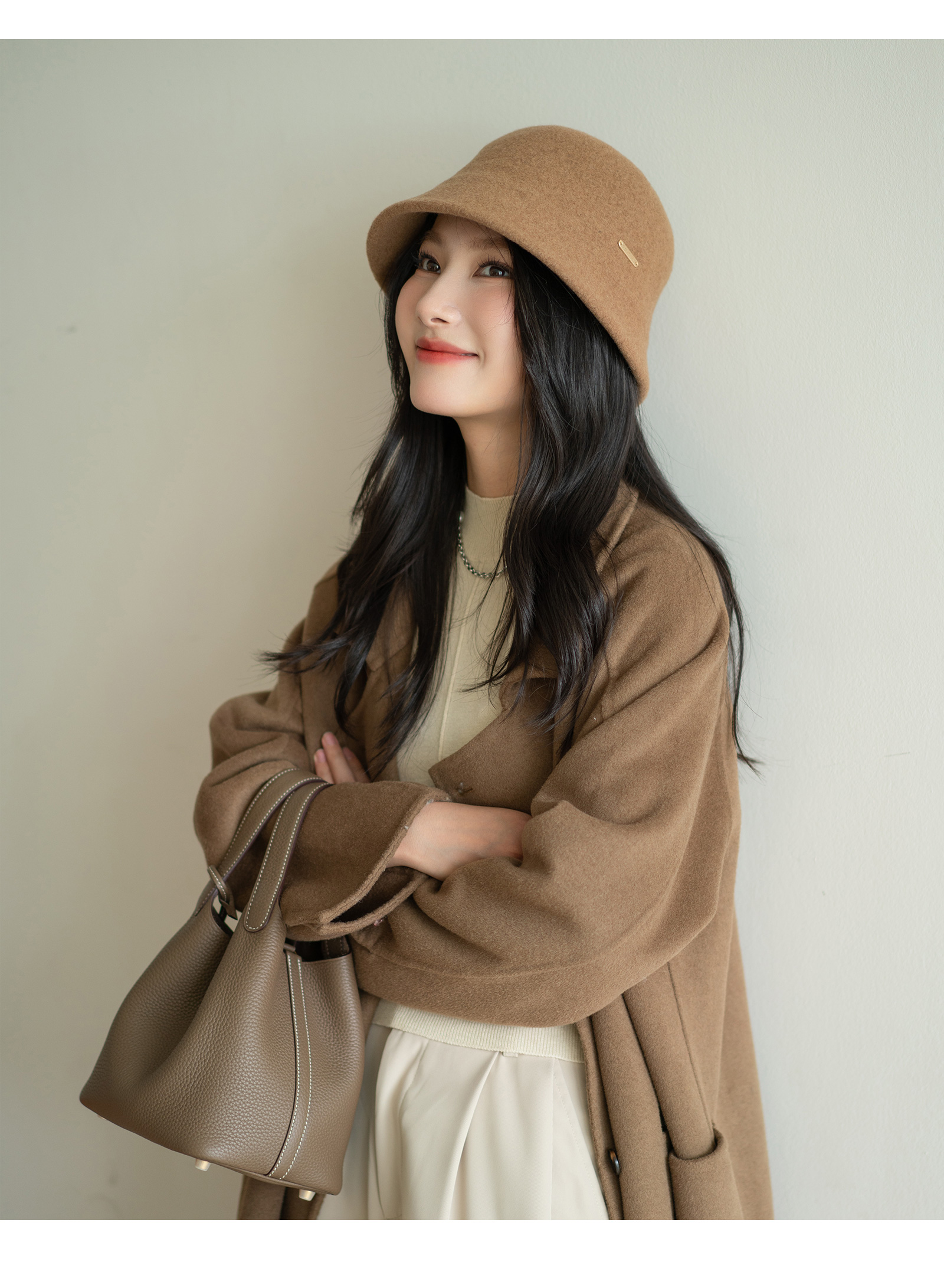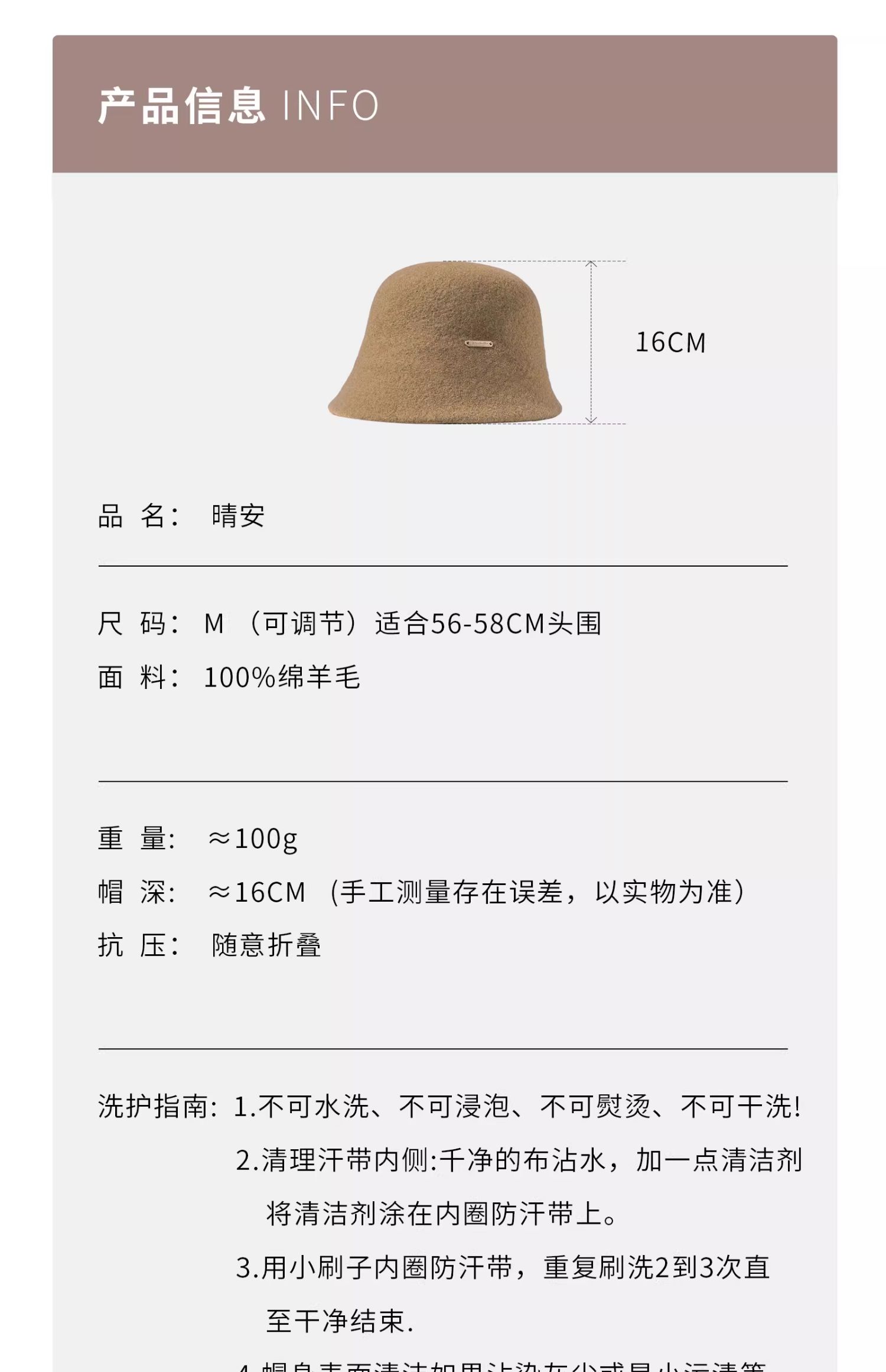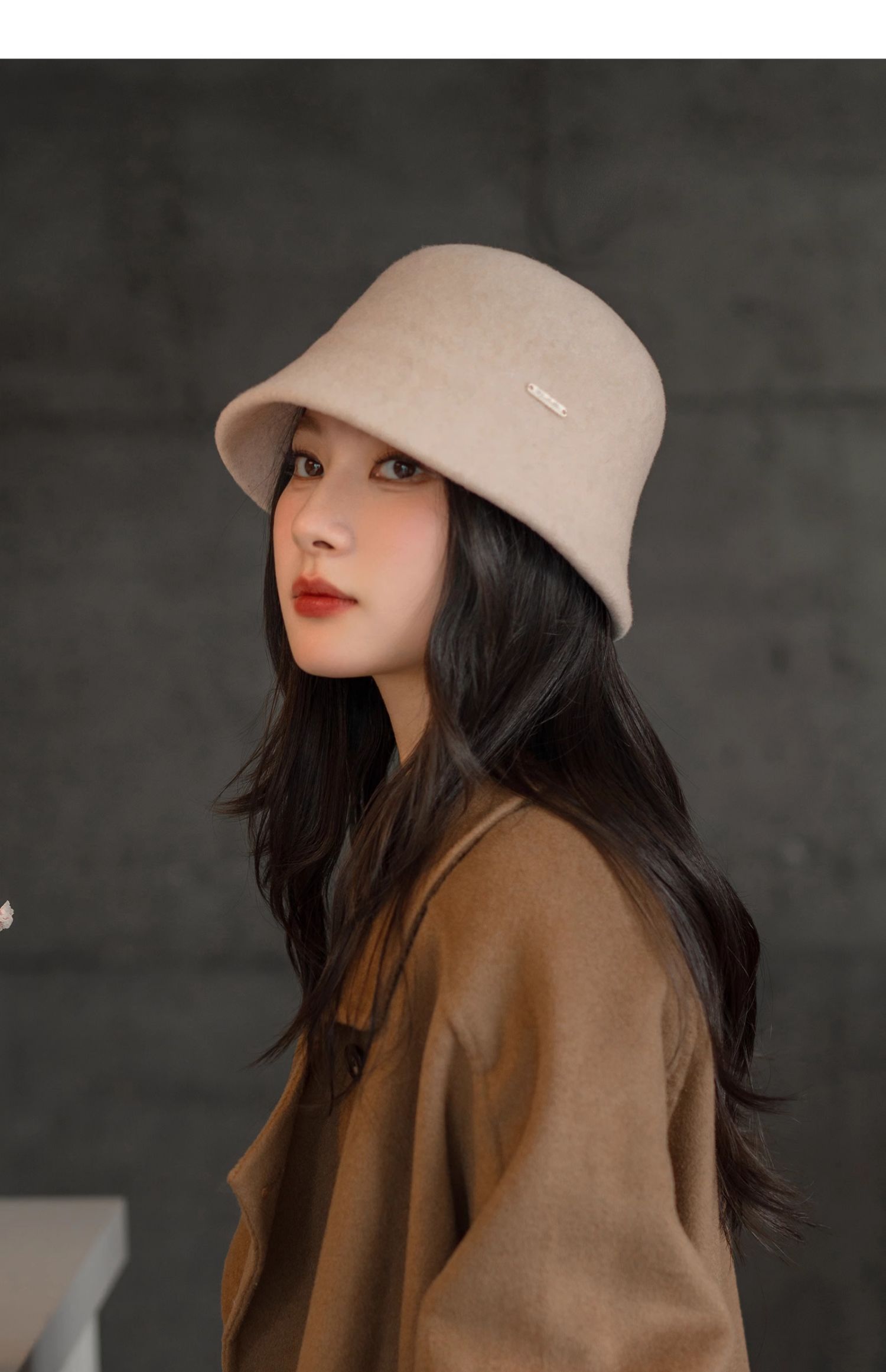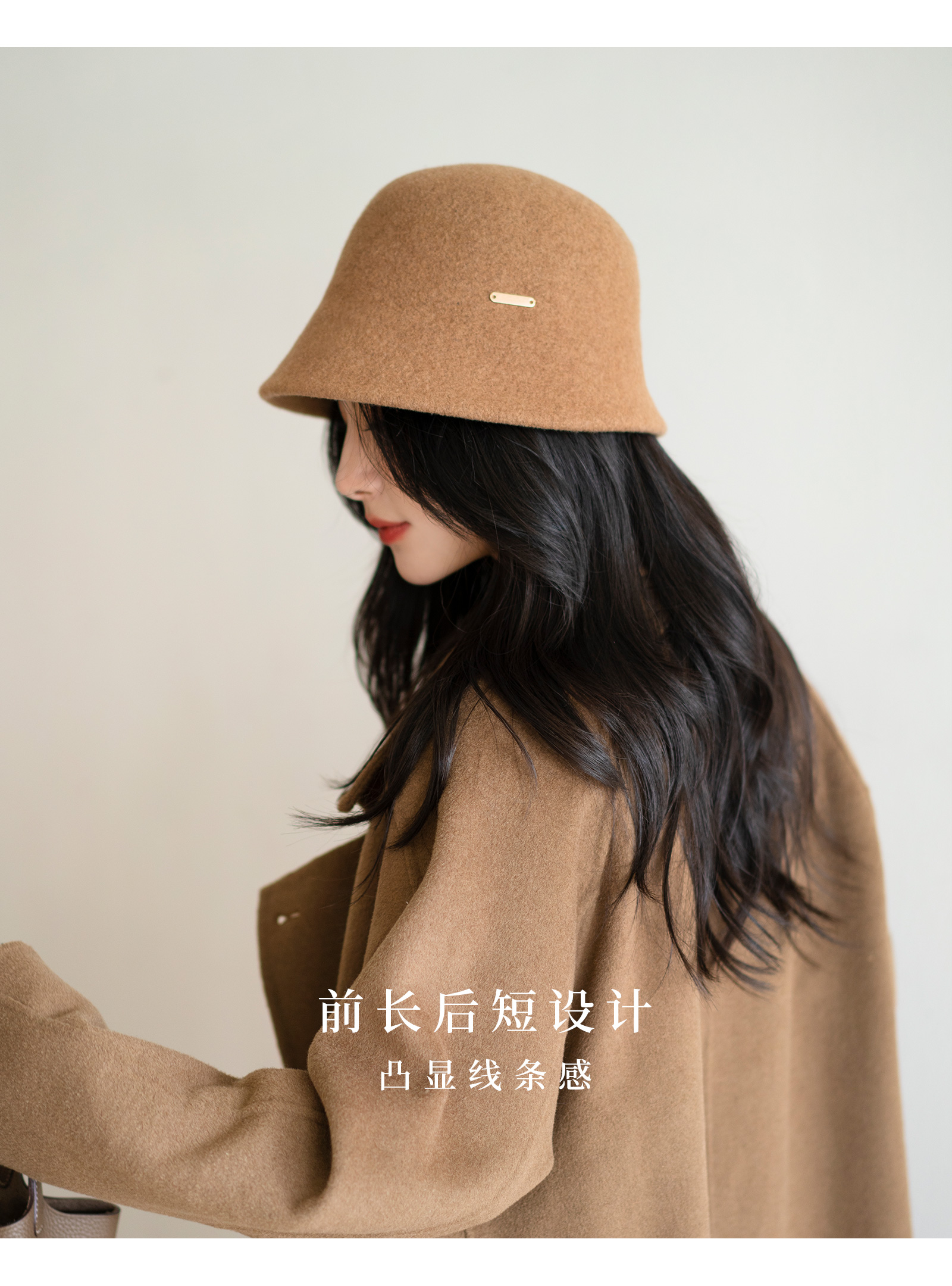 疯帽子 前长后短纯羊毛渔夫帽子女 秋冬小头保暖百搭纯色盆帽