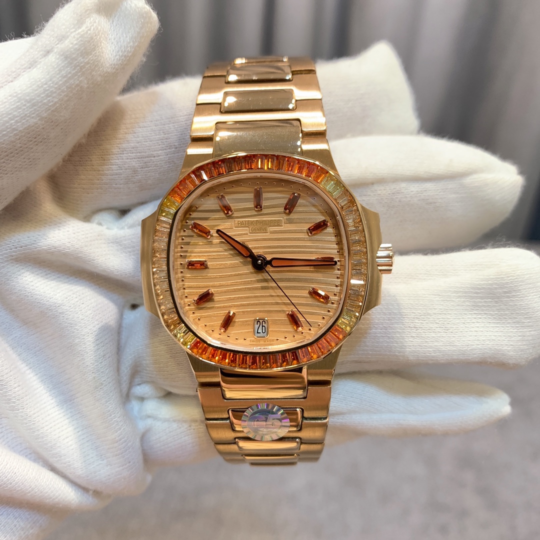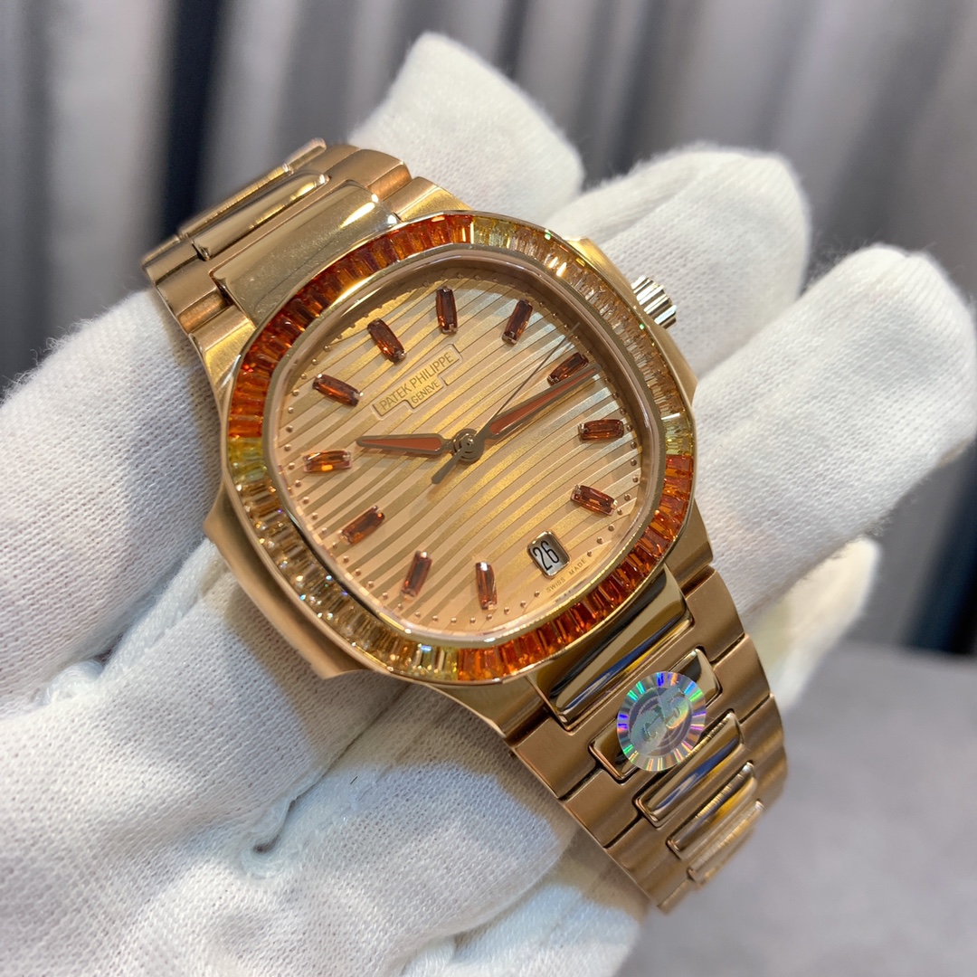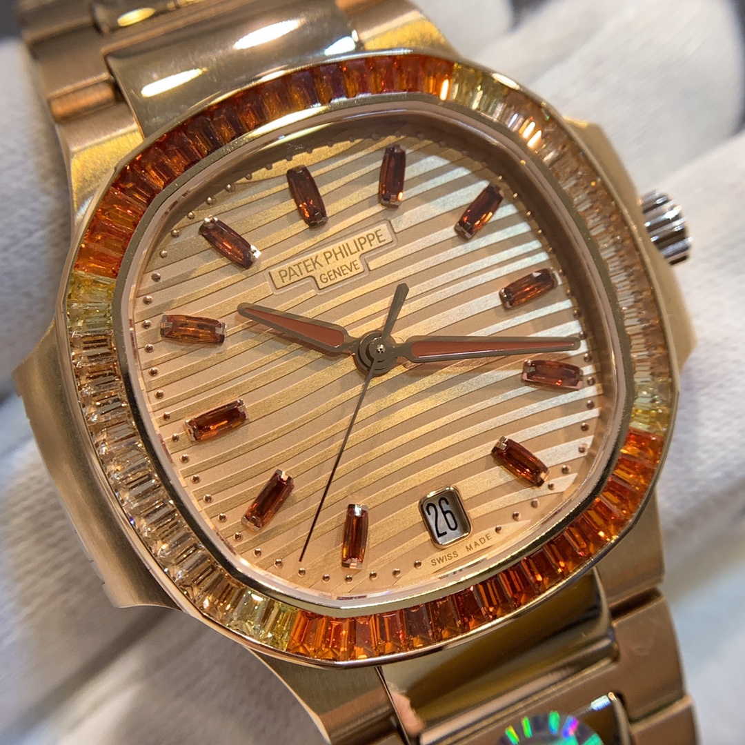 新款出货🔥GR百达翡丽Nautilus女式腕表推出全新珠宝款式!八角形表圈镶饰双排68颗长形锰铝榴石,呈现自干邑色(12时和6时位置)至香槟色(9时和3时位置)的双重渐变效果。表盘镶嵌尖顶形干邑色锰铝榴石时标。光影流转之间,这款珍稀杰作尽展现代韵致。