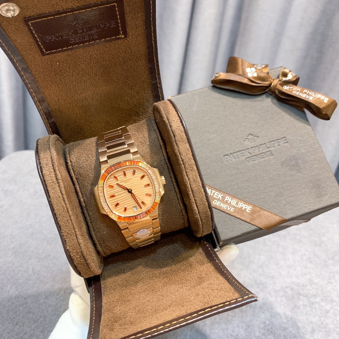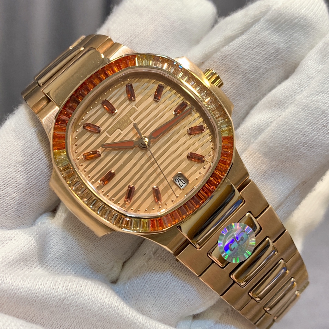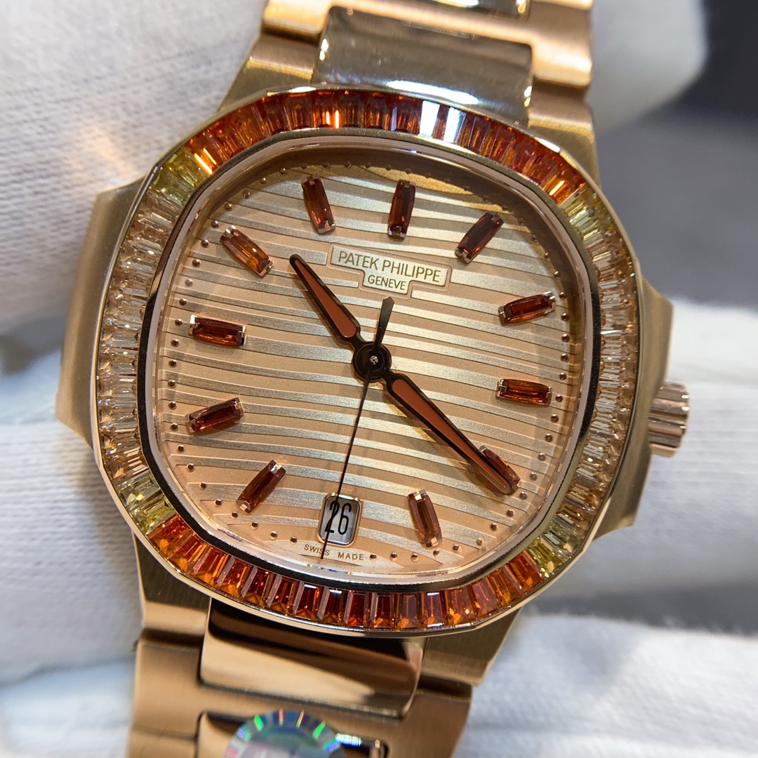 新款出货🔥GR百达翡丽Nautilus女式腕表推出全新珠宝款式!八角形表圈镶饰双排68颗长形锰铝榴石,呈现自干邑色(12时和6时位置)至香槟色(9时和3时位置)的双重渐变效果。表盘镶嵌尖顶形干邑色锰铝榴石时标。光影流转之间,这款珍稀杰作尽展现代韵致。