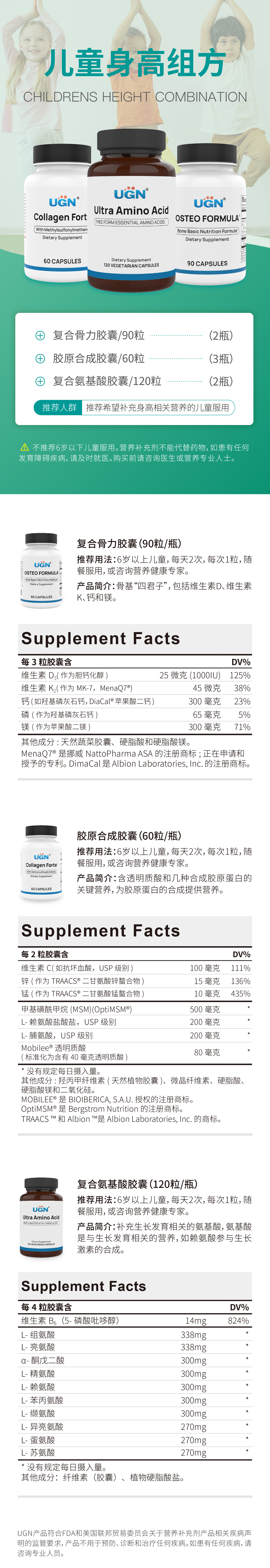 UGN儿童成长组方×3个月(复合骨力胶囊*2瓶、胶原合成胶囊*3瓶、复合氨基酸胶囊*2)