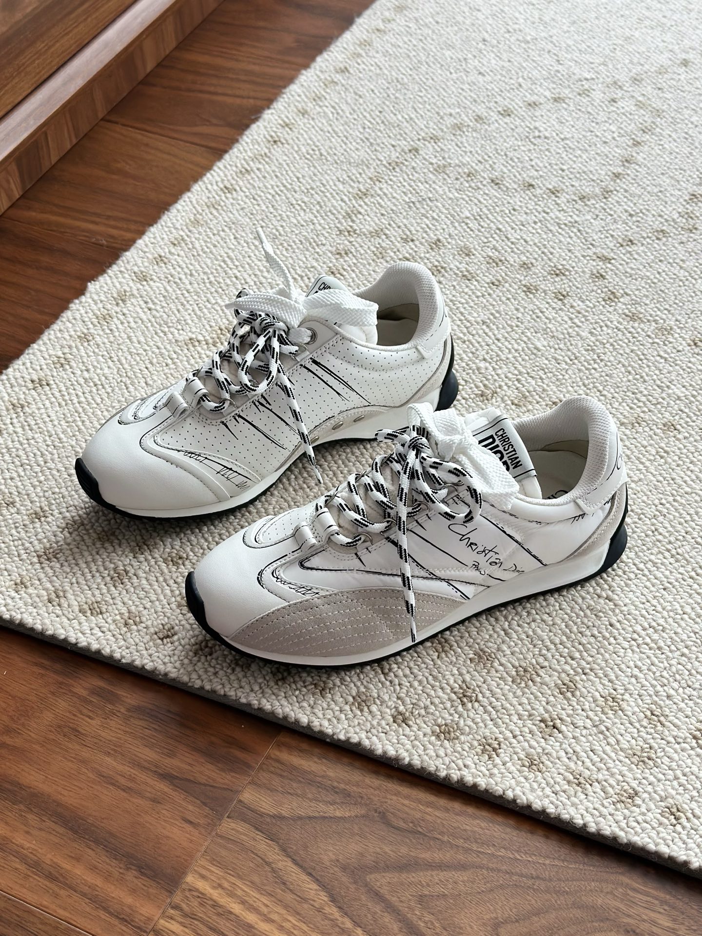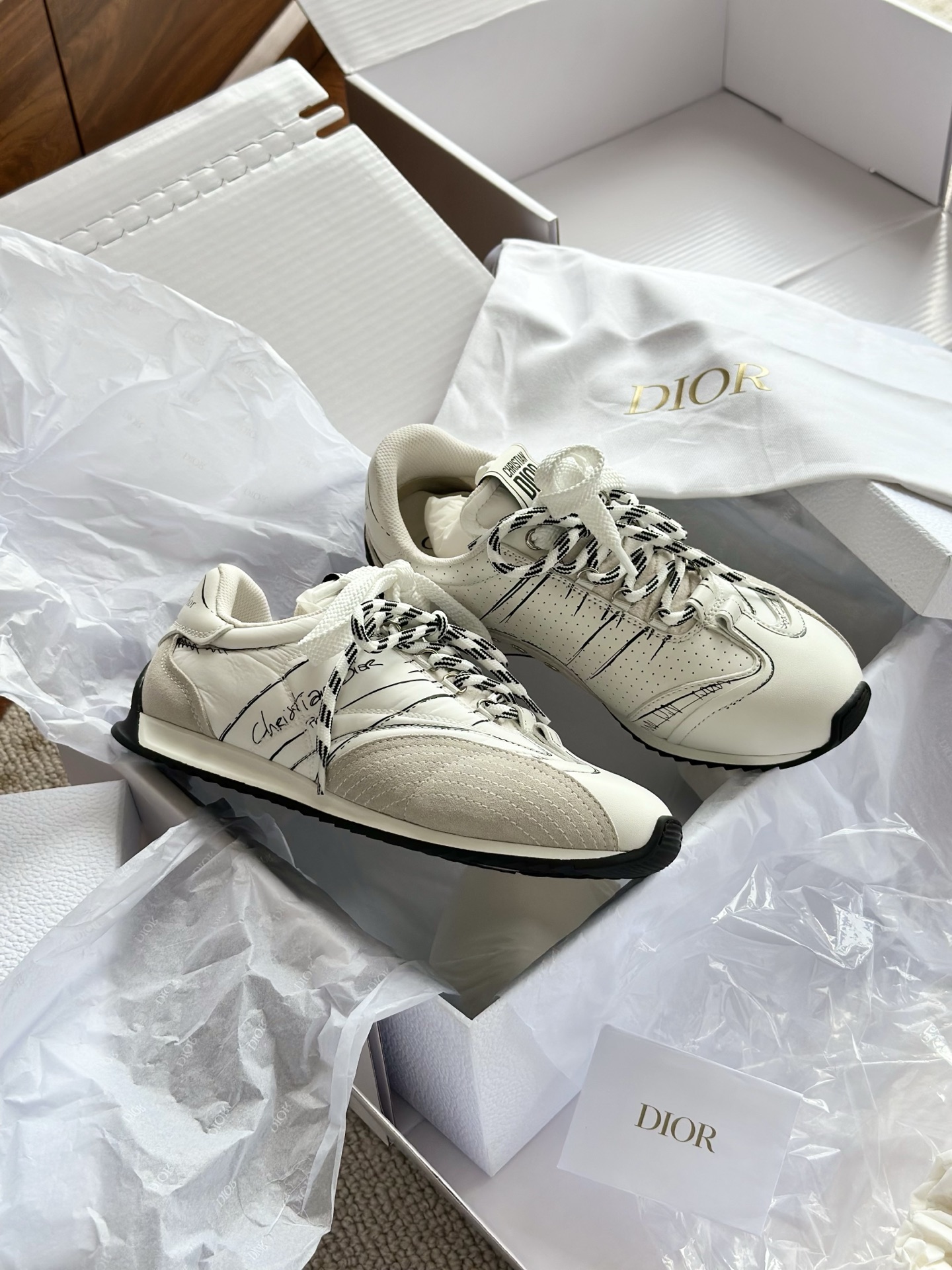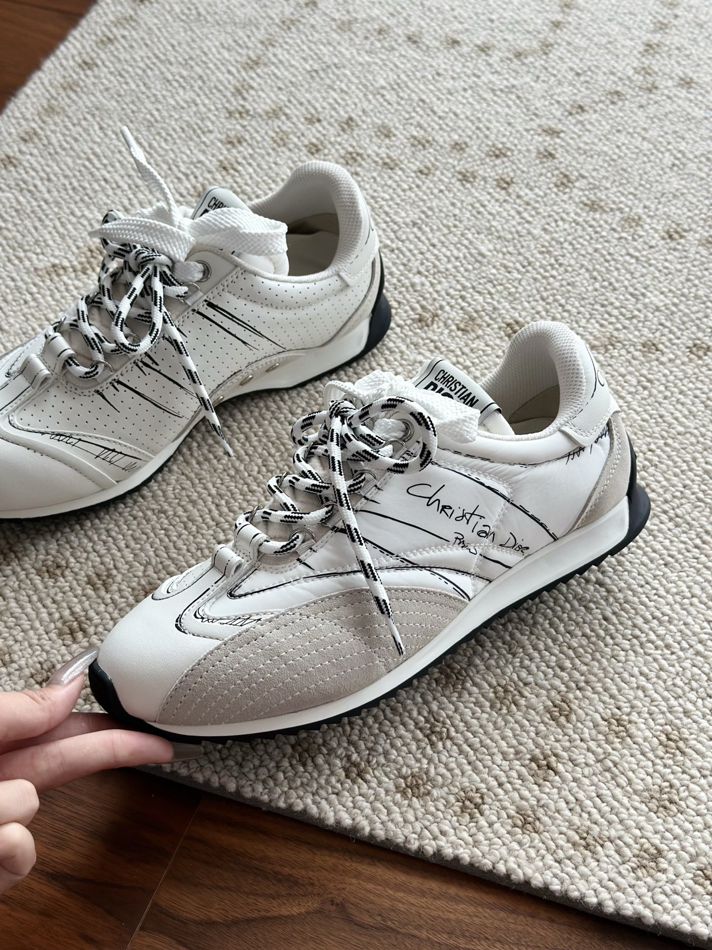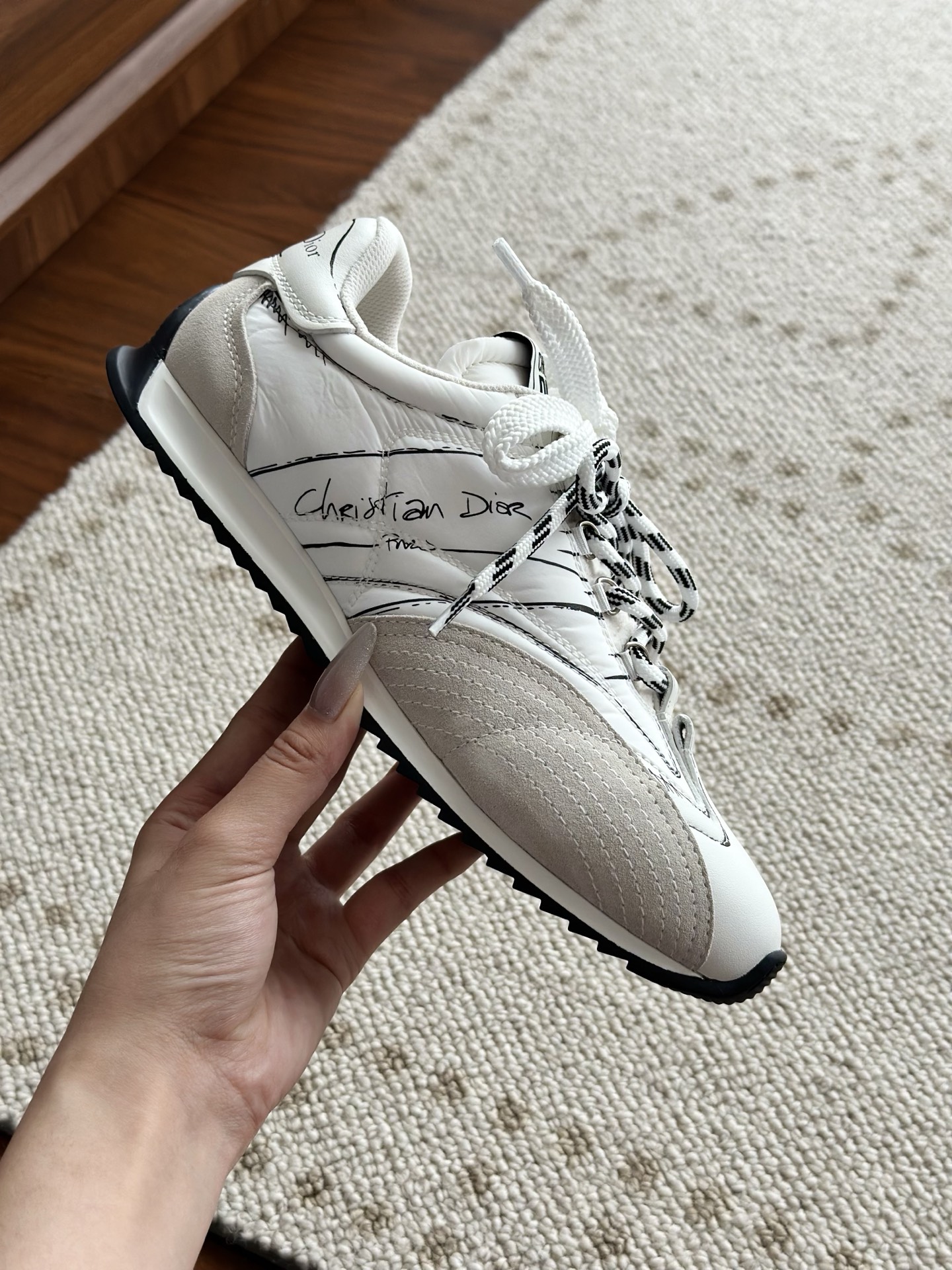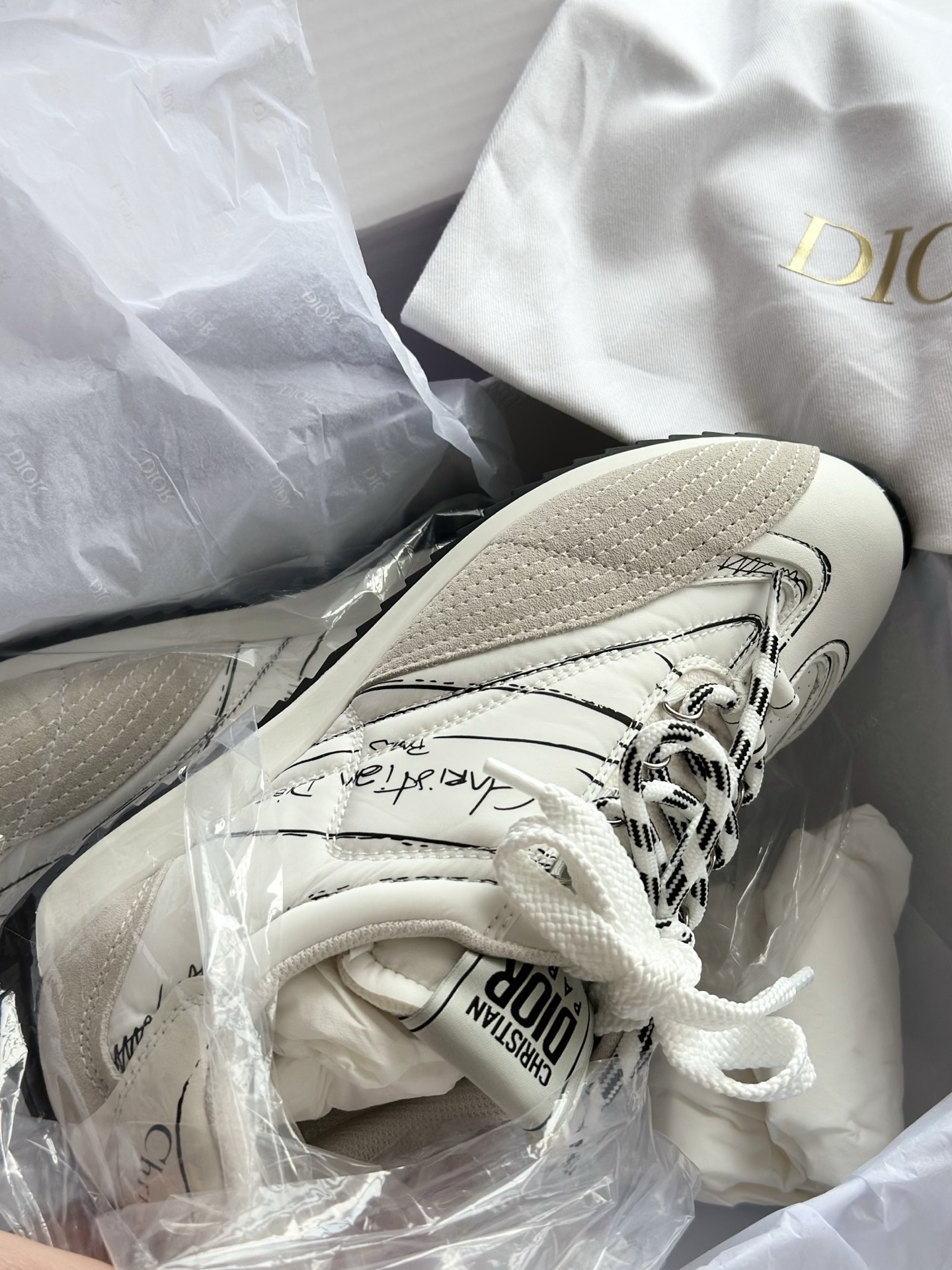 代购单 Dio*迪奥D-Sketch 25ss涂鸦运动跑鞋 迪奥春夏系列发布秀精彩亮相,彰显经典的复古美学。采用白色尼龙和牛皮革精心制作,饰以灵感源自鞋履制作阶段的印花标志,搭配米色绒面牛皮革镶片和双鞋带! 侧面饰以手写风格的Christian Dior Paris标志,鞋跟和鞋舌点缀以Christian Dior Paris标志镶片和标牌! 搭配双色纤薄橡胶鞋底更显精致,可为各式休闲造型增添高定气质! 鞋面:麂皮/进口牛皮/原版尼龙 内里:原版透气网眼材质 鞋底:Tpu原版橡胶鞋底 码数:35-40