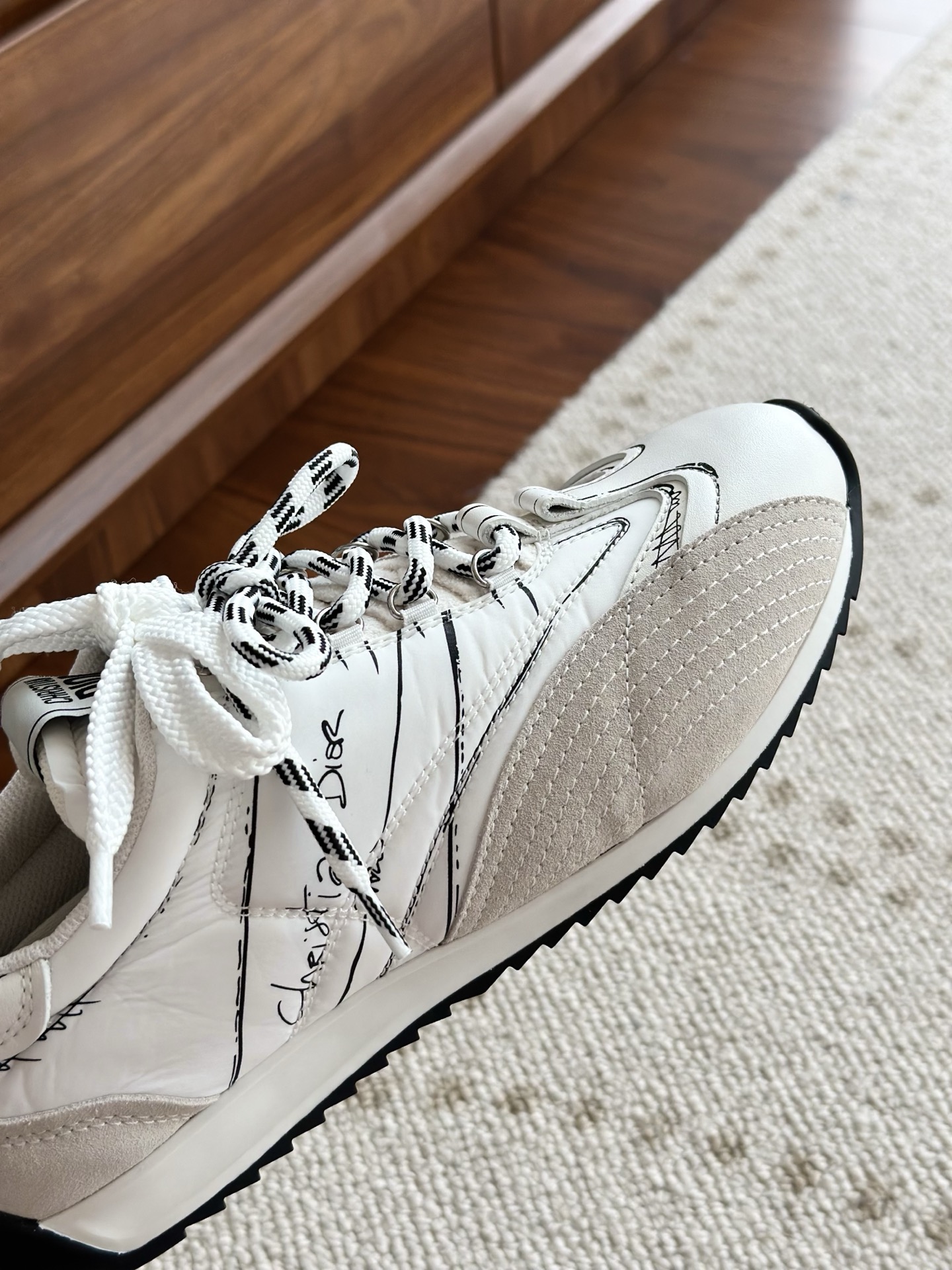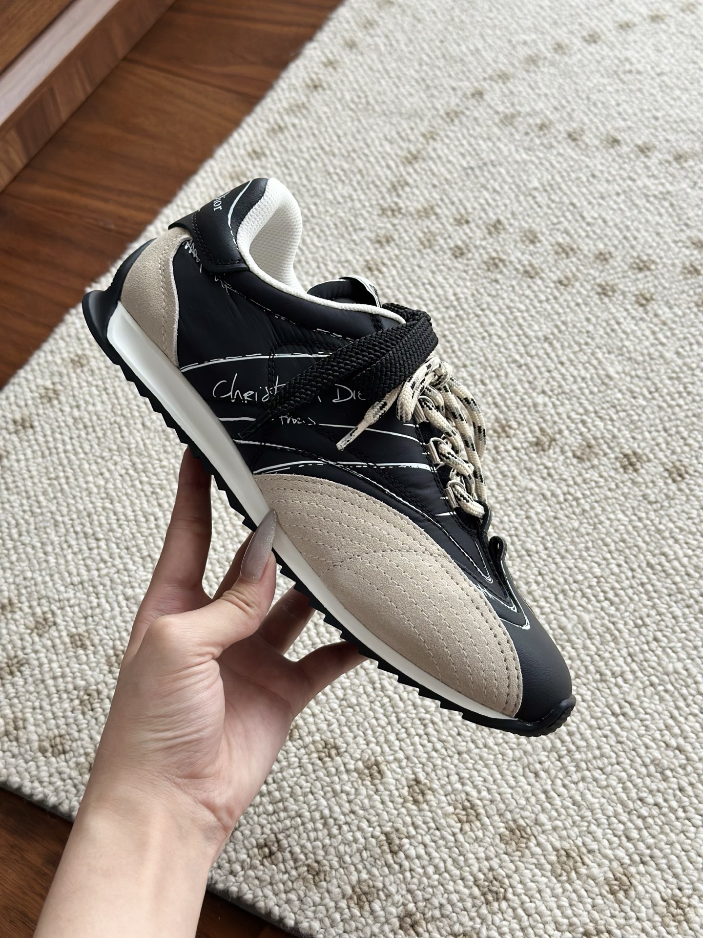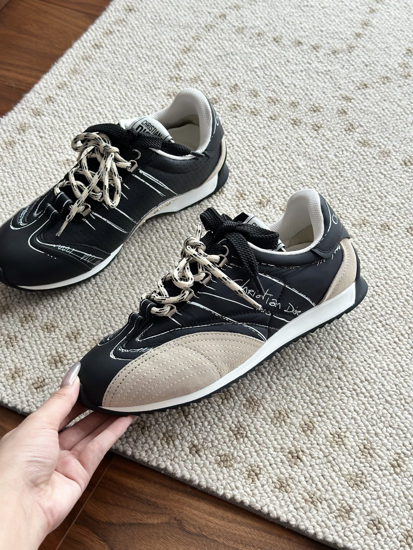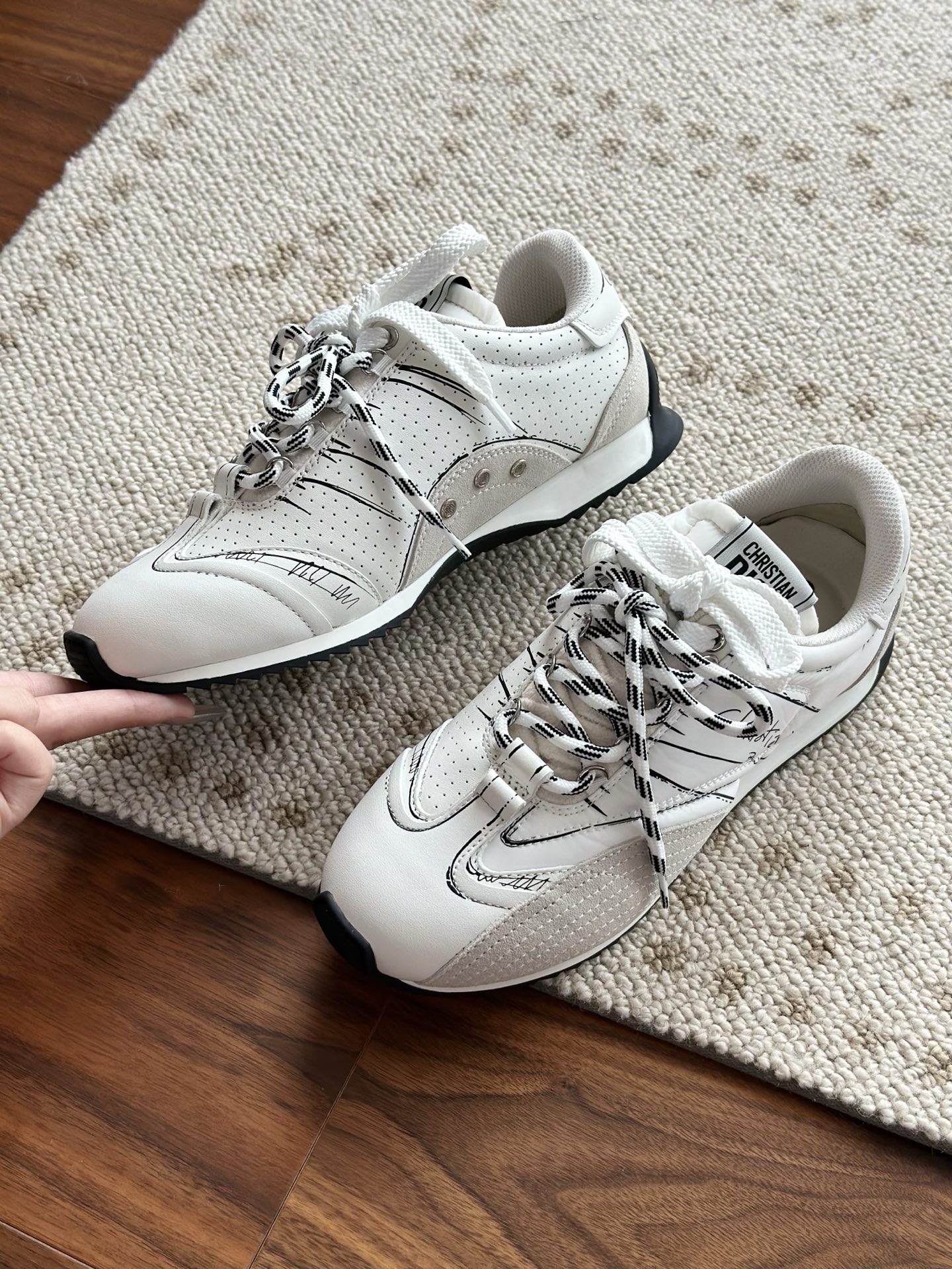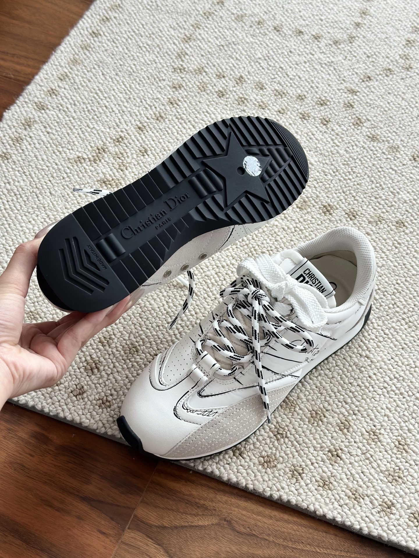 代购单 Dio*迪奥D-Sketch 25ss涂鸦运动跑鞋 迪奥春夏系列发布秀精彩亮相,彰显经典的复古美学。采用白色尼龙和牛皮革精心制作,饰以灵感源自鞋履制作阶段的印花标志,搭配米色绒面牛皮革镶片和双鞋带! 侧面饰以手写风格的Christian Dior Paris标志,鞋跟和鞋舌点缀以Christian Dior Paris标志镶片和标牌! 搭配双色纤薄橡胶鞋底更显精致,可为各式休闲造型增添高定气质! 鞋面:麂皮/进口牛皮/原版尼龙 内里:原版透气网眼材质 鞋底:Tpu原版橡胶鞋底 码数:35-40