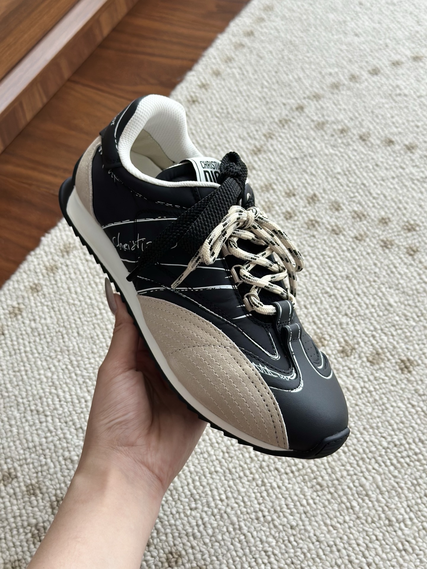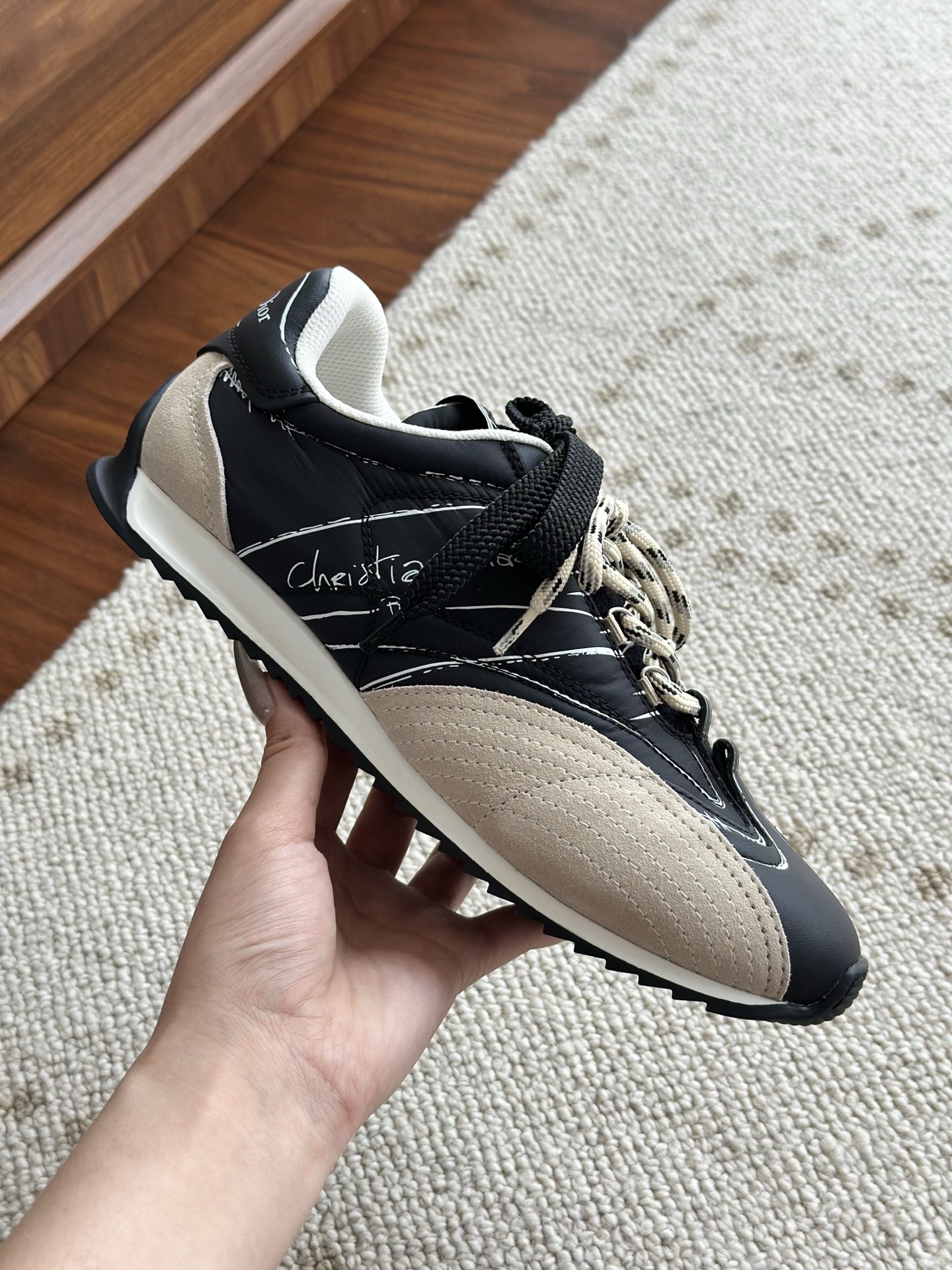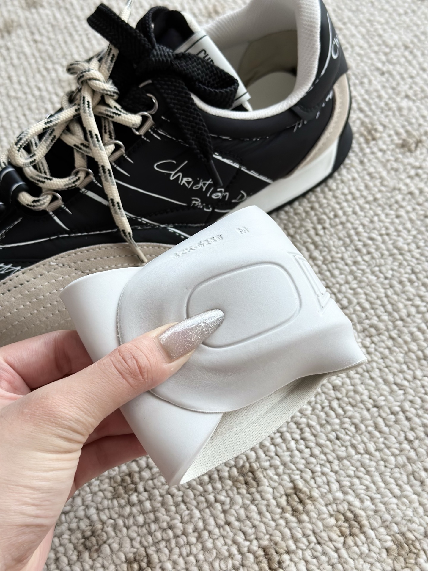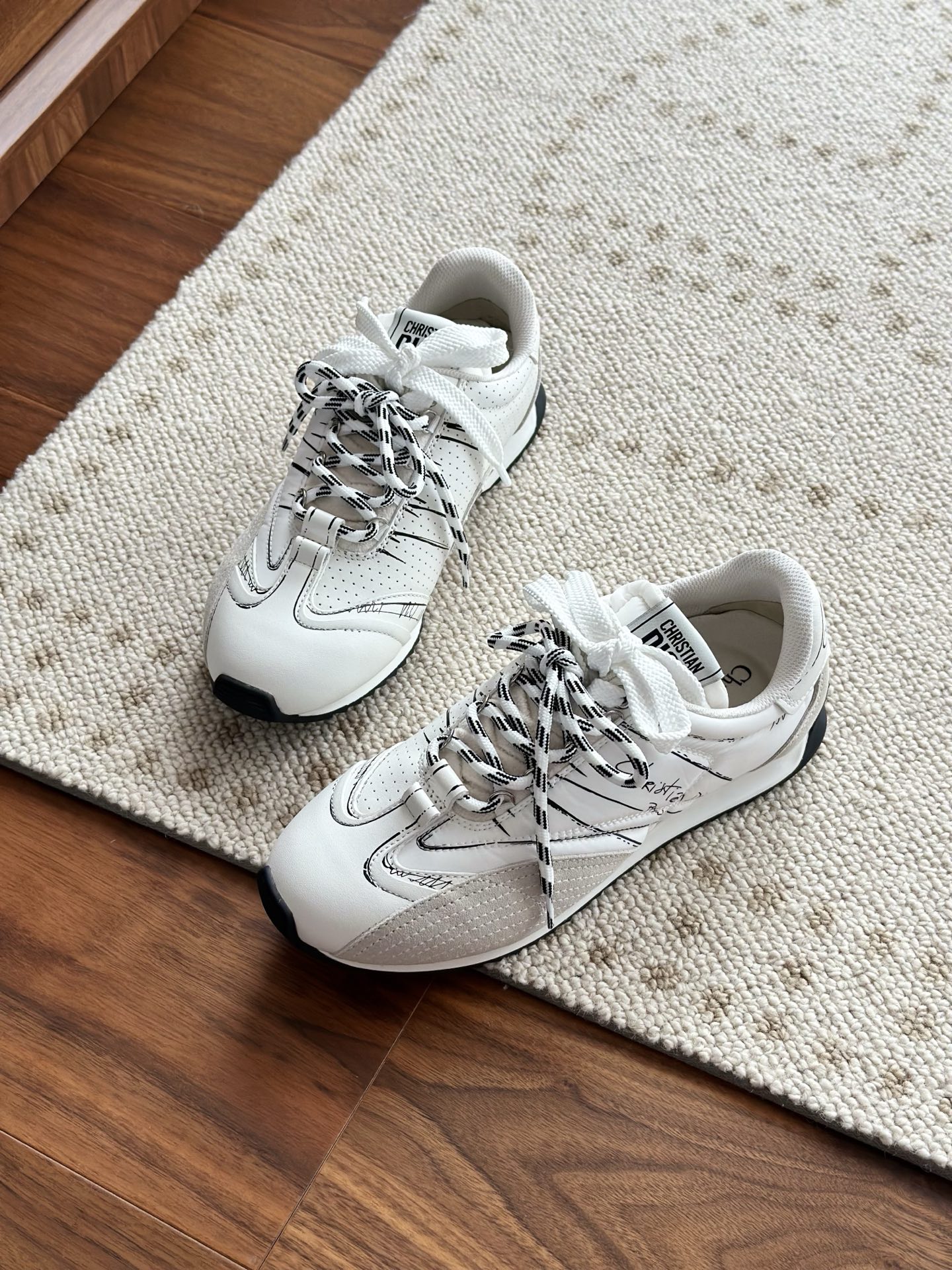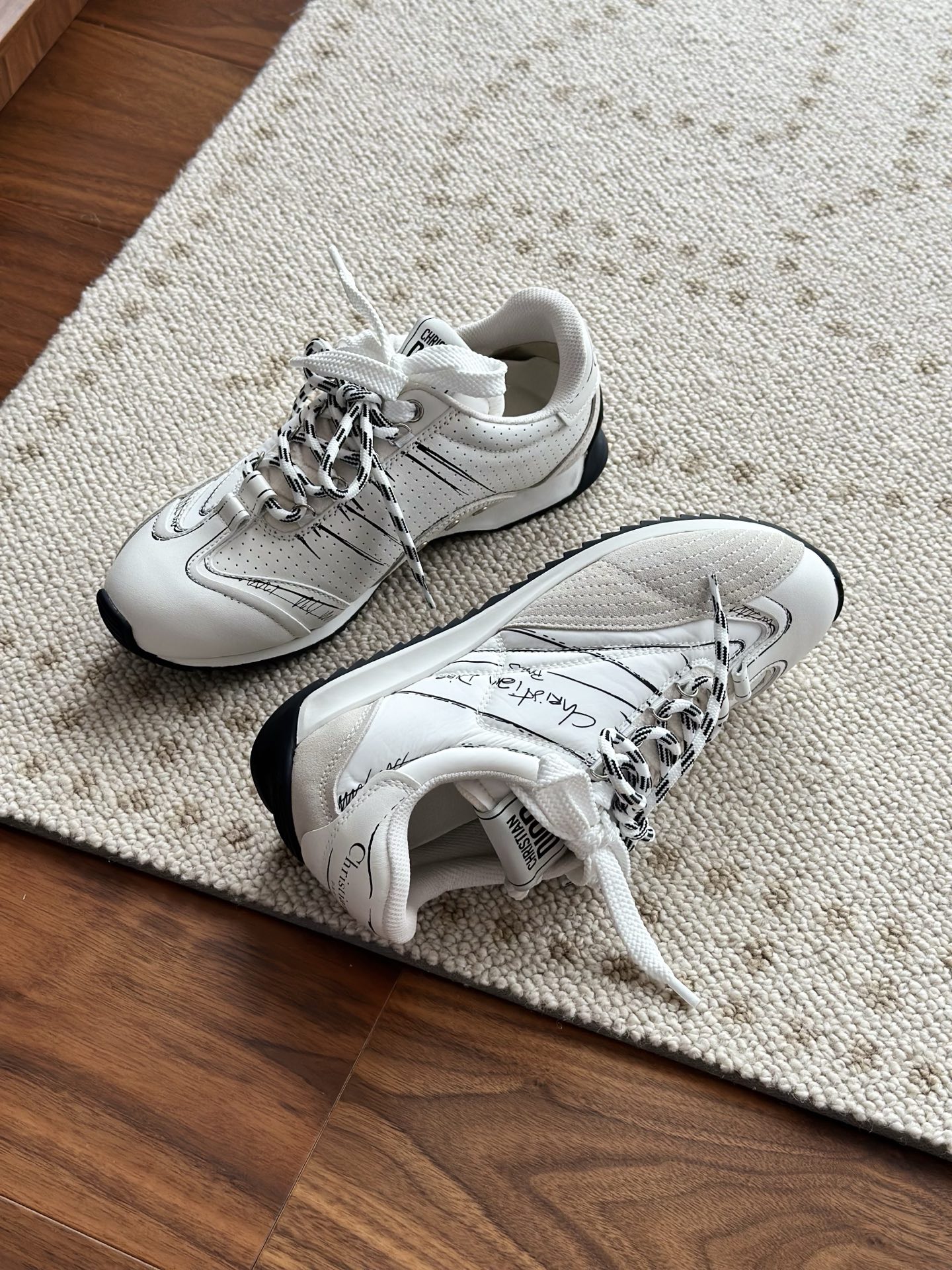 代购单 Dio*迪奥D-Sketch 25ss涂鸦运动跑鞋 迪奥春夏系列发布秀精彩亮相,彰显经典的复古美学。采用白色尼龙和牛皮革精心制作,饰以灵感源自鞋履制作阶段的印花标志,搭配米色绒面牛皮革镶片和双鞋带! 侧面饰以手写风格的Christian Dior Paris标志,鞋跟和鞋舌点缀以Christian Dior Paris标志镶片和标牌! 搭配双色纤薄橡胶鞋底更显精致,可为各式休闲造型增添高定气质! 鞋面:麂皮/进口牛皮/原版尼龙 内里:原版透气网眼材质 鞋底:Tpu原版橡胶鞋底 码数:35-40