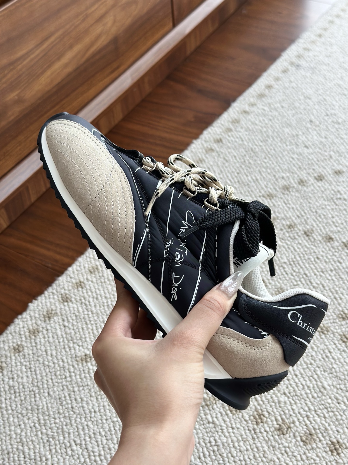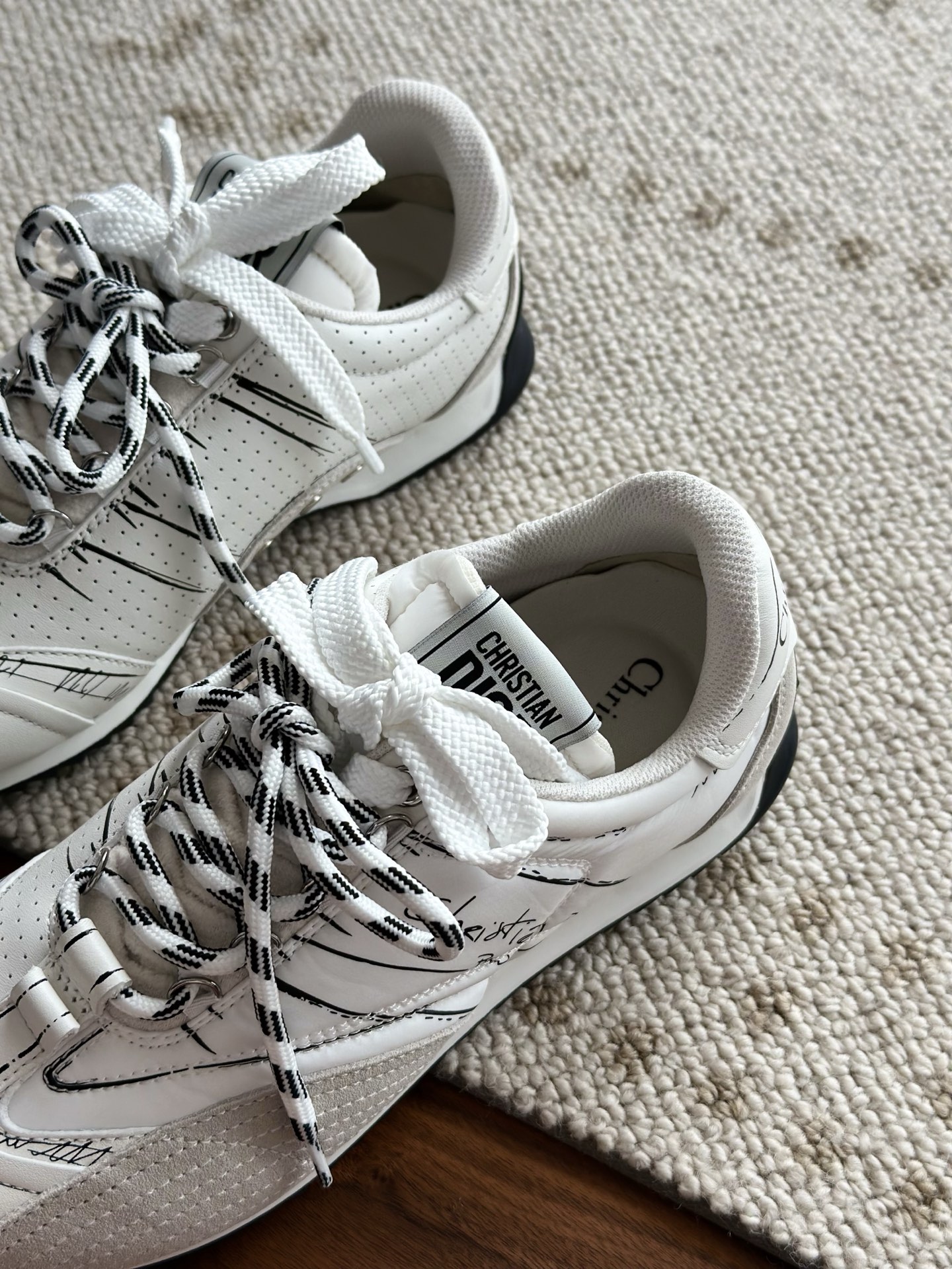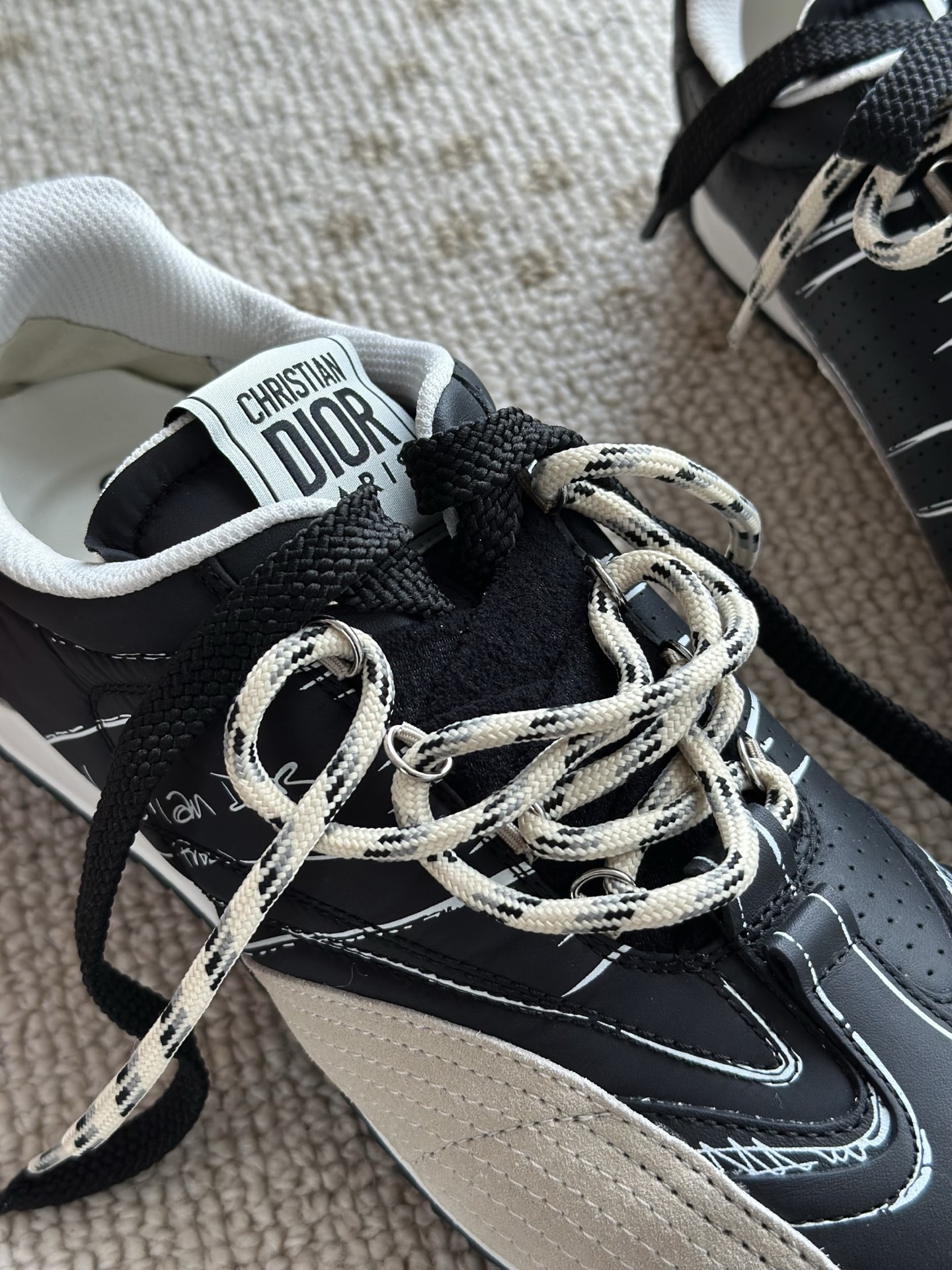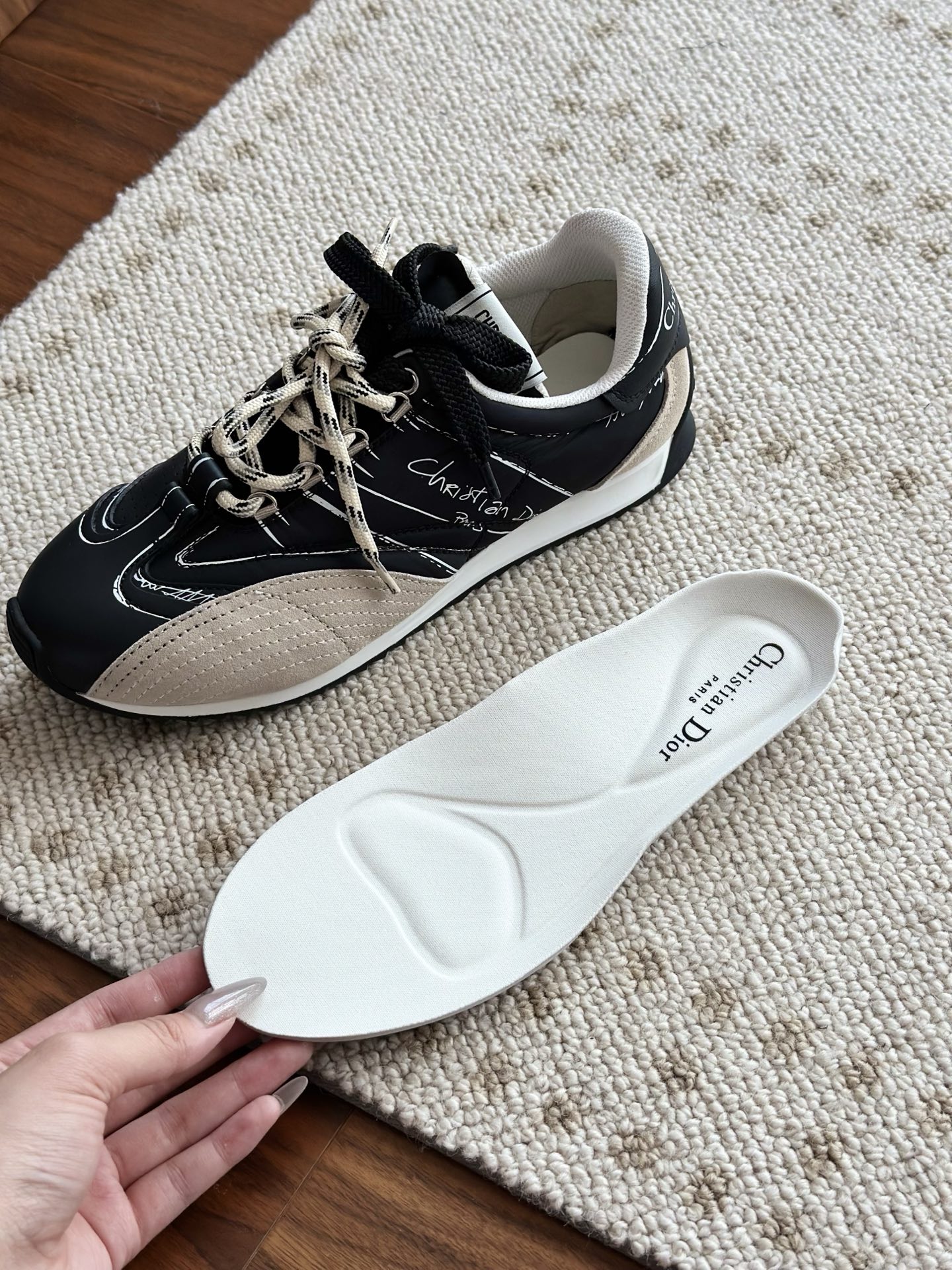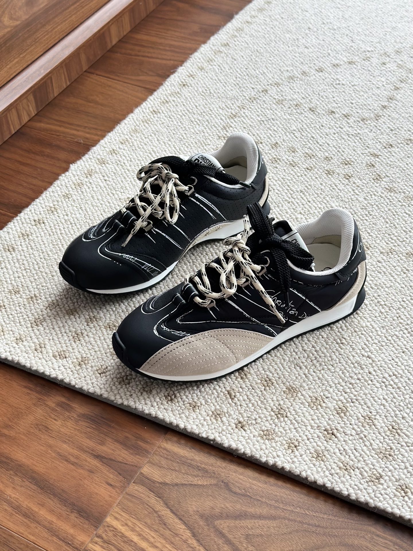 代购单 Dio*迪奥D-Sketch 25ss涂鸦运动跑鞋 迪奥春夏系列发布秀精彩亮相,彰显经典的复古美学。采用白色尼龙和牛皮革精心制作,饰以灵感源自鞋履制作阶段的印花标志,搭配米色绒面牛皮革镶片和双鞋带! 侧面饰以手写风格的Christian Dior Paris标志,鞋跟和鞋舌点缀以Christian Dior Paris标志镶片和标牌! 搭配双色纤薄橡胶鞋底更显精致,可为各式休闲造型增添高定气质! 鞋面:麂皮/进口牛皮/原版尼龙 内里:原版透气网眼材质 鞋底:Tpu原版橡胶鞋底 码数:35-40