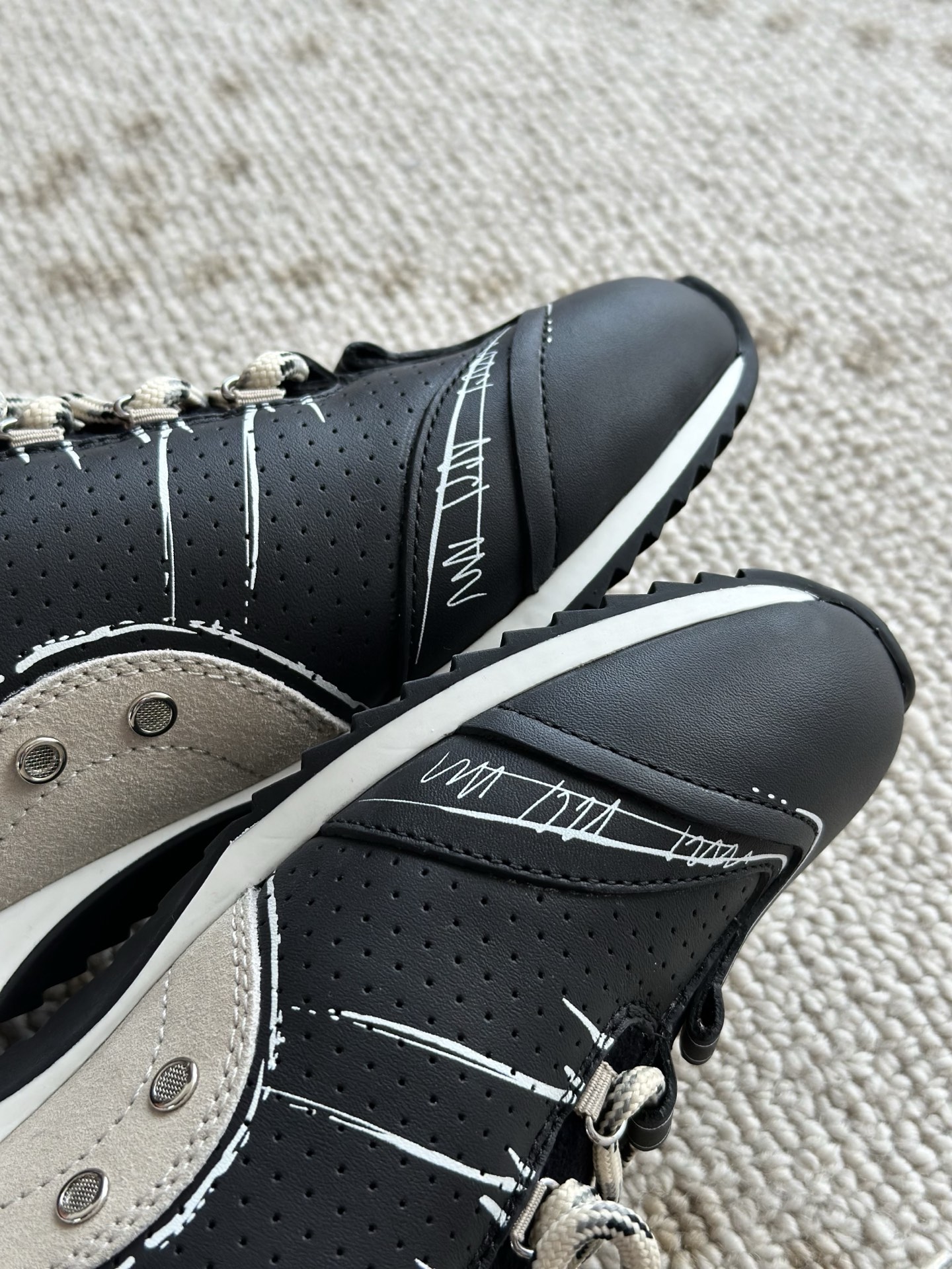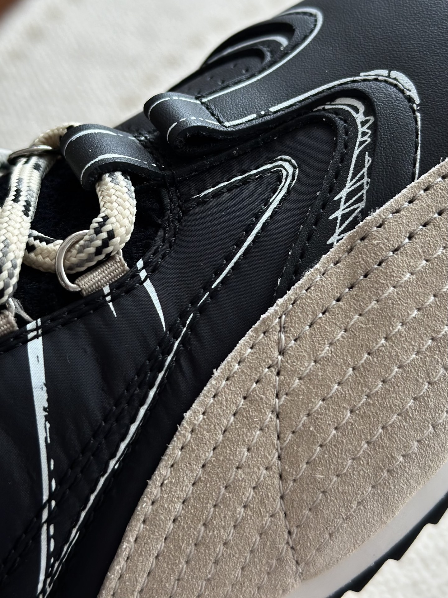原厂面料!方方面面透露着贵气! 拼接反绒牛皮细节用的都是最好的皮料 肉眼可见的纤细绒感 其次就是科技布面料,厚实且轻盈透气 市场货厚硬不透气,要么就是太薄显廉价 正品一对比就露怯!天壤之别