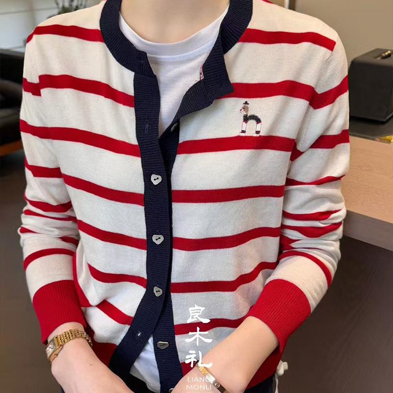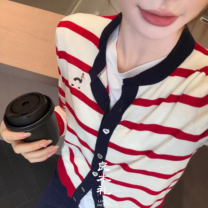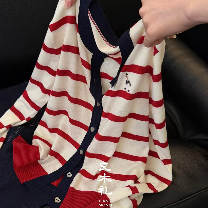 【不换不退】良木礼韩系时尚条纹撞色圆领开衫(1285)