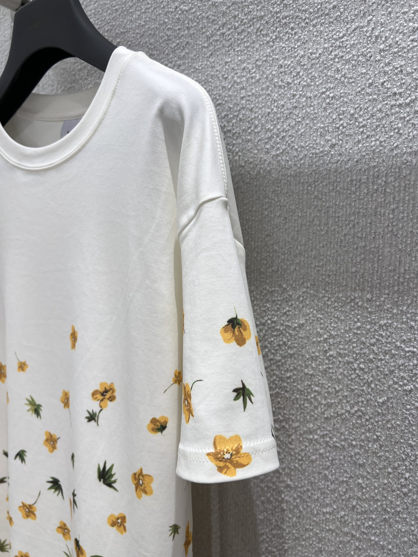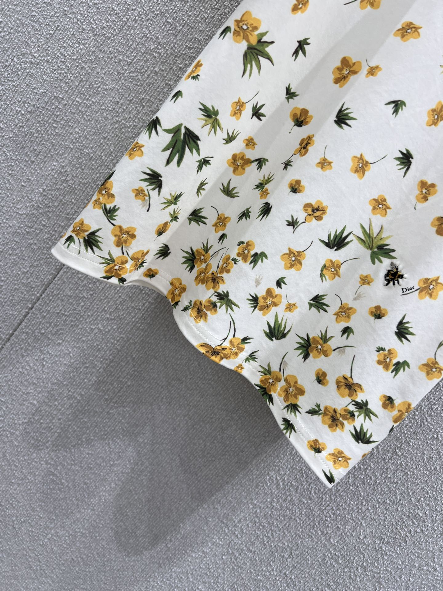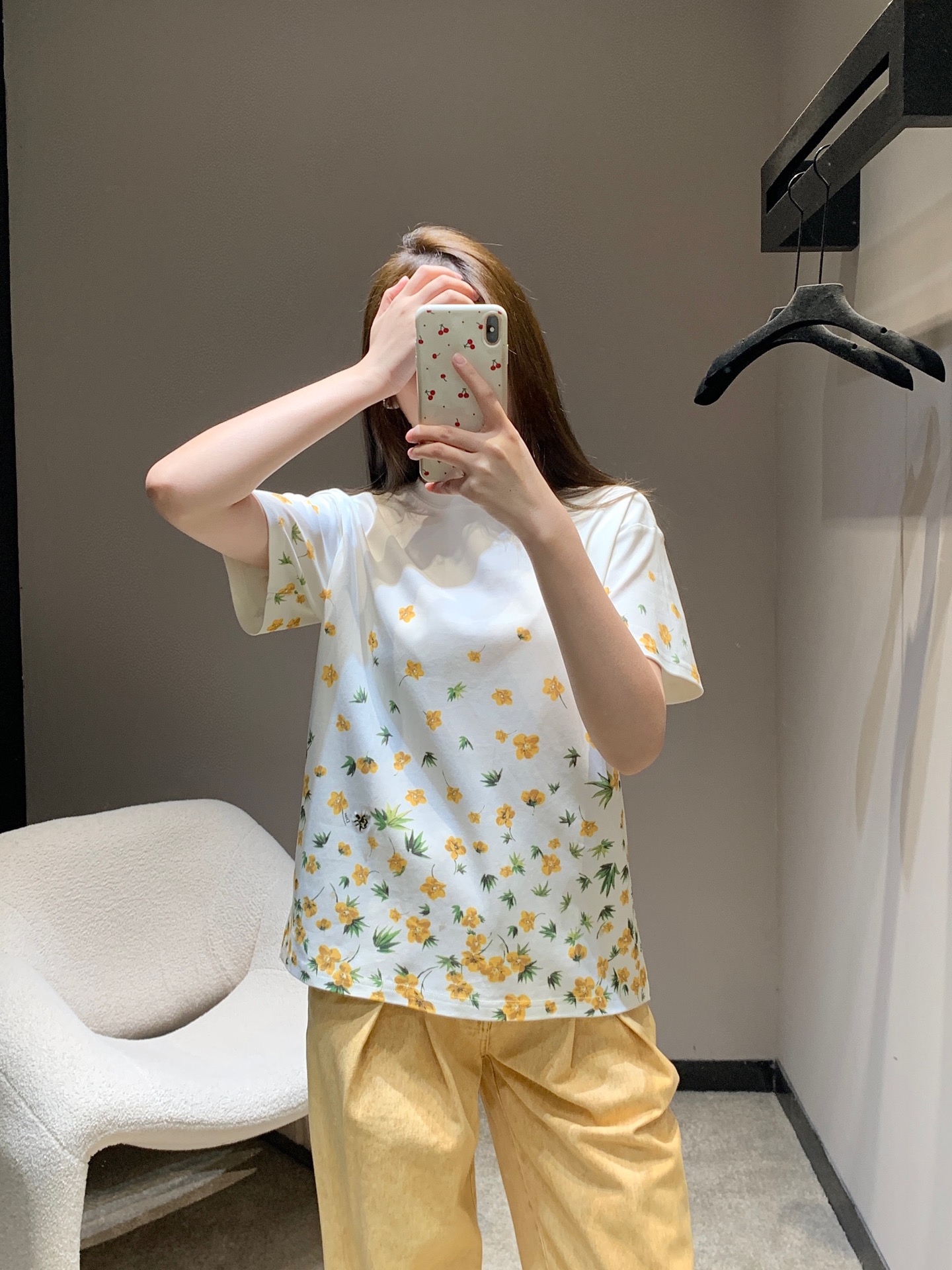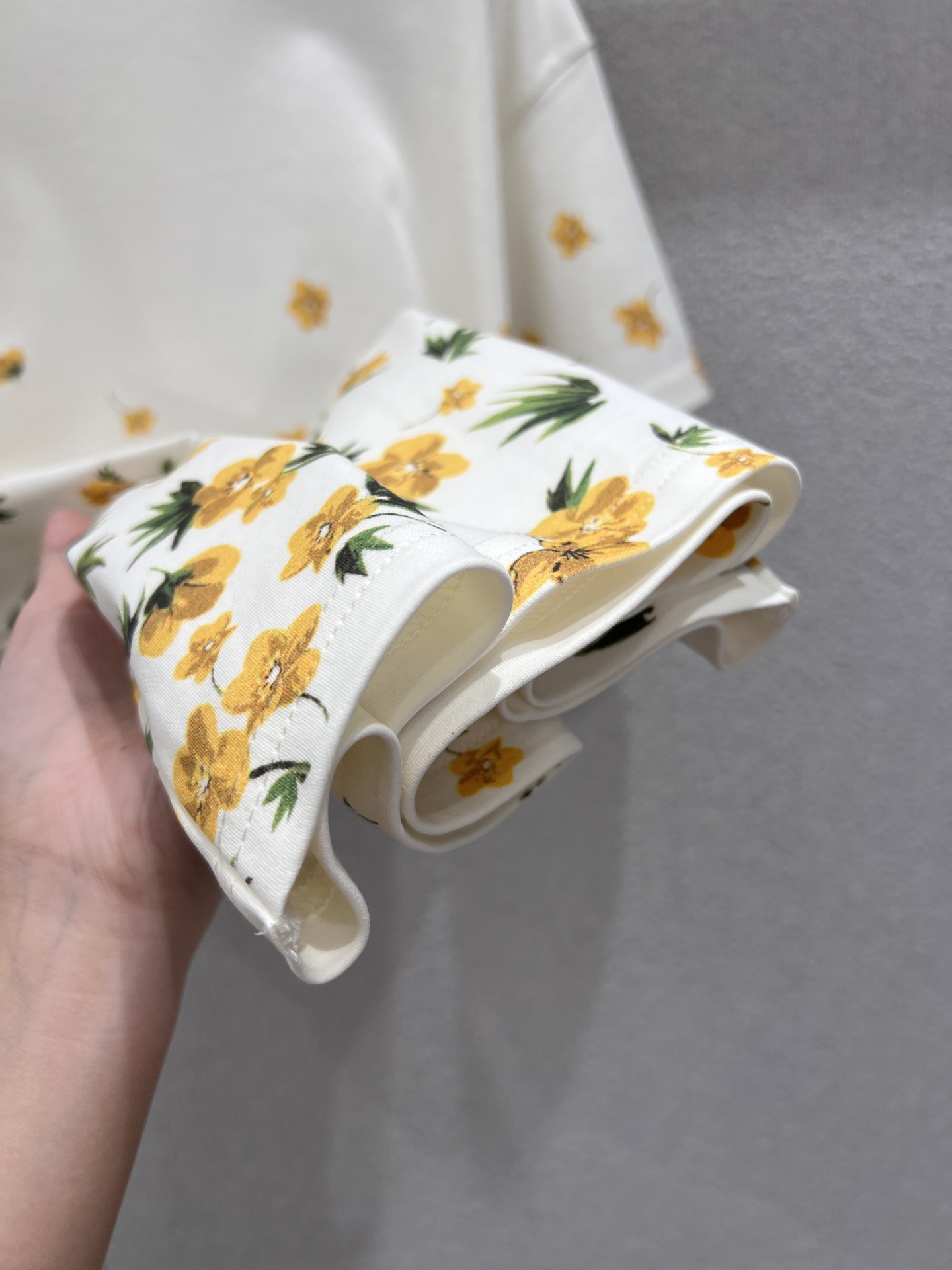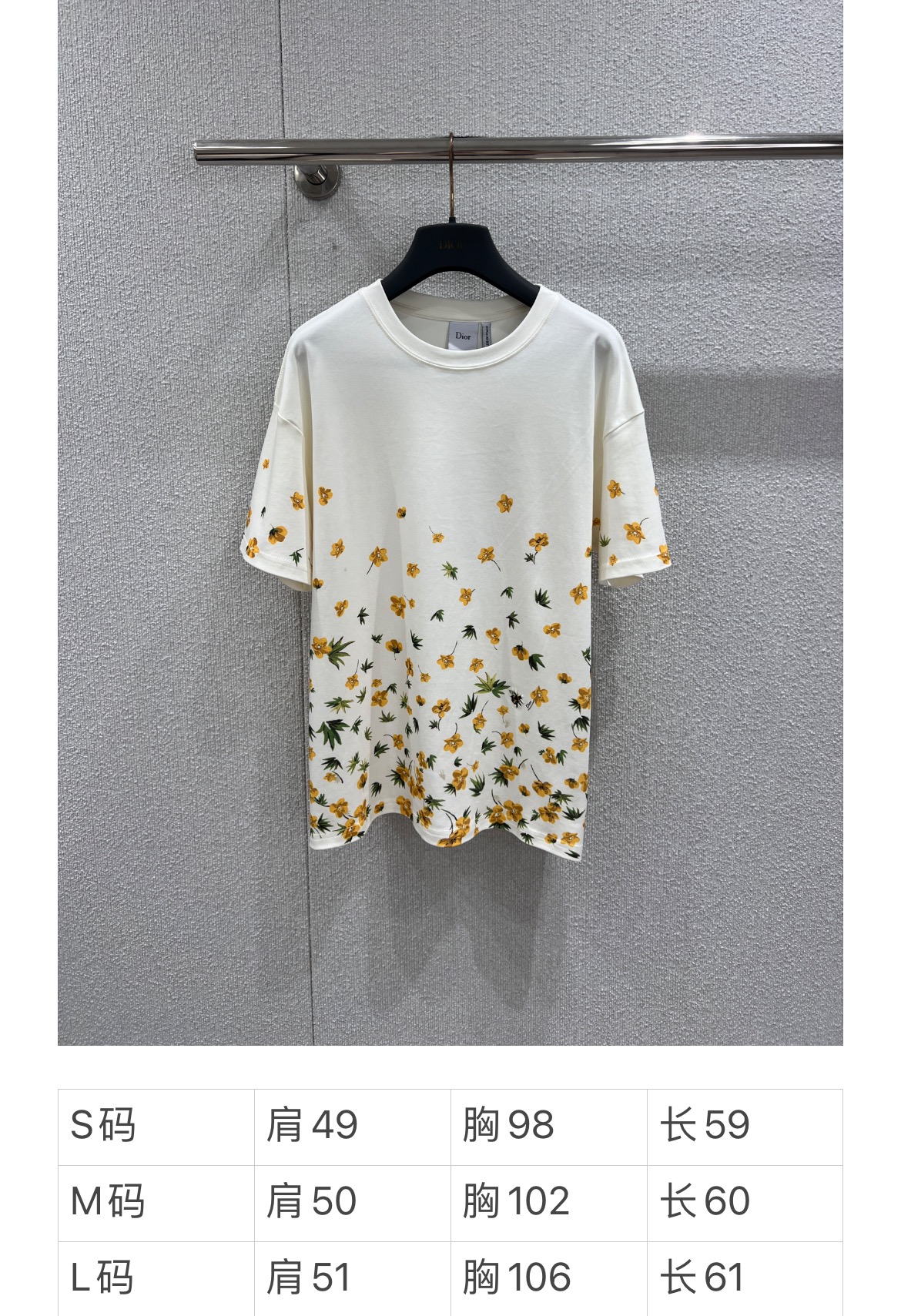 Dio* 26Ss早春新款 碎花圆领短袖T恤丨⚠独家yb开发!顶级高版出品!甄选高支精梳棉面料,触感柔软透气,经典圆领贴合颈部线条,宽松的短袖廓形带来无束缚的穿着体验。错落分布的黄色碎花搭配嫩绿枝叶,从领口延伸至下摆,细腻的印花工艺让图案鲜活立体,后背纯净的白底色形成视觉反差,简约中暗藏设计巧思。现货发售S/M/L