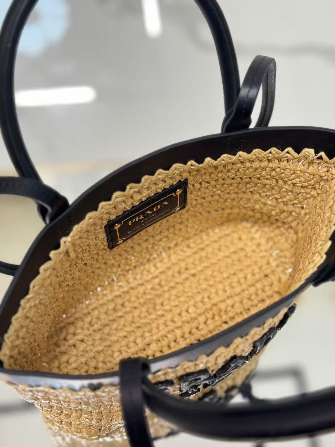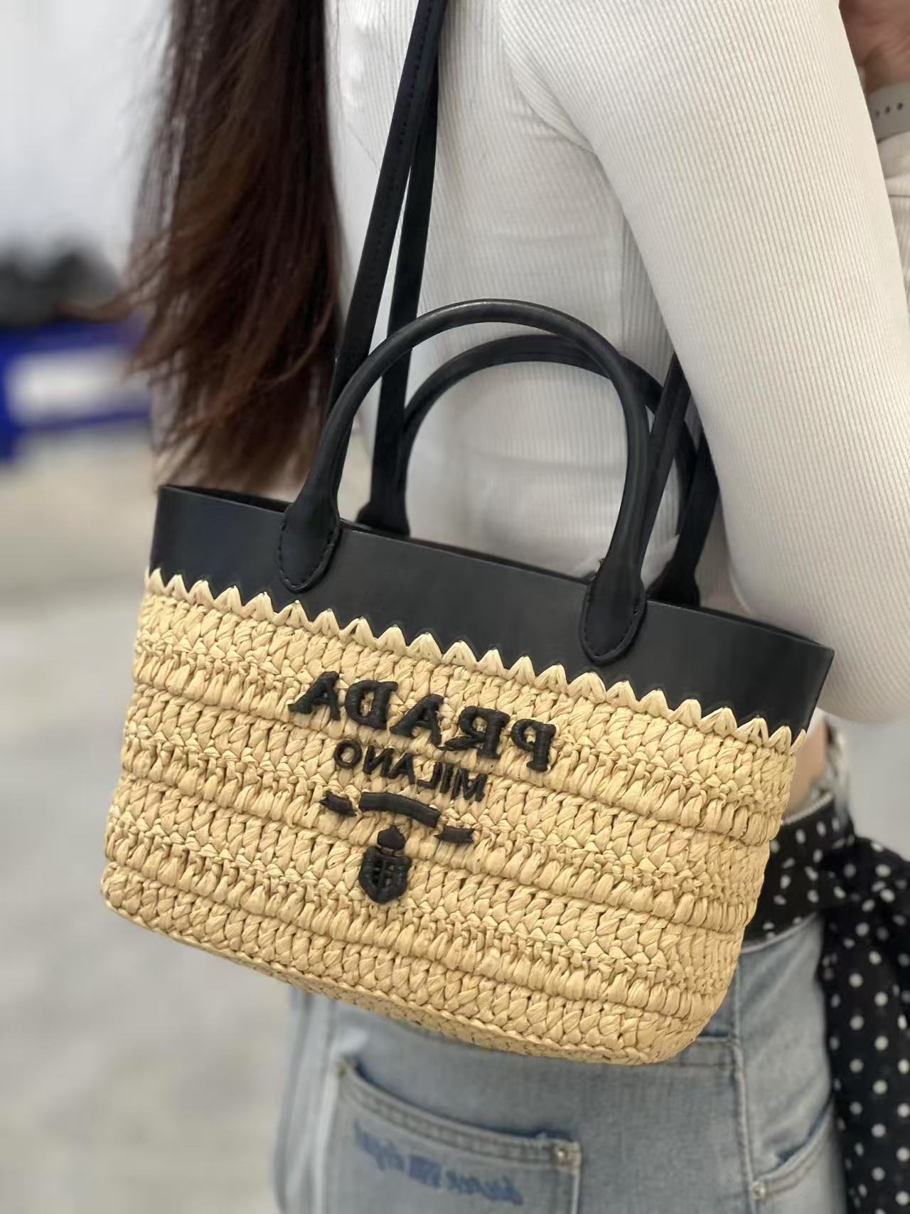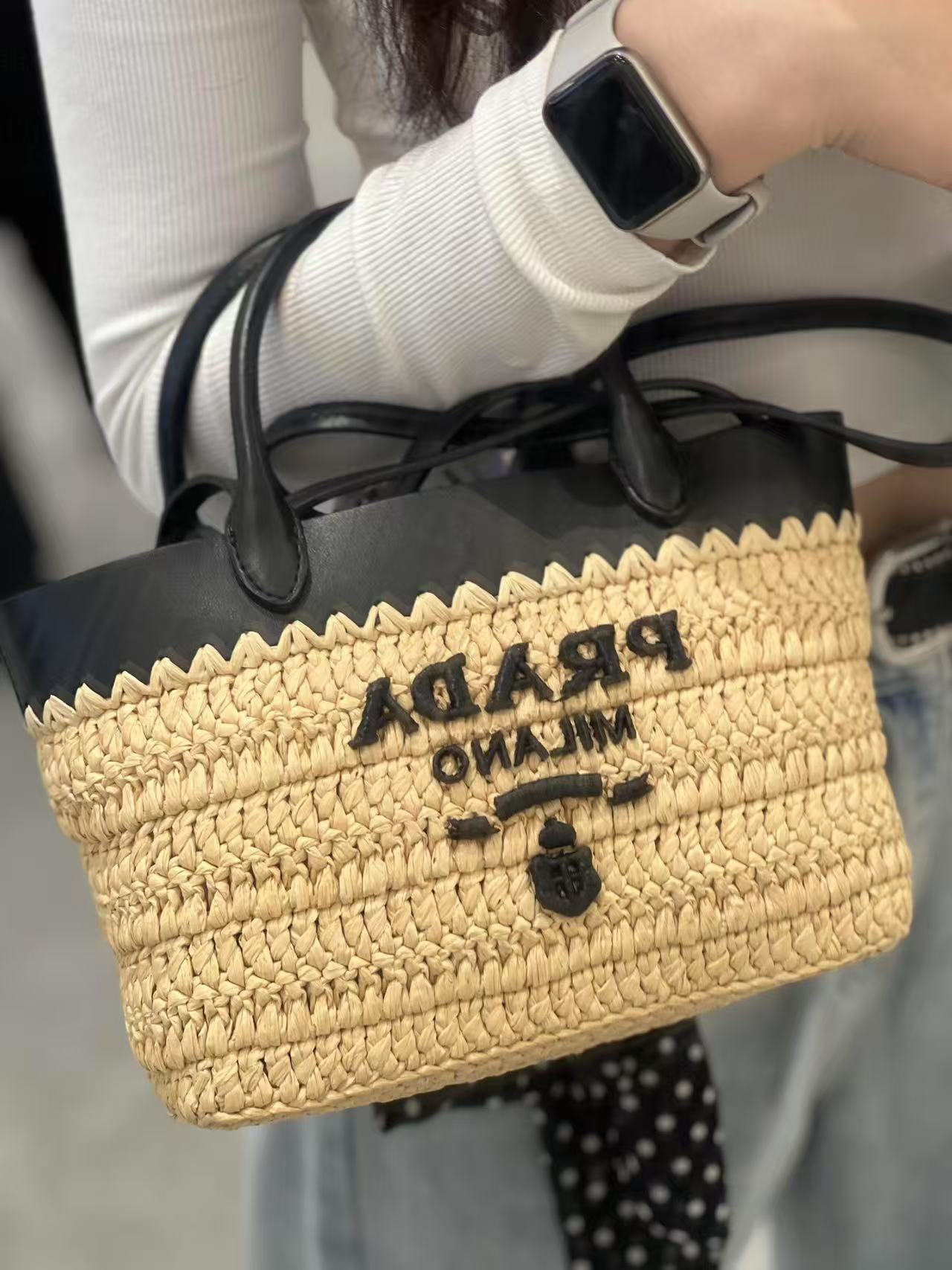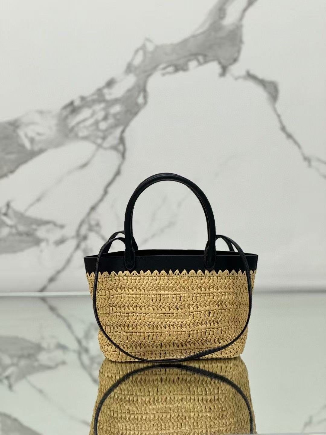 顶级原单 (小号) 新款草编迷你托特包,这款现代而精致的迷你托特包结合钩编工艺和皮革细节,营造出夏日氛围。牛皮双提手,可用作手提包或单肩包,正面饰以撞色刺绣字母徽标,增添辨识度。精致的编织包身散发出浓郁的春夏气息啦~简单背着就能赋予无与伦比的高级质感啦,空间容量大,又是一个经典爆款啦