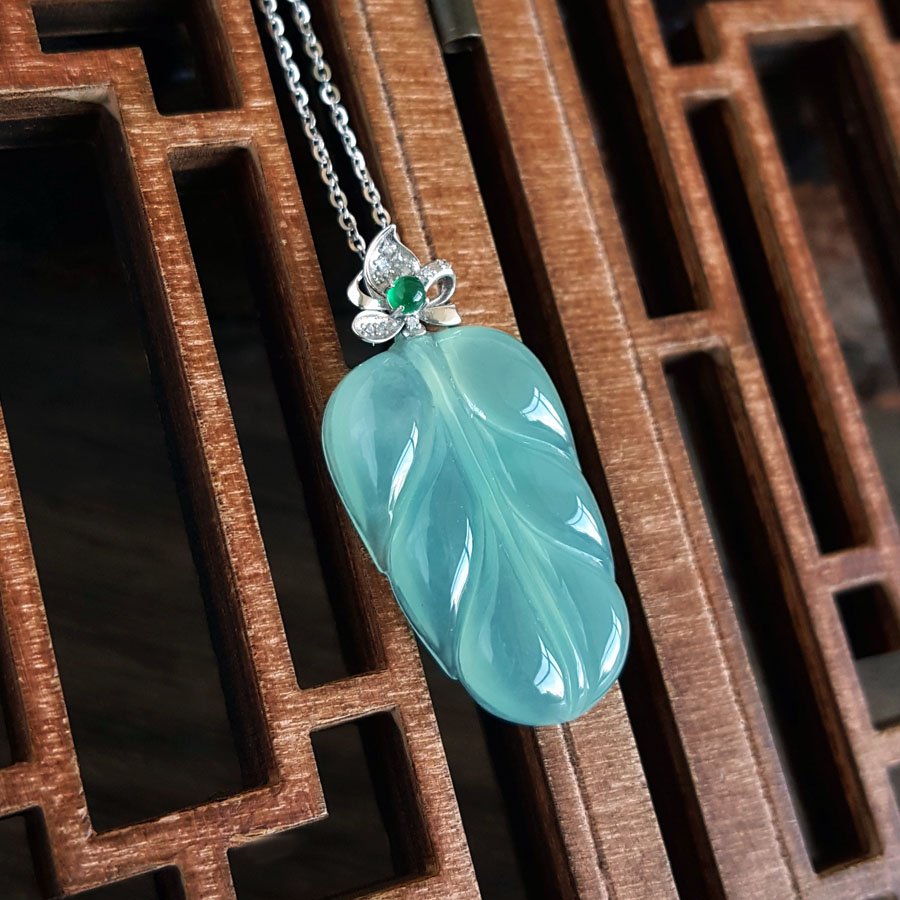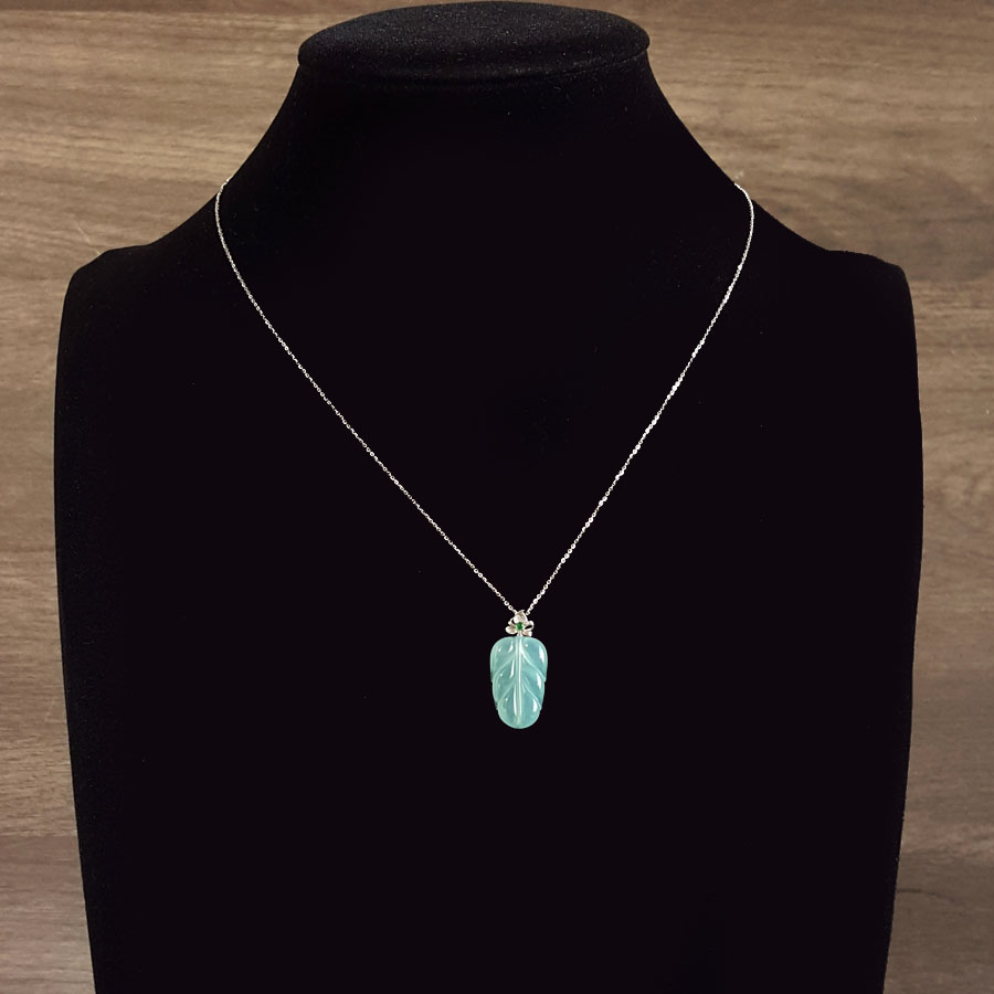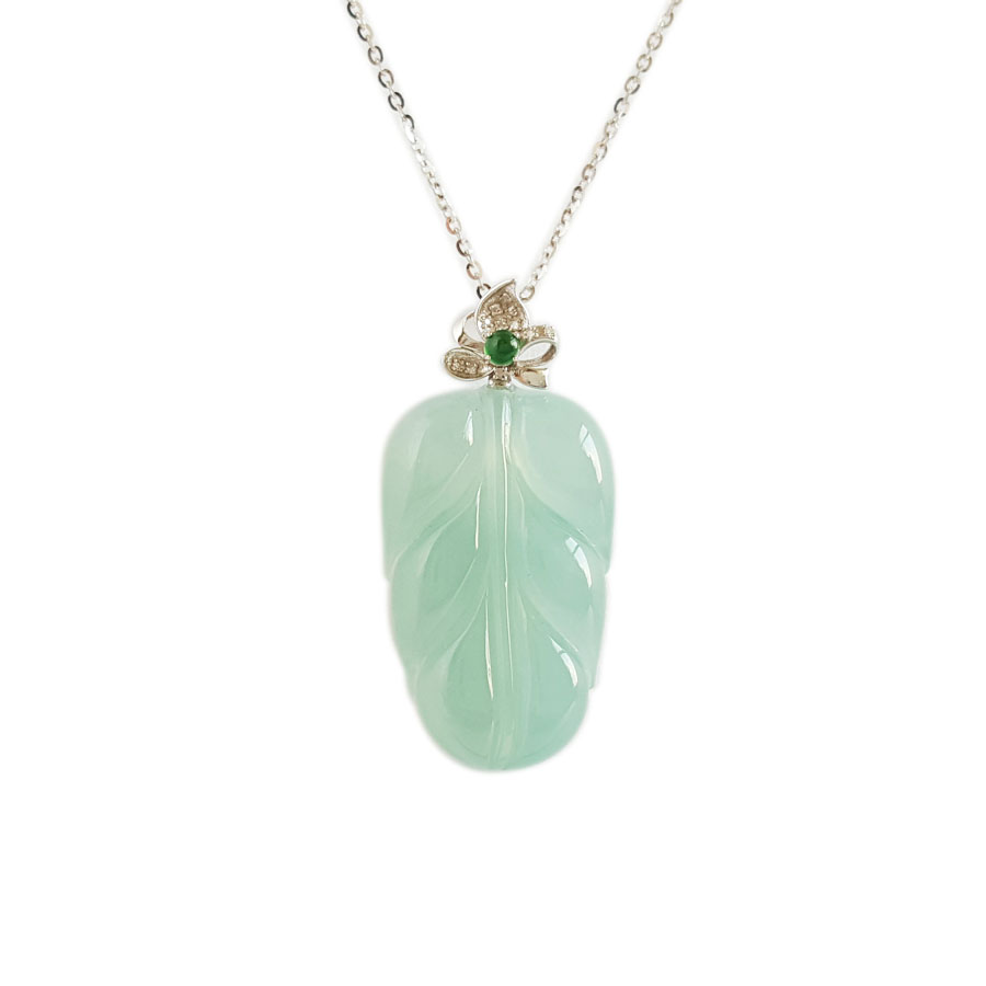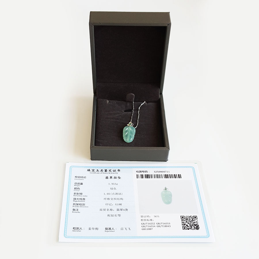 名称 | AU750白金镶钻镶天然细腻晴水冰种叶子(金枝玉叶)翡翠吊坠项链 |
