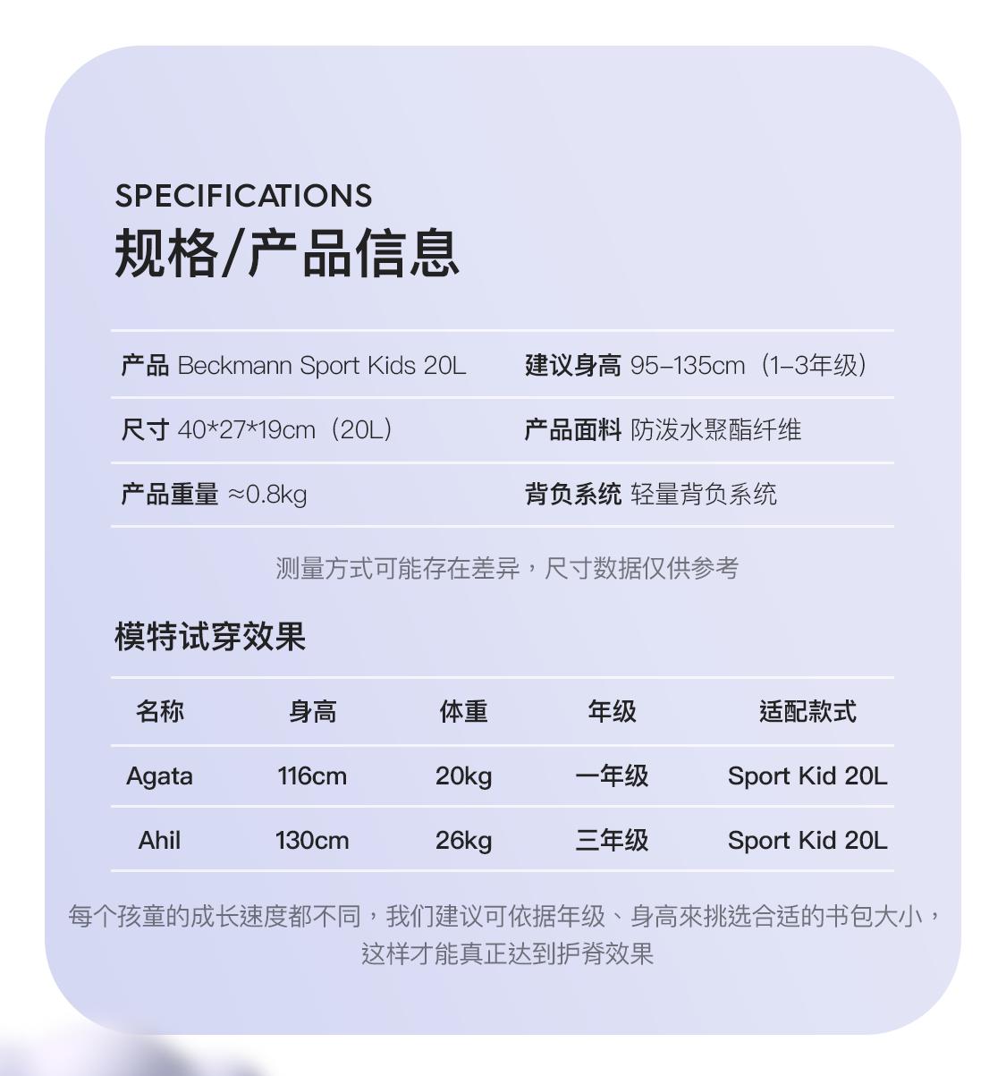 20L挪威beckmann贝克曼儿童背包女男孩1-3年级小学生减负护脊书包