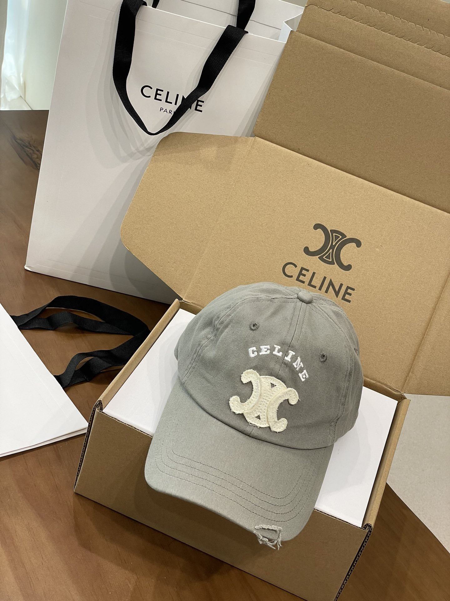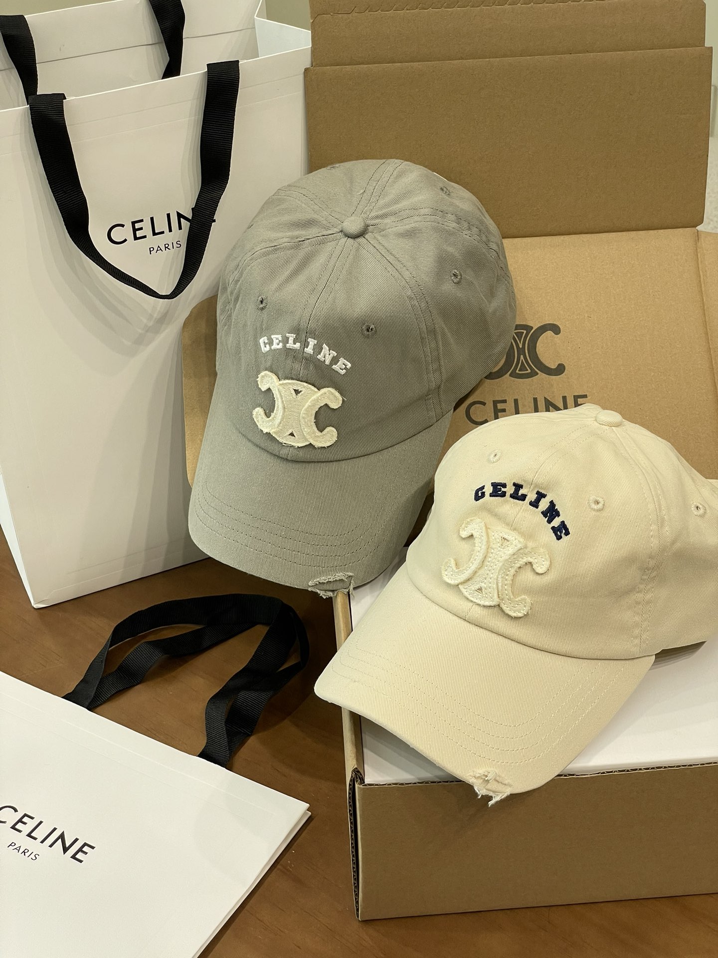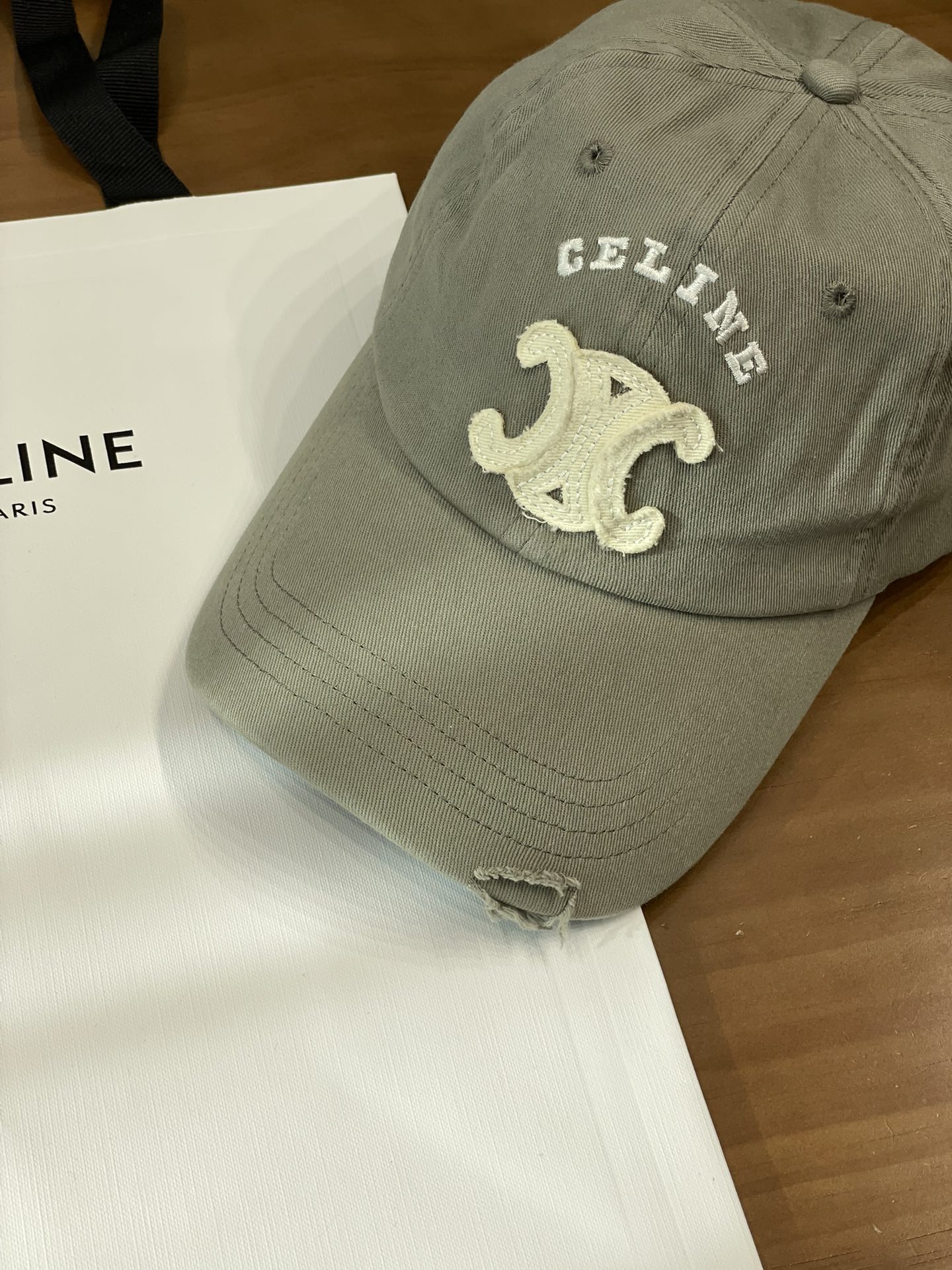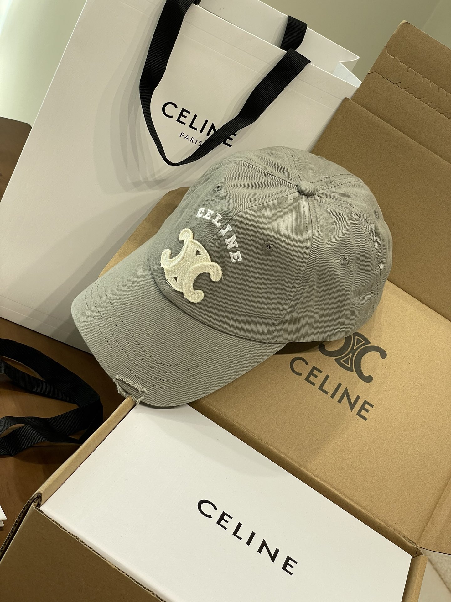 Celine棒球帽 | 经典与潮流的完美融合 配双盒定制包装 (无手提袋) Celine新款棒球帽 蓝色的活力、黑色的酷帅、米色的温柔、灰色的质感 ,每个颜色都超绝,适配各种穿搭风格。 标志性的Celine logo刺绣精致立体,彰显品牌格调,帽檐处微微的破洞设计,增添了不羁的潮流感,复古与时尚并存。帽型挺括,修饰脸型效果一流,戴上秒变小脸,还能营造出头包脸的氛围感。 不管是搭配简约T恤和牛仔裤,打造随性街头风;还是配上连衣裙突显优雅气质,这几款Celine棒球帽都能完美适配,成为造型的点睛之笔。日常出街、旅游拍照,有它们在,随手一拍都是时尚大片📸。