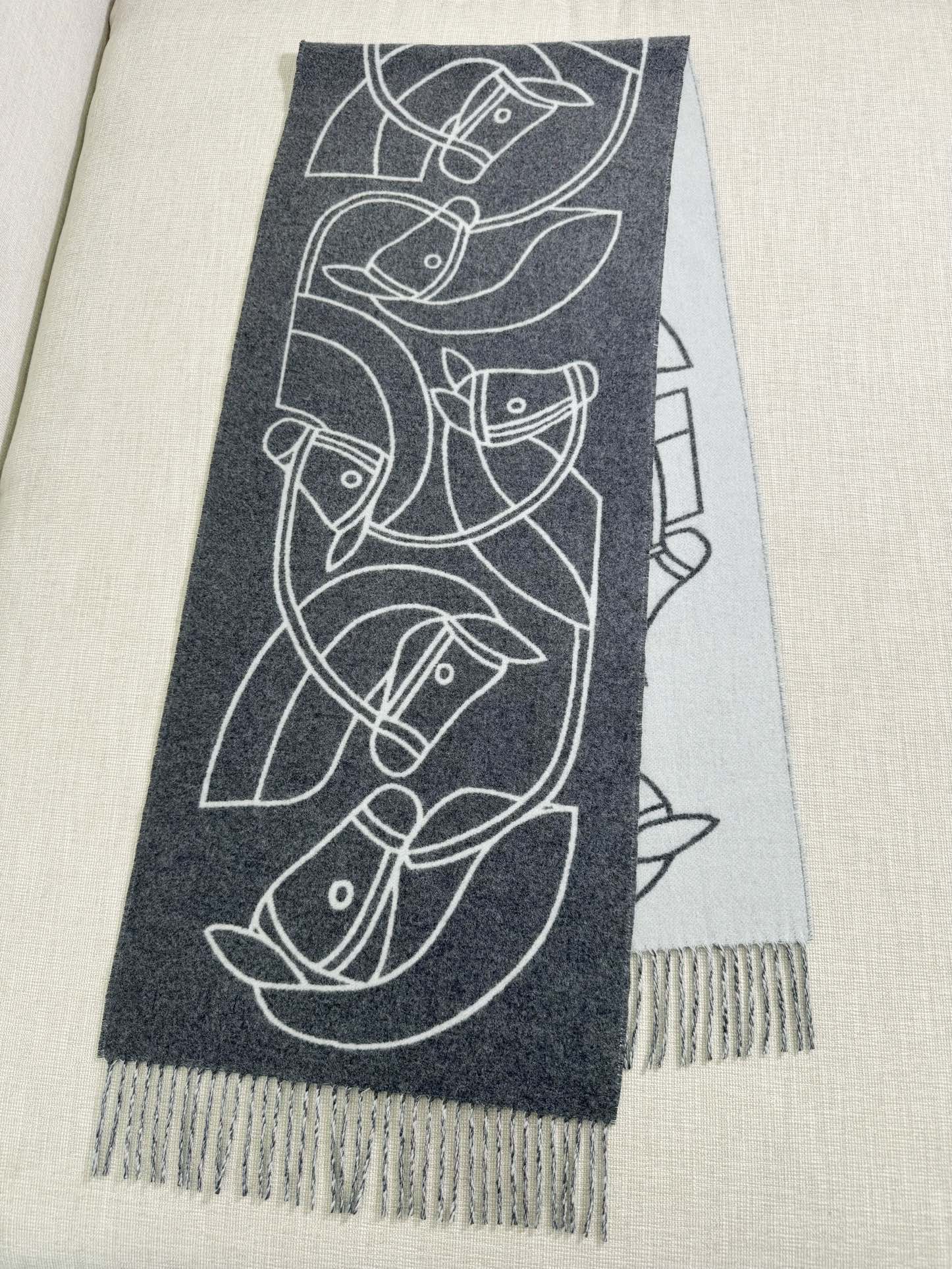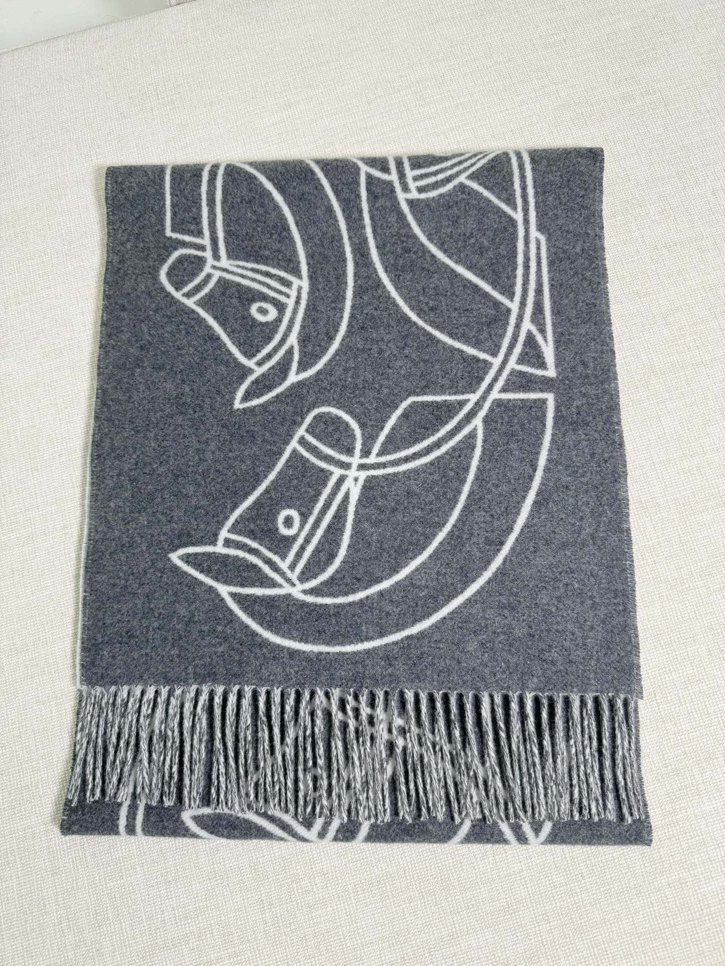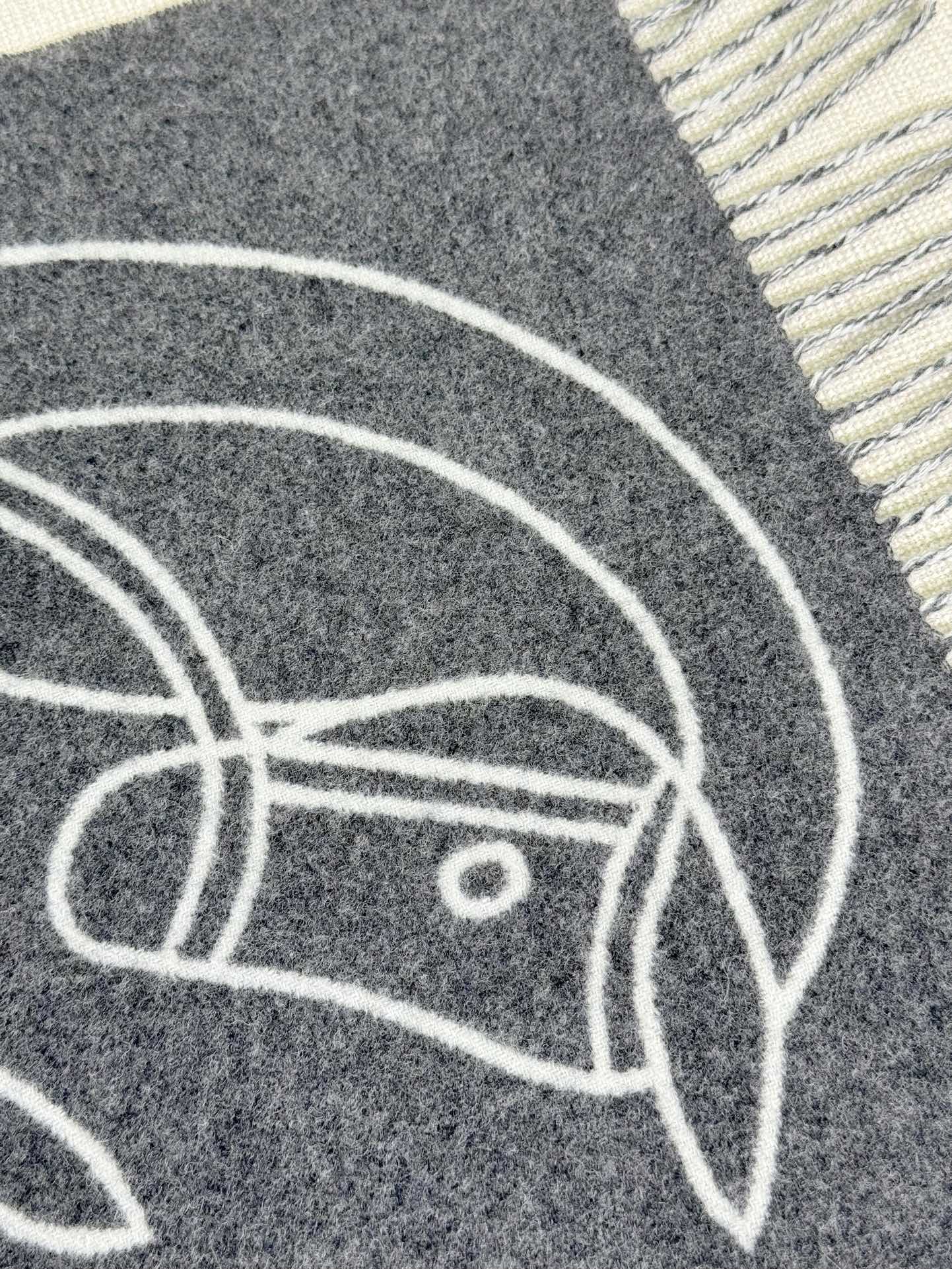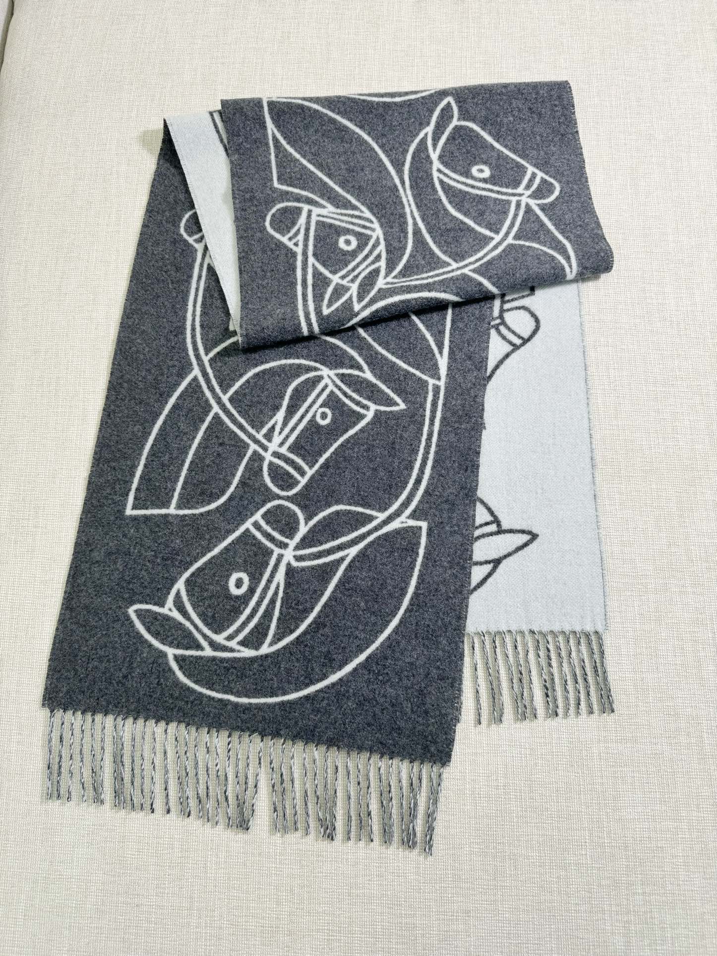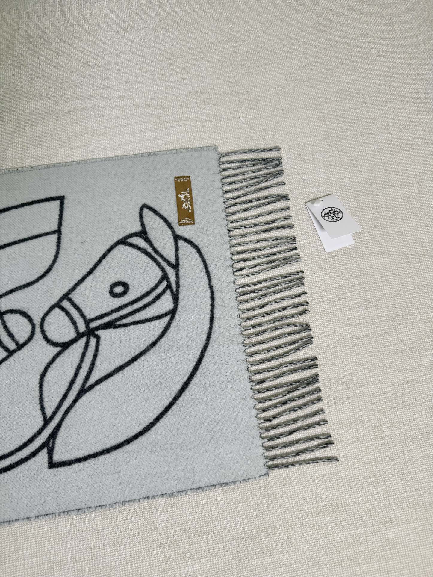 围巾双面配色,深灰面绅士冷艳+白色面高级奶颜 ,Geoff McFetridge设计的马术交织采用细腻的撞色提花编织,柔美简约的线条更具艺术感!保暖厚实纯羊绒大尺寸,超实用的中性款 男女适配