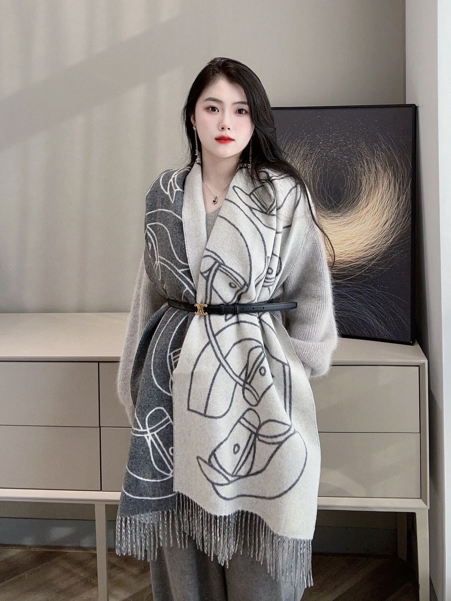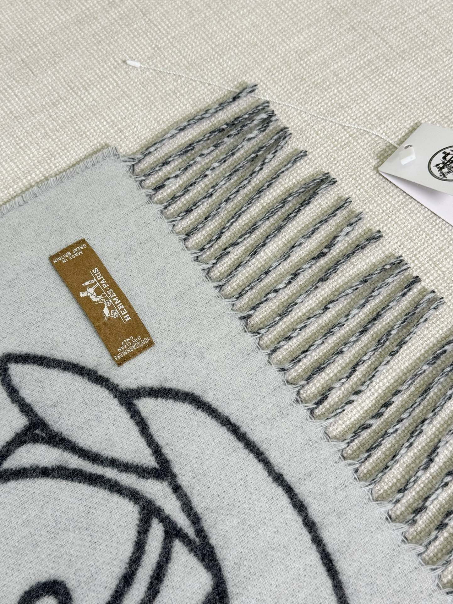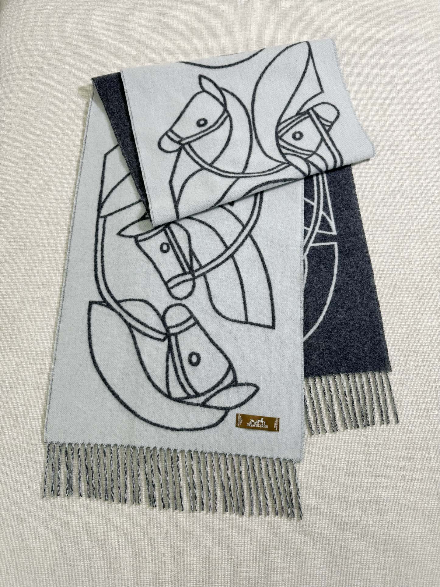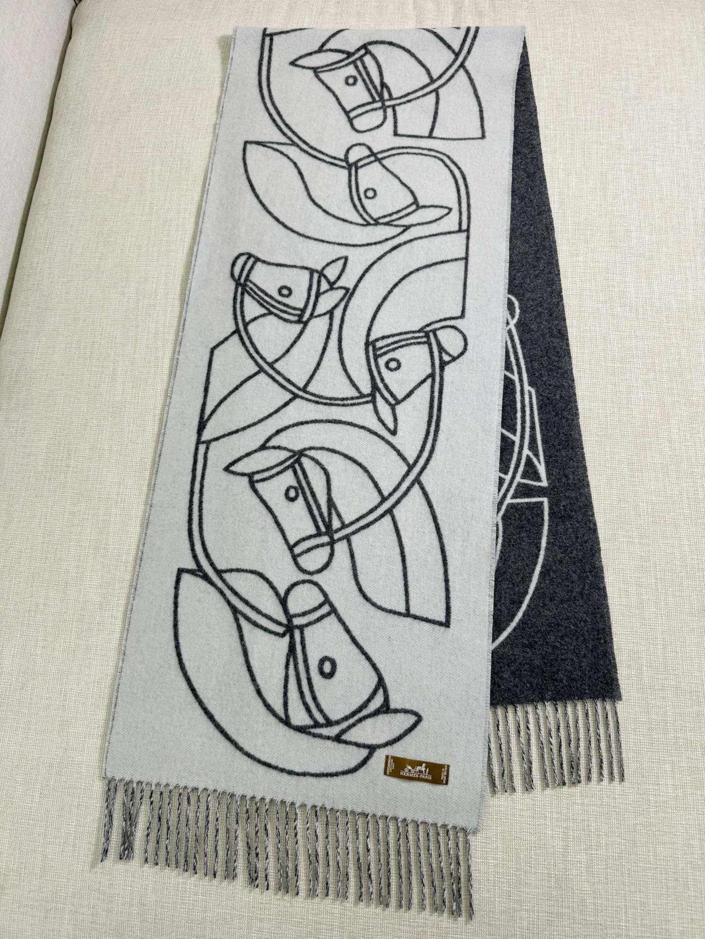 围巾双面配色,深灰面绅士冷艳+白色面高级奶颜 ,Geoff McFetridge设计的马术交织采用细腻的撞色提花编织,柔美简约的线条更具艺术感!保暖厚实纯羊绒大尺寸,超实用的中性款 男女适配