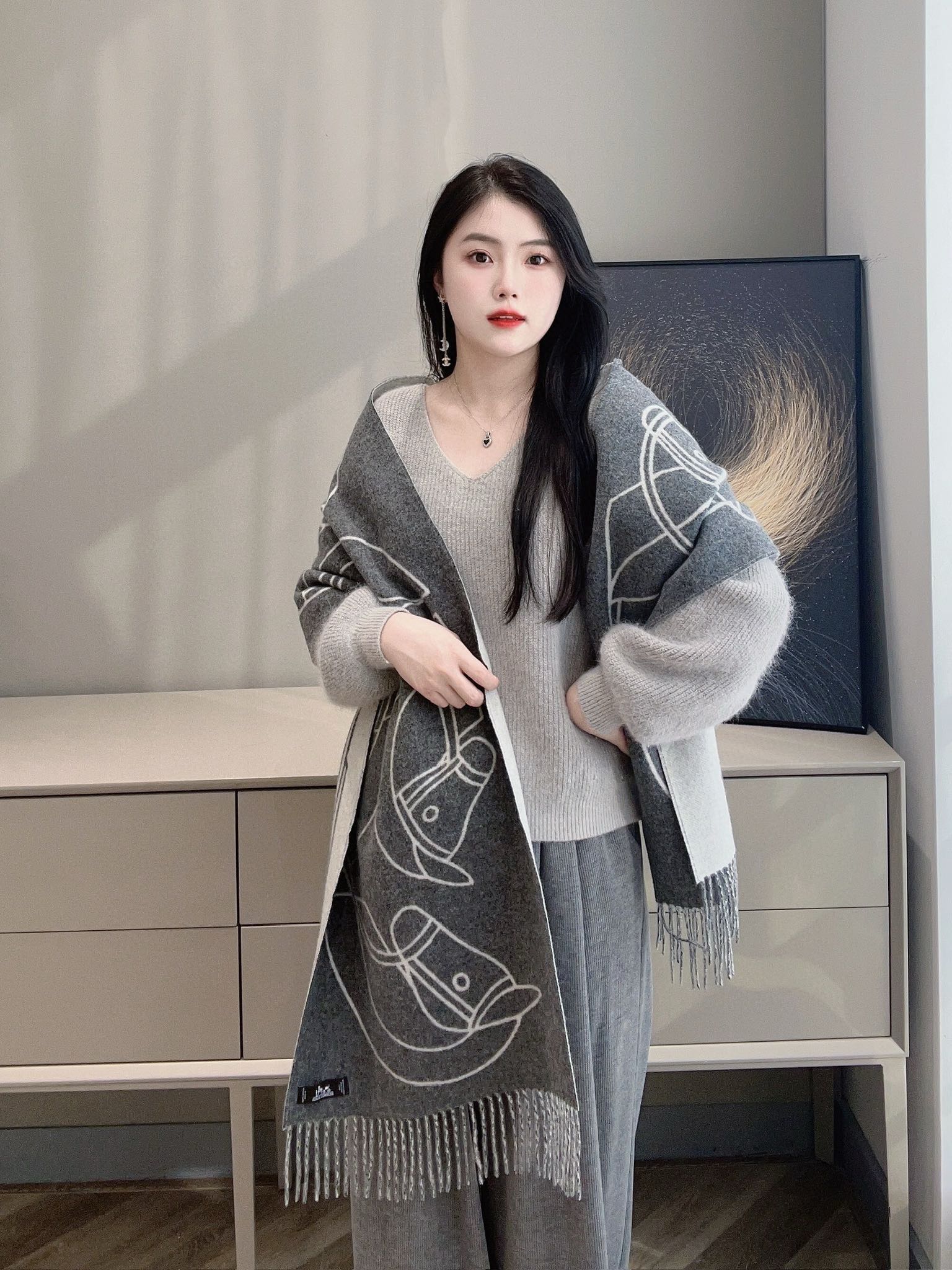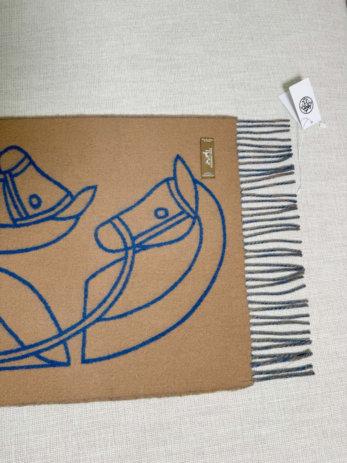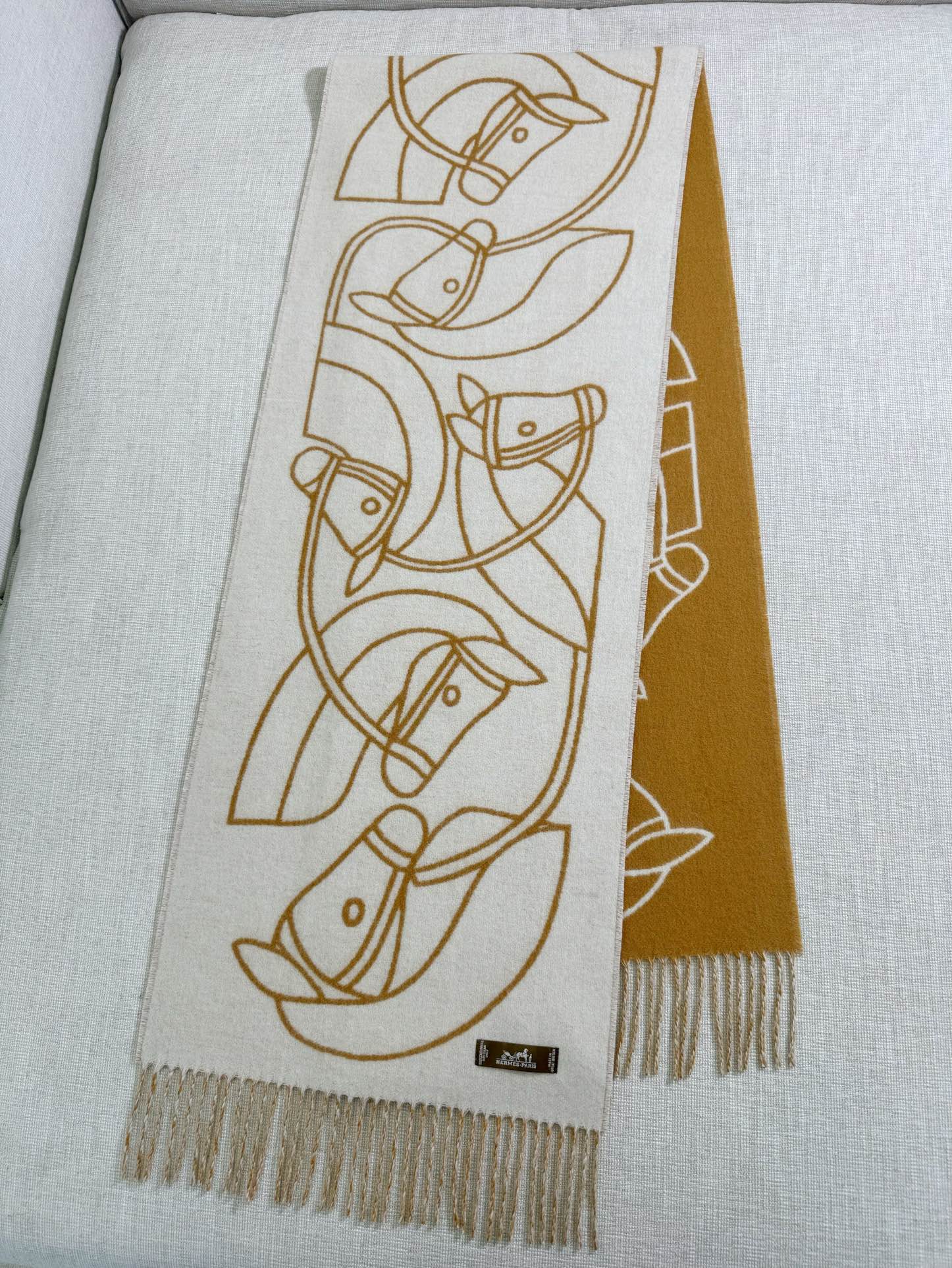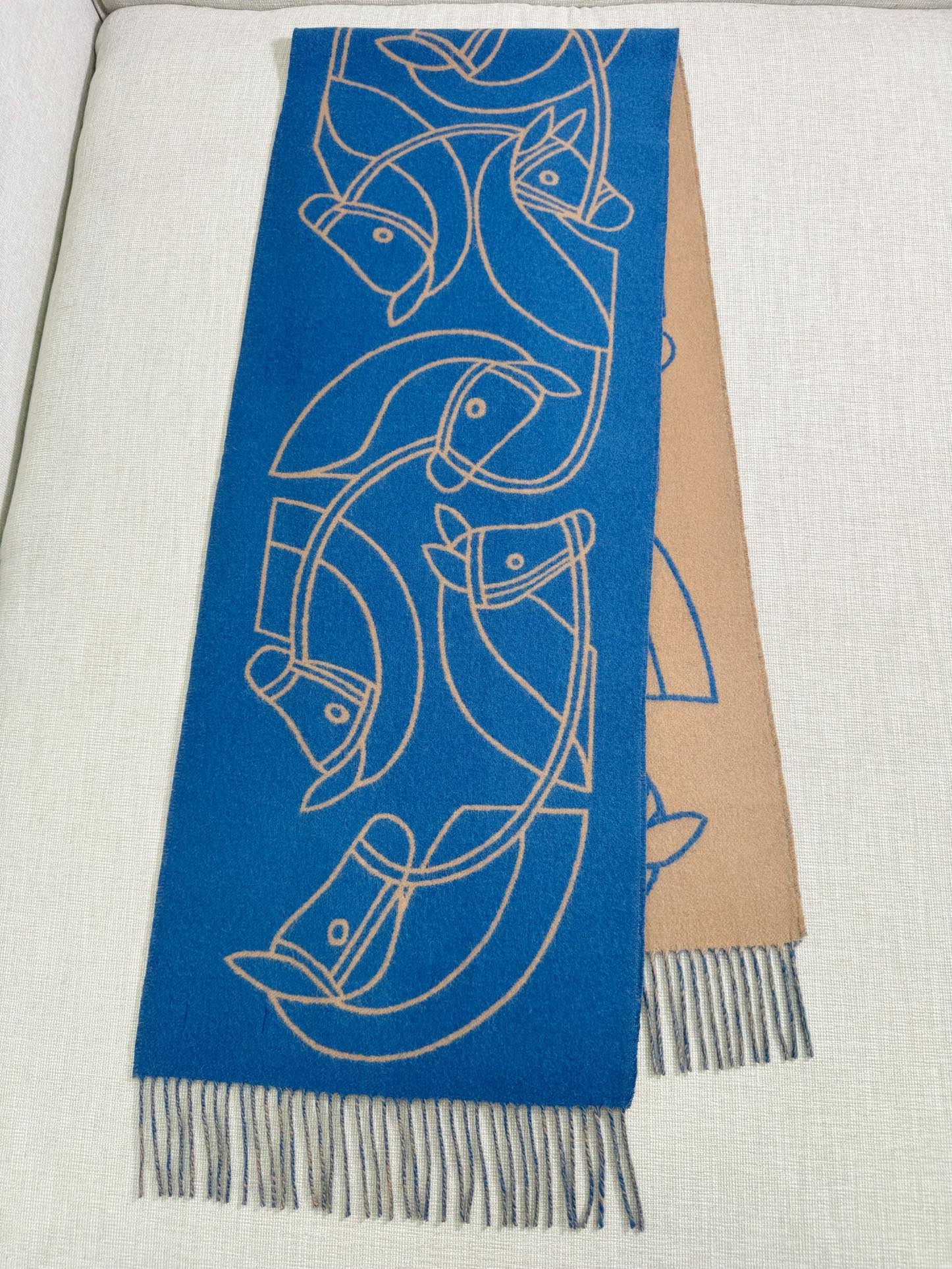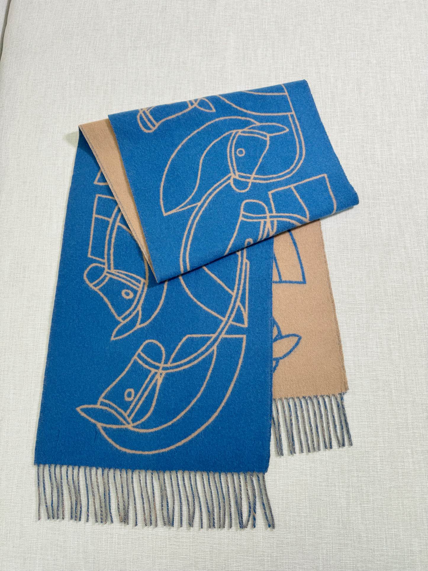 围巾双面配色,深灰面绅士冷艳+白色面高级奶颜 ,Geoff McFetridge设计的马术交织采用细腻的撞色提花编织,柔美简约的线条更具艺术感!保暖厚实纯羊绒大尺寸,超实用的中性款 男女适配