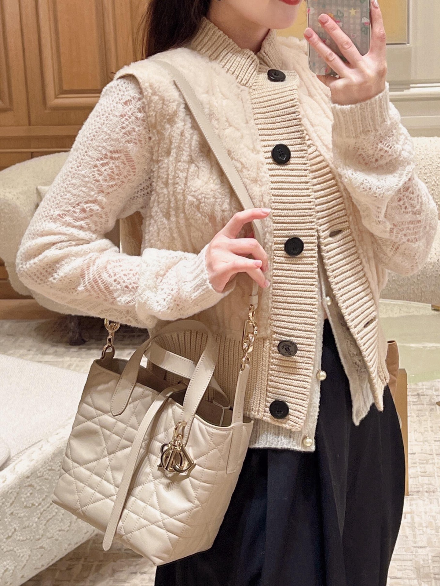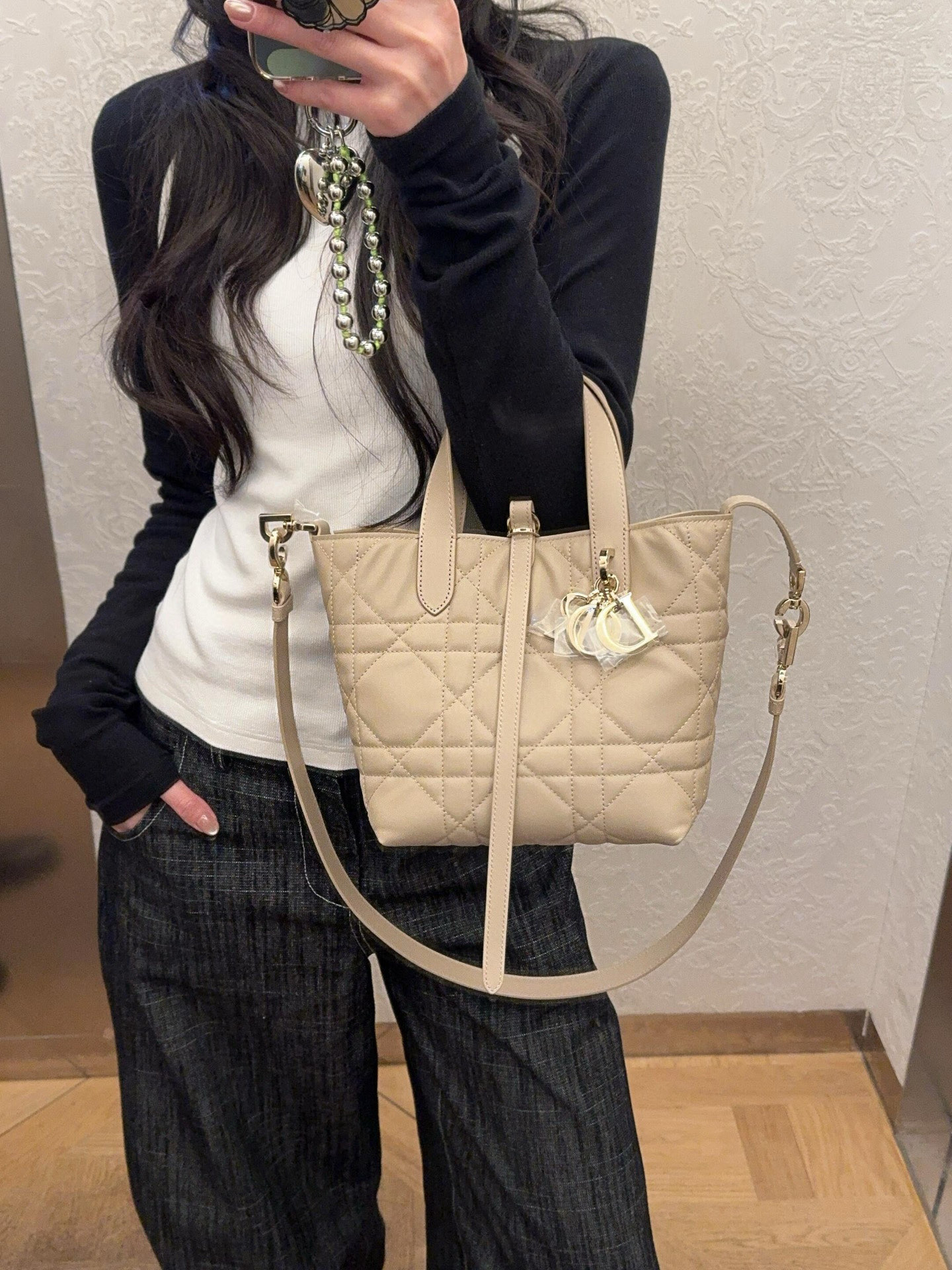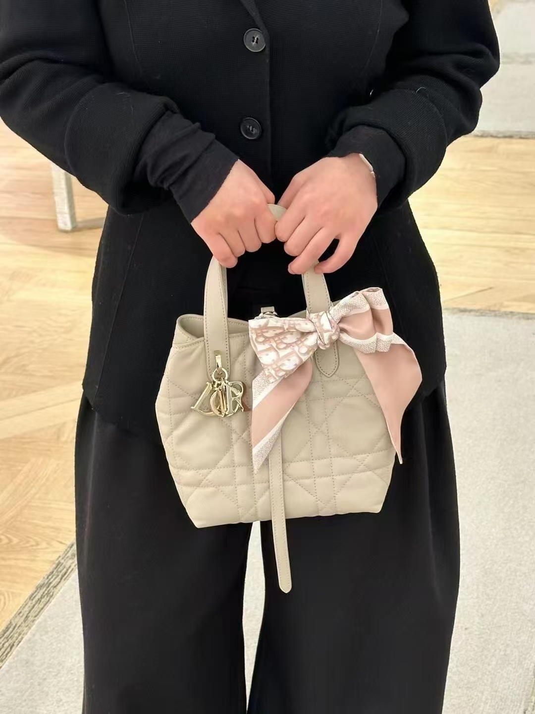 这款 Dior Toujours竖版手袋是二零二五早春成衣系列新品,时尚实用,别具一格。采用杏色牛皮革精心制作,饰以超大藤格纹缉面线,宽敞的内部隔层可收纳各种日常用品。设有纤细皮革系带开合,可安全收纳各种物品,另有CD Lock 字母D旋钮式扣环,可调节两侧,提升格调。小号款式,顶部皮革手柄搭配可拆卸的皮革肩带,可手提、肩背或斜挎