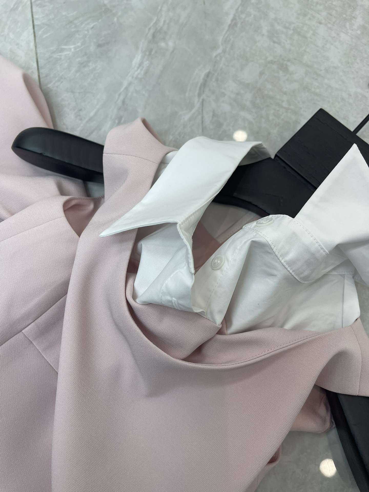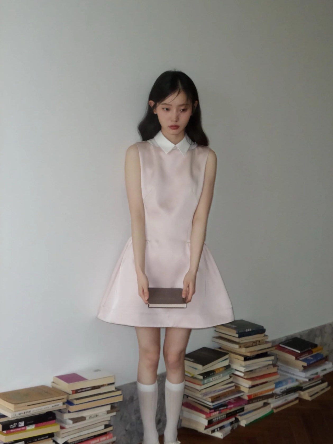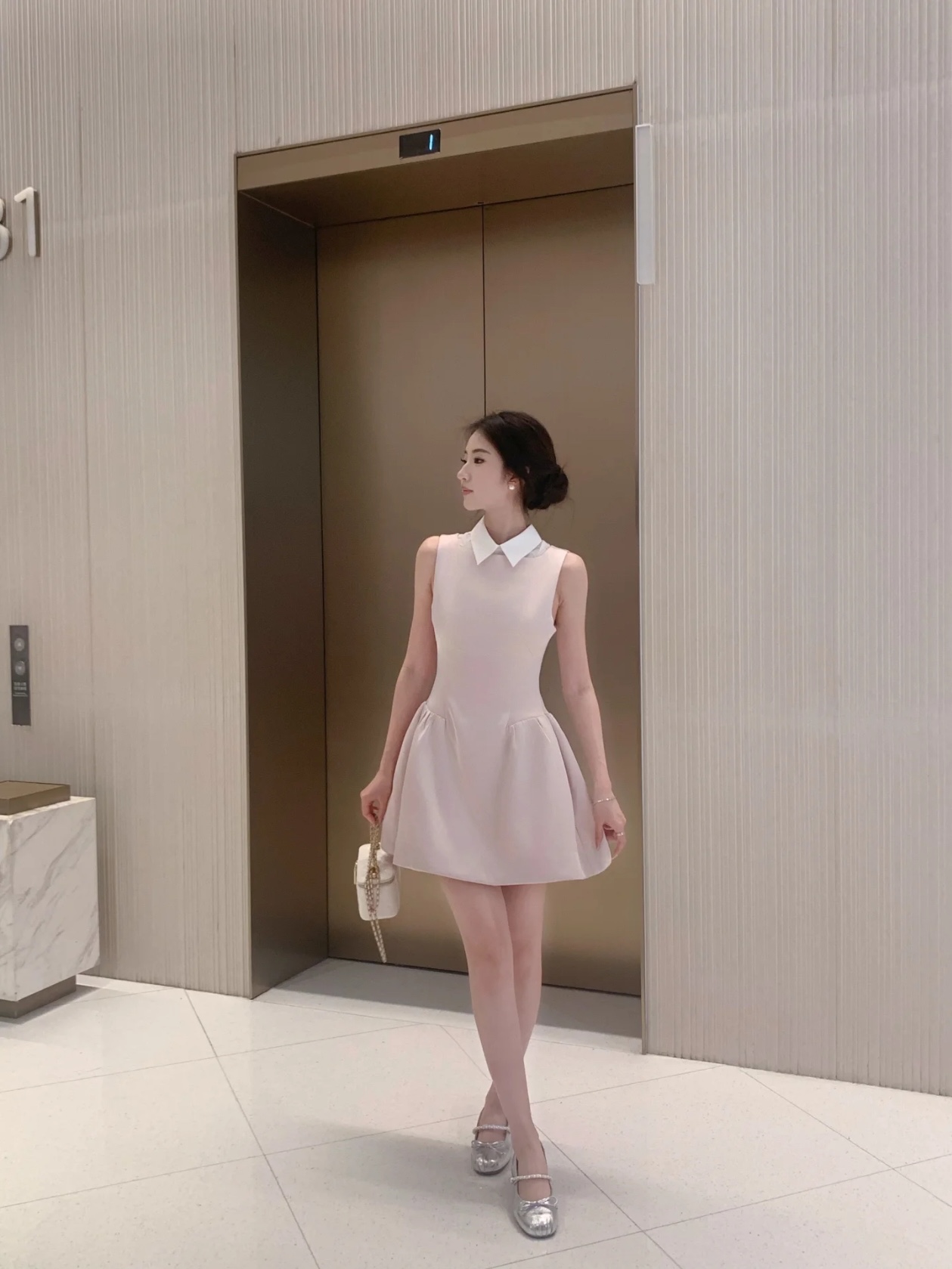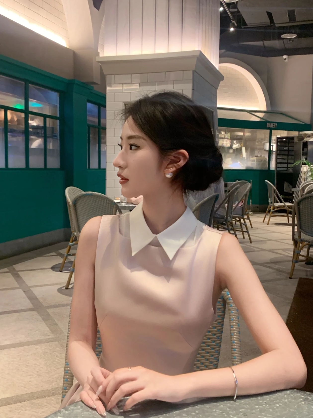 R家25春夏新品法式赫本风衬衫领假两件无袖连衣裙