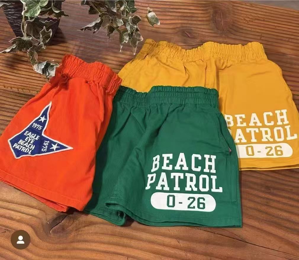 2025夏季DD儿童日系贴布刺绣海滩巡逻队徽章印花棉质休闲短裤