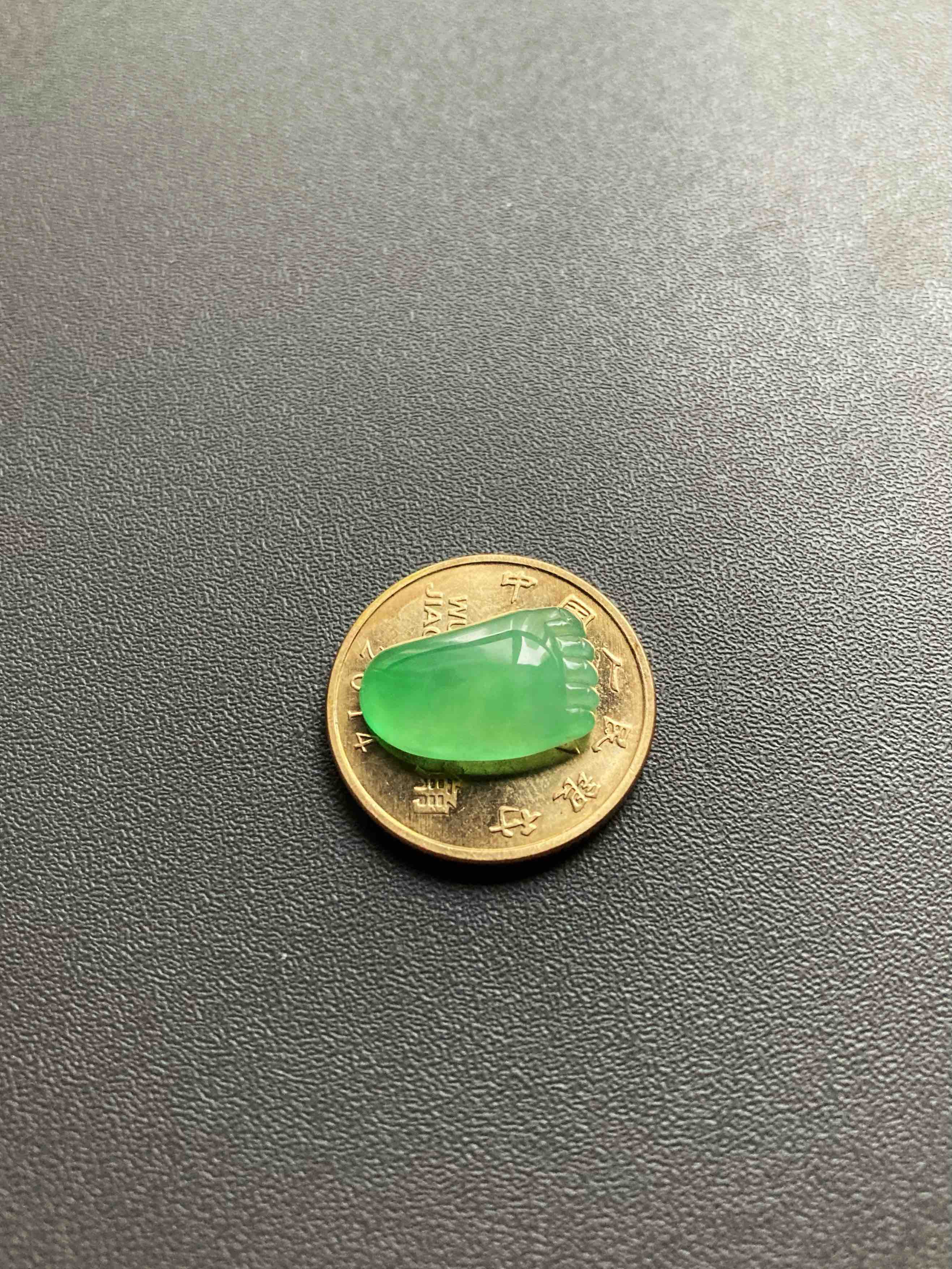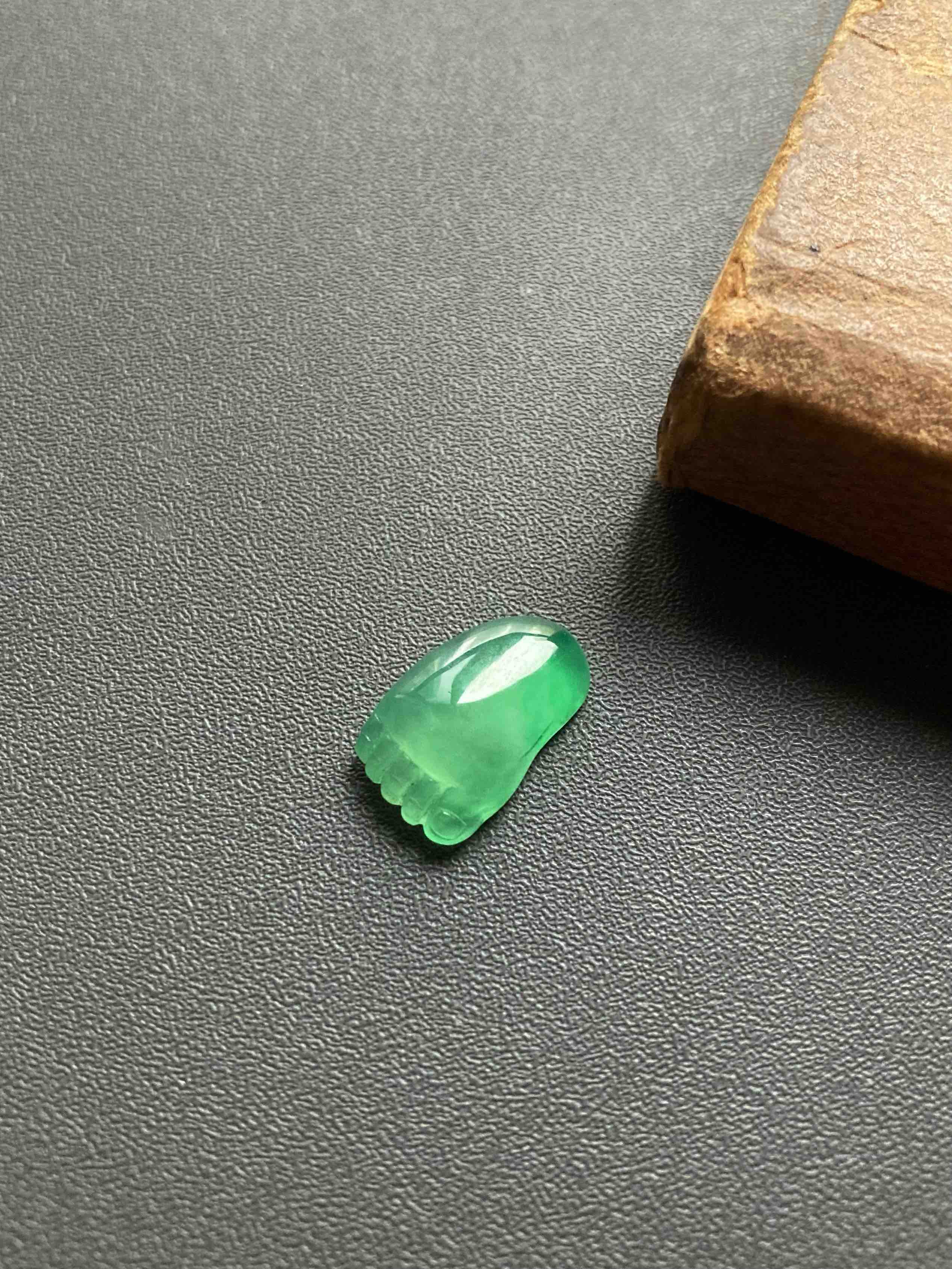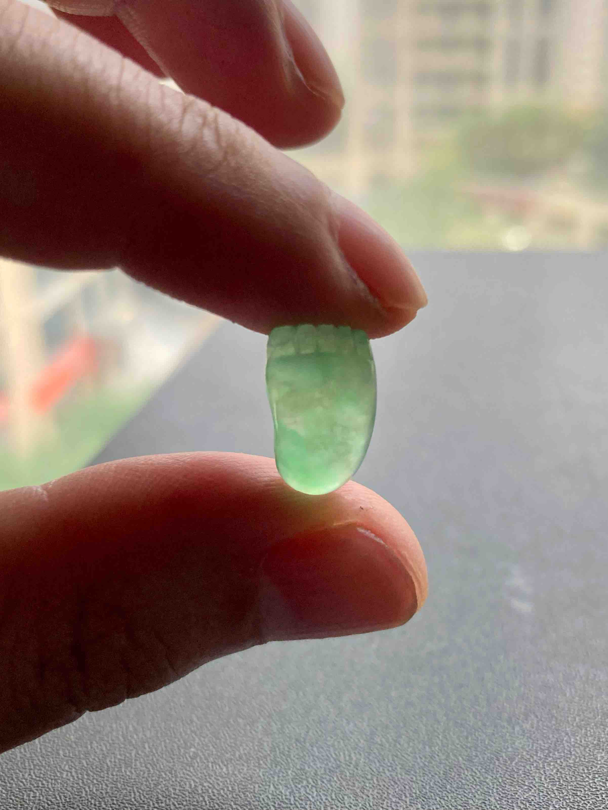 不可多得的好东西,冰种阳绿翡翠知足常乐,种色俱佳,阳绿艳丽,种水晶莹剔透,圆润饱满,雕刻精美,实在太漂亮了,侧面有点石纹藏得很好,最重要是只要小四价位,超划算,强烈推荐,14.7×9.3×4.6mm