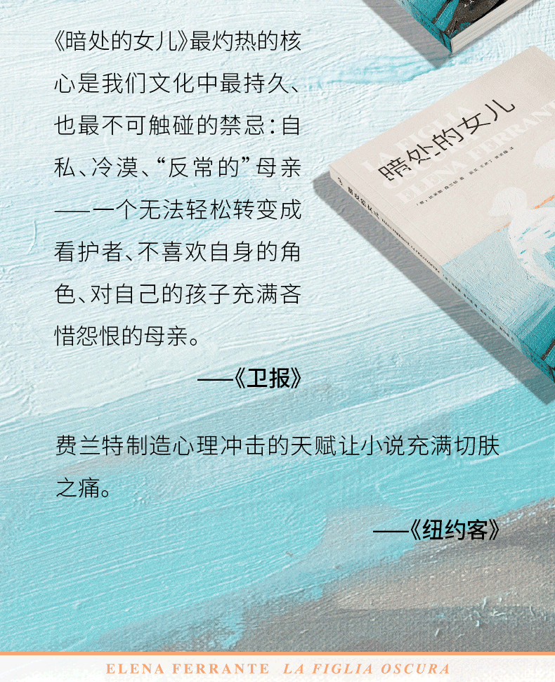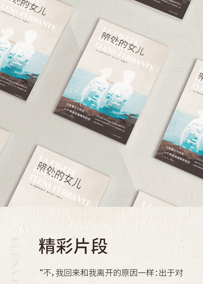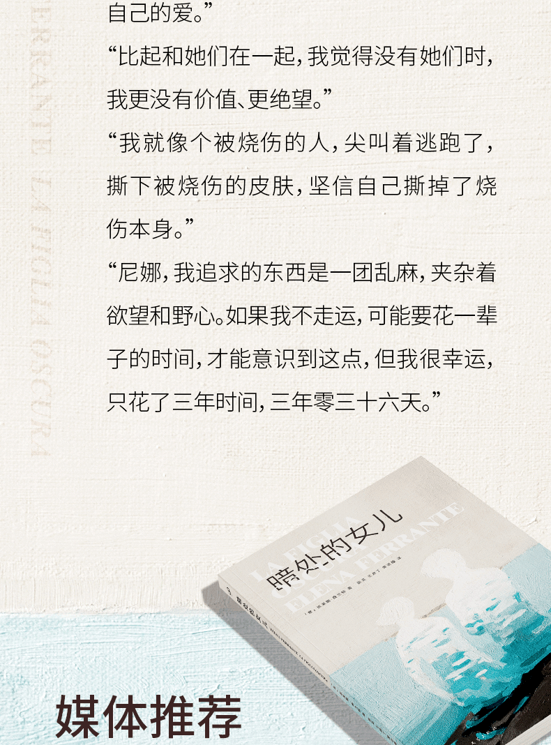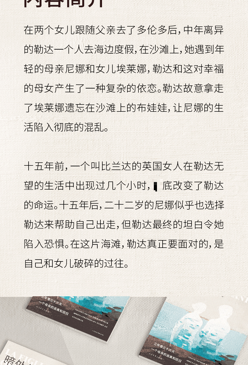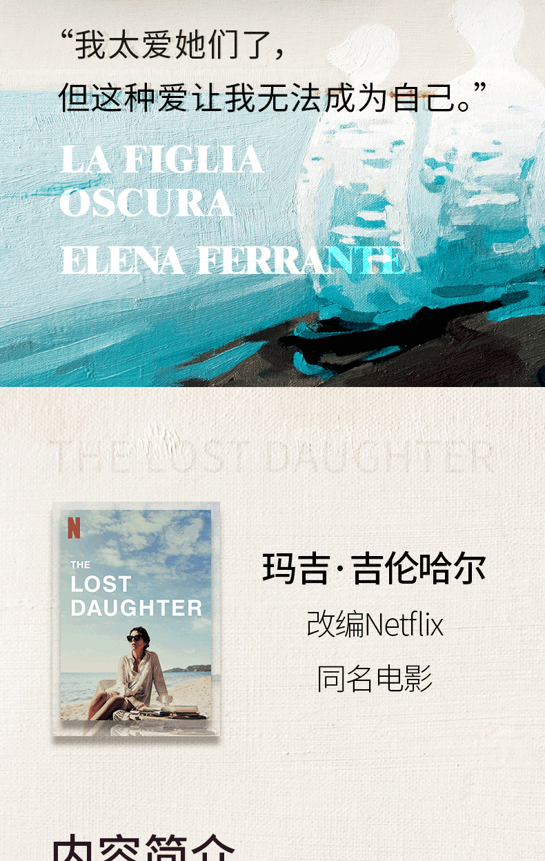 ★ 三年零三十六天 一个母亲的逃离和回归 ★ “我太爱她们了,但这种爱让我无法成为自己。” ★ 书写亲子关系的终极亲密和痛苦 经历了考验、痛彻心扉、活生生的母爱 ★ 如果没有经历这本书痛苦、纠结的写作,我后来也不会写出“那不勒斯四部曲”。——埃莱娜•费兰特 ★ Netflix联合著名导演玛吉•吉伦哈尔打造电影《暗处的女儿》(2021),影后奥利维亚•科尔曼、达科塔•约翰逊领衔主演,三项奥斯卡提名