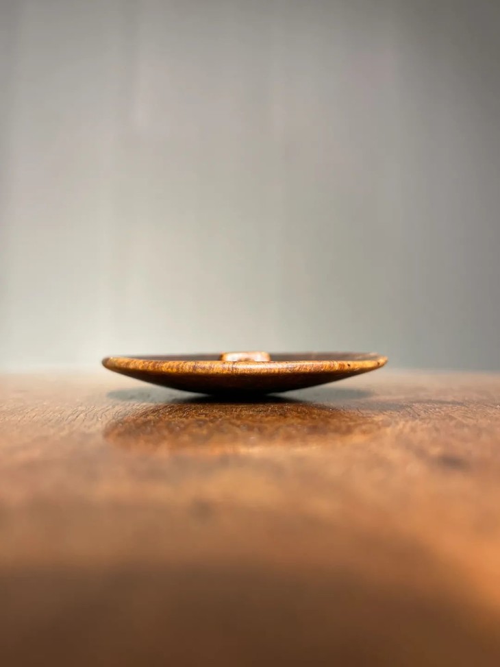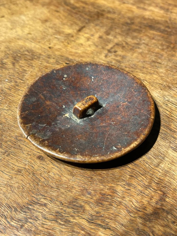 这是一只以樹瘤瘿木雕琢而成的大圆钮扣,瘿木是老树上长出来的大树切割琢磨的木材,树瘤就是树木在生长过程中,由于产生病变、虫害、或是外力伤害而长出瘤状异包的现象,这件大钮扣应是一件西式大衣的钮扣,以瘿木整木雕琢成树瘤獨立长成直径近八厘米的圆钮扣,正面圆弧素面,背面内凹雕琢一方型扣环,整块雕琢無併接。