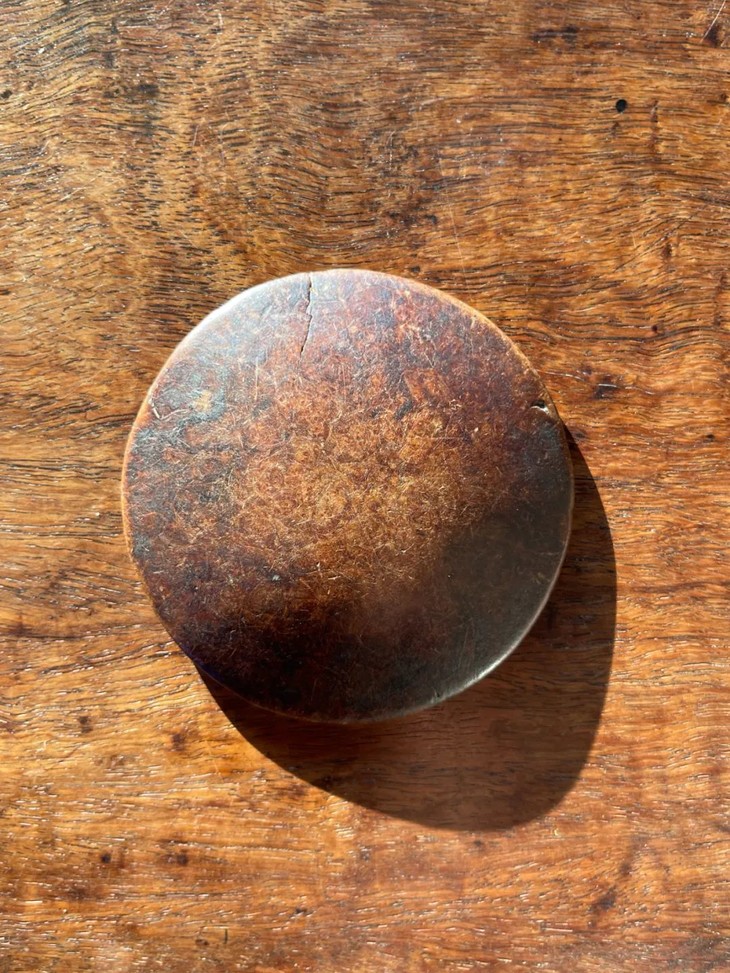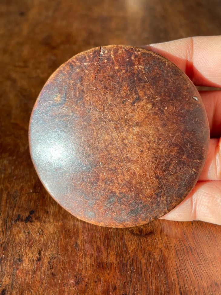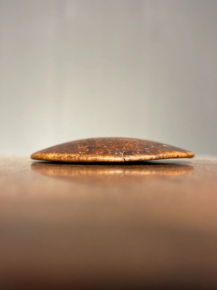 此瘿木雕琢大钮扣,如图所示有一条老裂痕与正常视用磨痕外,保持完美。