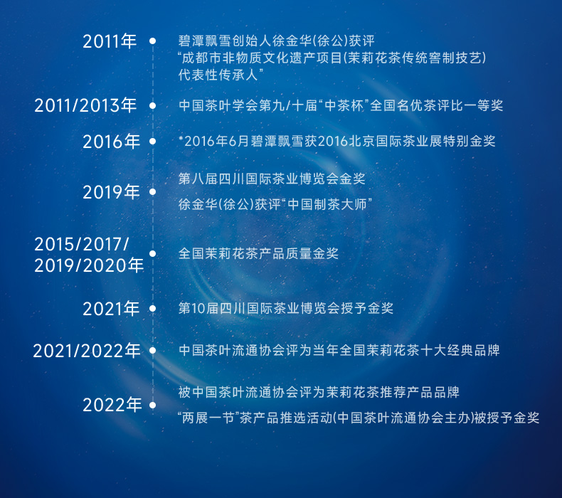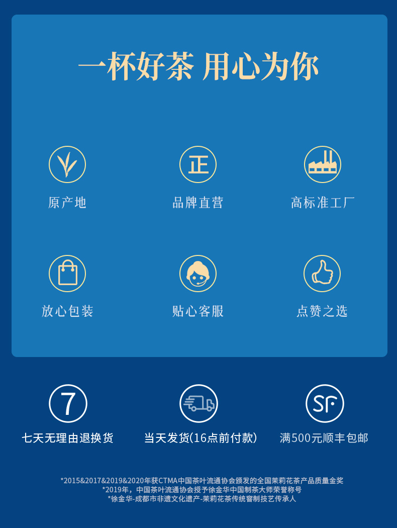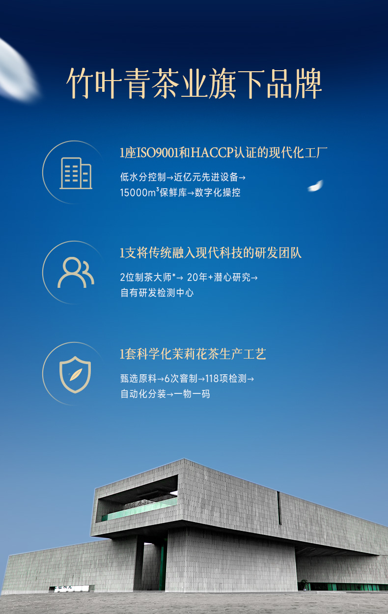 中国制茶大师徐金华(徐公)传承 古方制作技艺 开创新派茉莉花茶 精选峨眉高山明前春茶 配以广西横县双瓣茉莉 花与茶,黄金配比 时间酝酿,层层历练 花香与茶香交融 盖碗之间 仿佛茉莉花在舌尖绽放