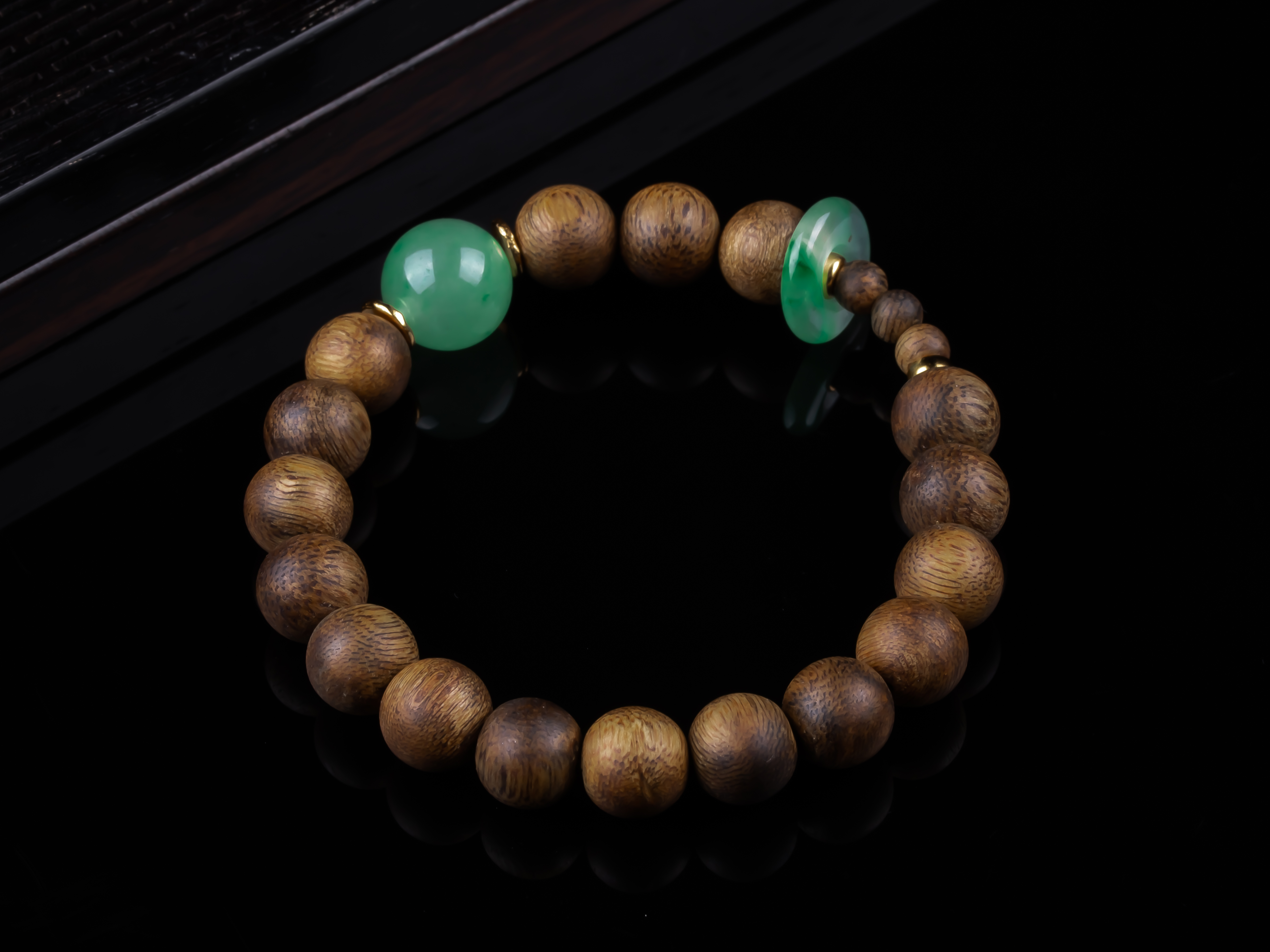 XY0211沉香+非洲翠手串.银,天然沉香9.3mm,原色原味,香味自然清甜,三颗非洲翠大珠子11.3mm,再搭一枚非洲翠的小跑环,冰冰的水头,飘花鲜美,款式大方又灵动可爱。