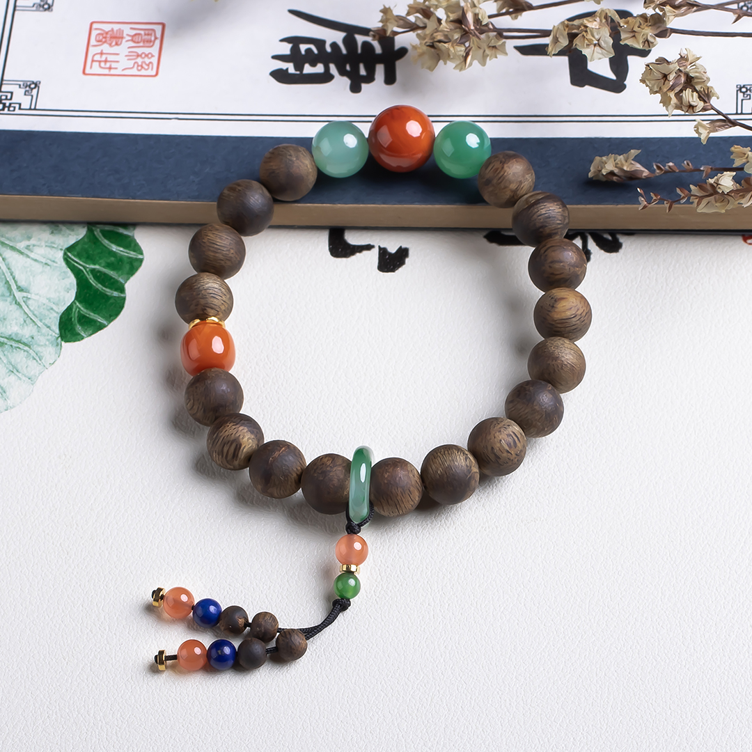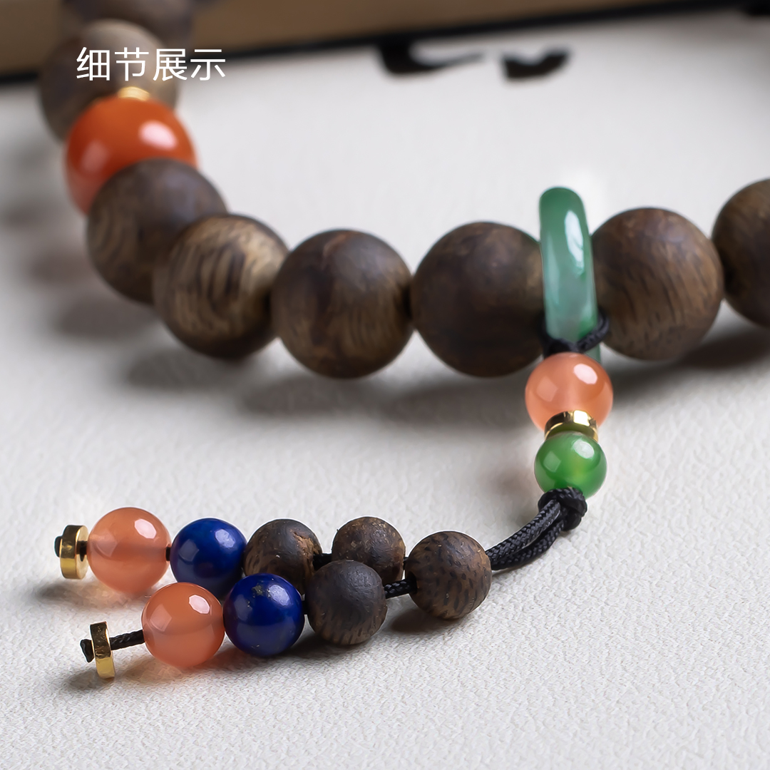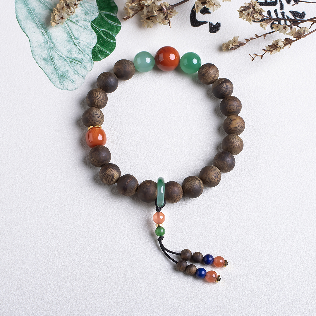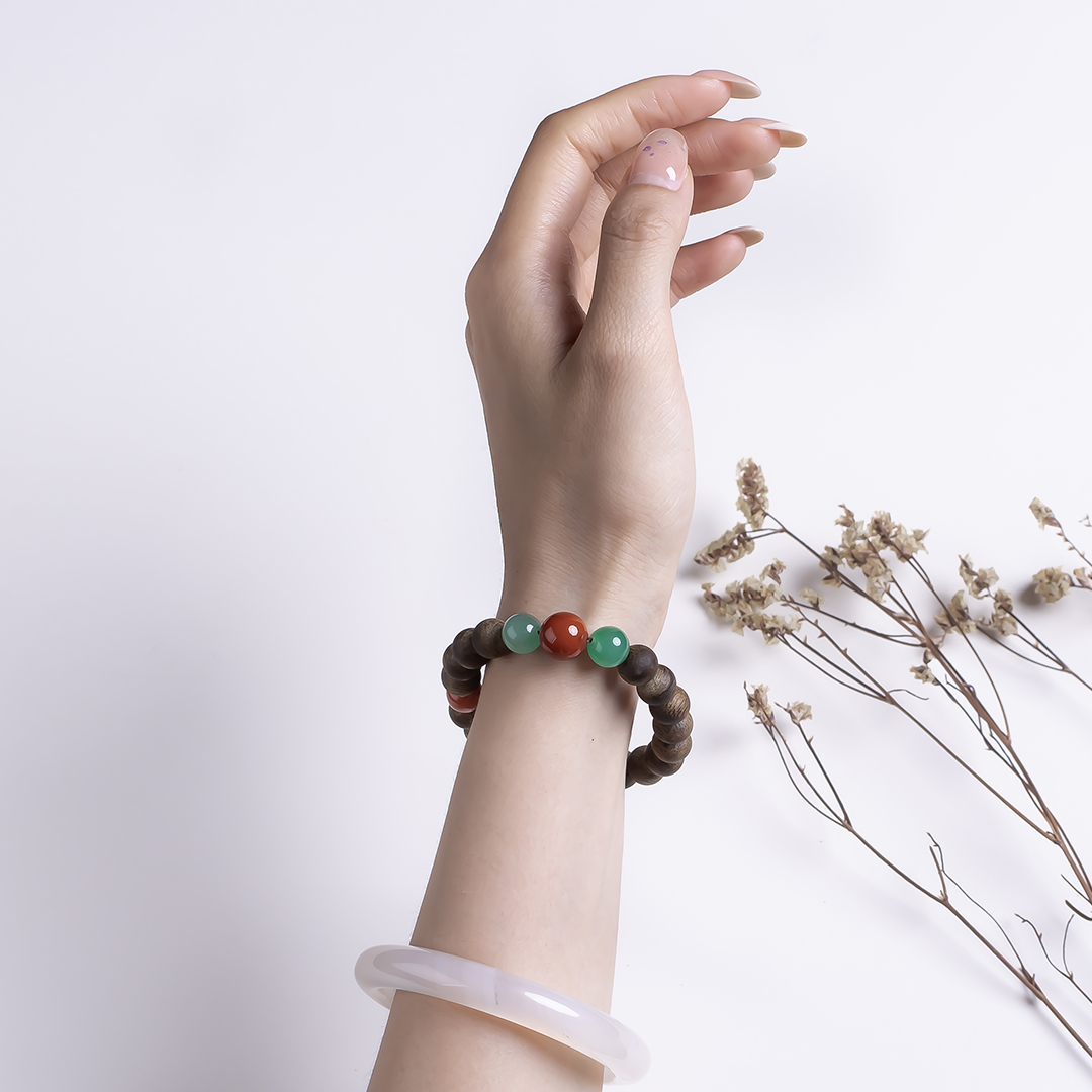 xy0526沉香+南红非洲翠手持手串.银,天然沉香约9mm,原色原味,香味自然清甜,满色肉南红搭冰飘花非洲翠, 国风款式,典雅时尚,静心养神。