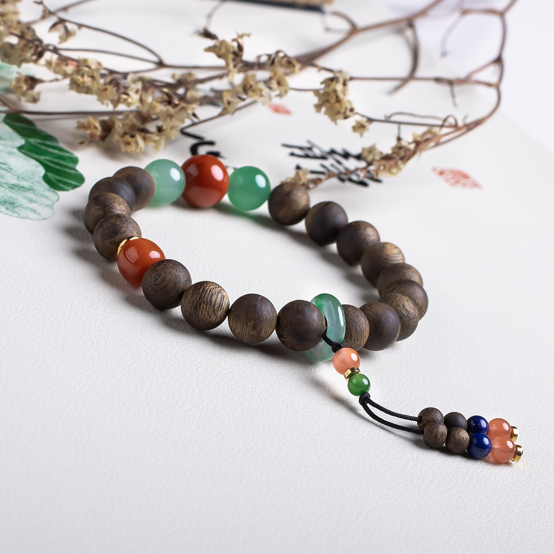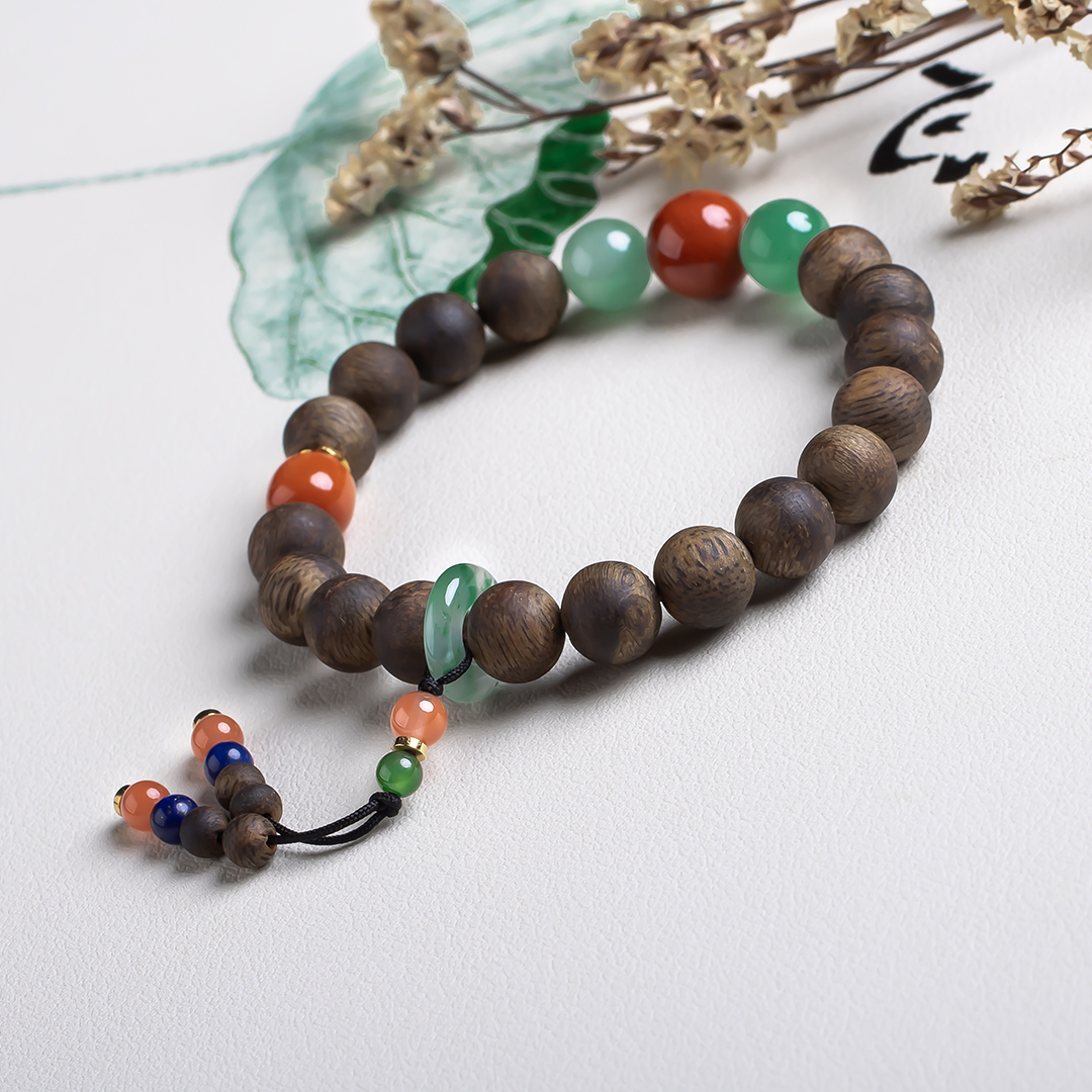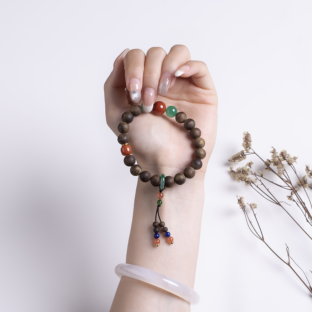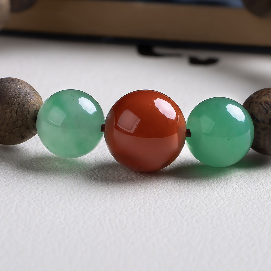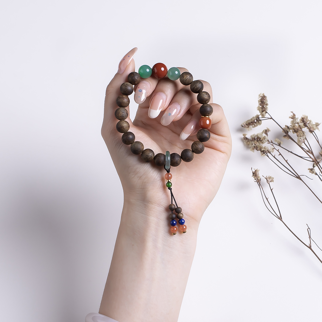 xy0526沉香+南红非洲翠手持手串.银,天然沉香约9mm,原色原味,香味自然清甜,满色肉南红搭冰飘花非洲翠, 国风款式,典雅时尚,静心养神。