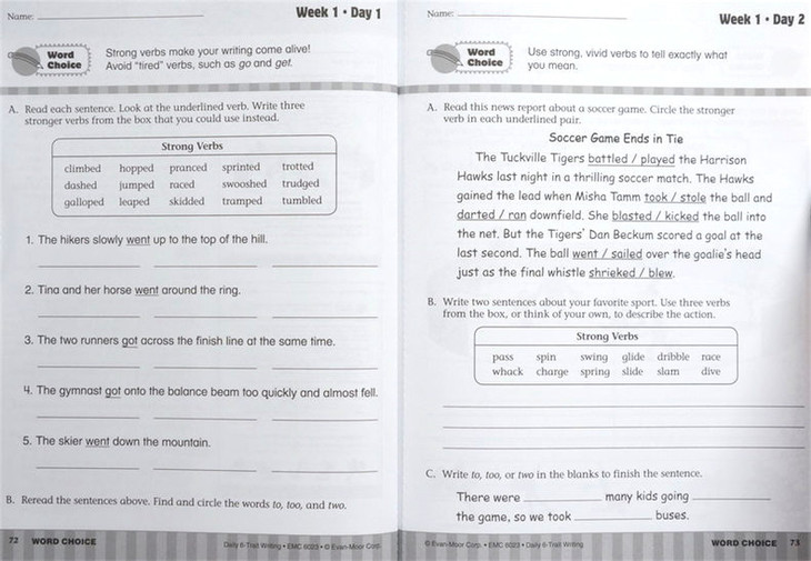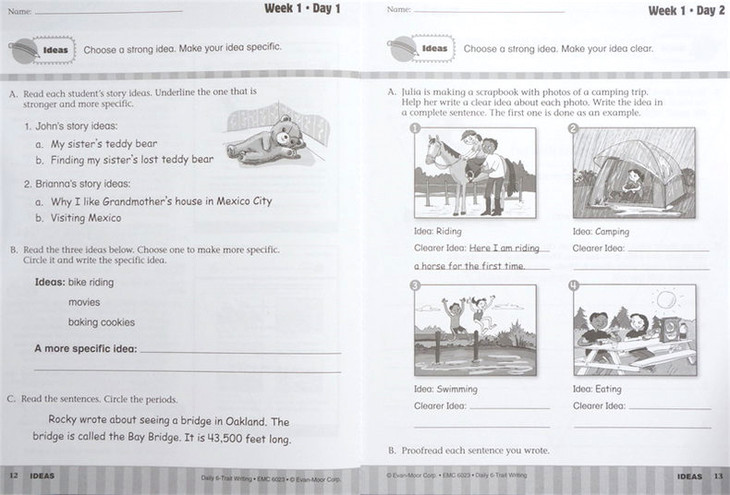 Evan-Moor Grade 3 Daily 6-Trait Writing Book features 125 engaging trait-based lessons, 10 to 15 min writing lessons and 25 weeks of instruction to help students develop writing skills. This book covers 6 traits namely ideas, organization, word choice, sentence fluency, voice and conventions. Each weekly unit includes teacher lesson plan, 4 reproducible student pages and writing prompt. These lessons ideally act as teachers rubric, model many forms of writing and supports any writing program.
