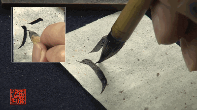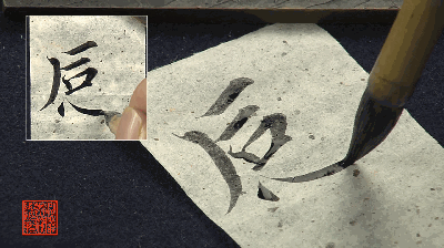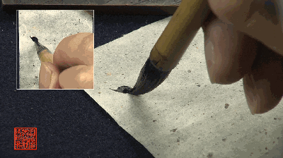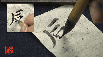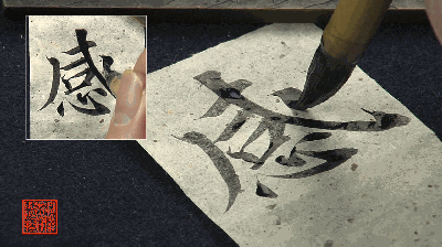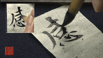 这个‘感’字第一笔要逆势顶峰,注意笔的弧度,这一撇下来后要接上下一笔横。这一笔竖画下来以后要向外转,然后把笔锋引出来,由细到粗,笔意连贯。—翁志飞